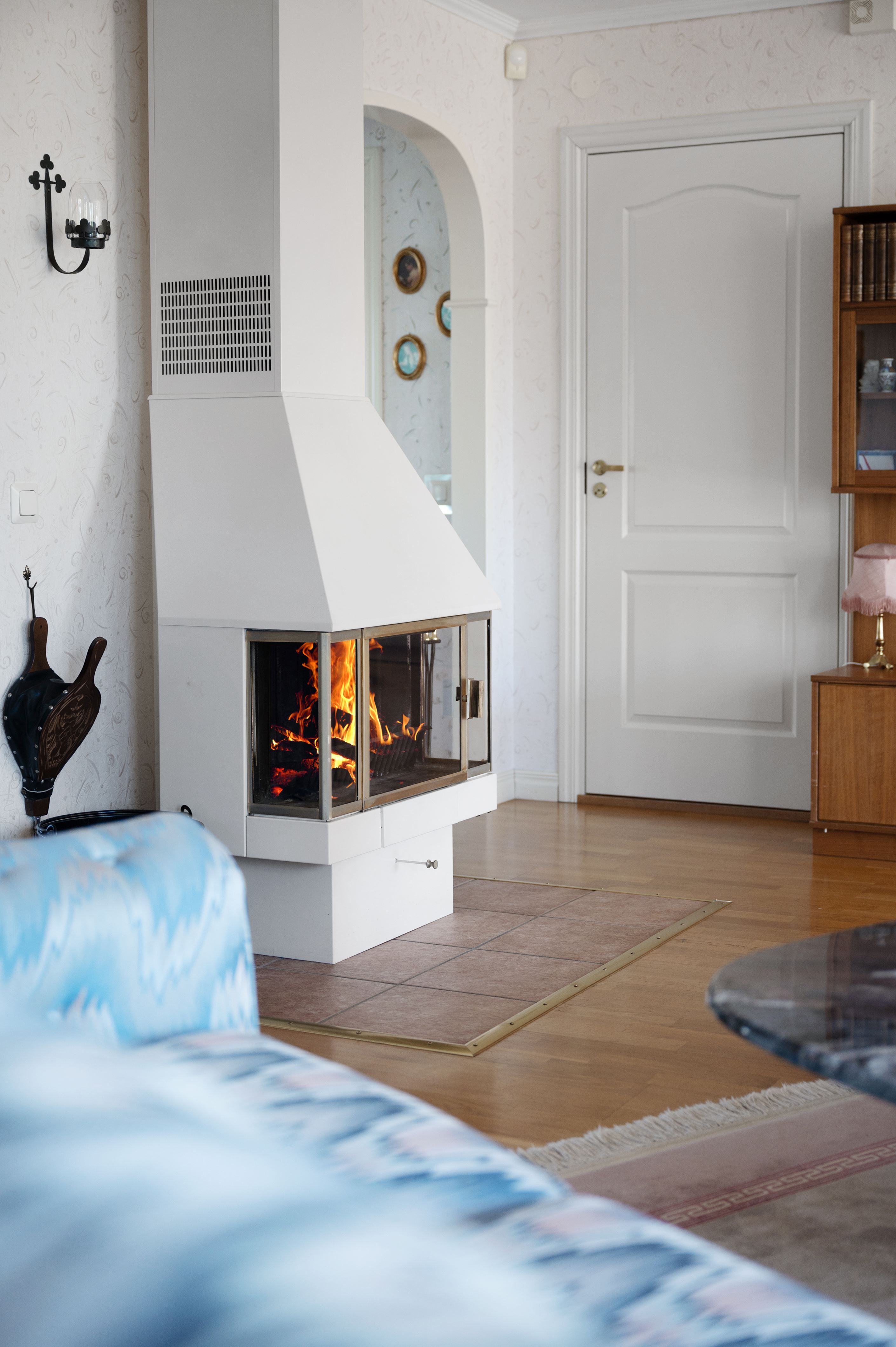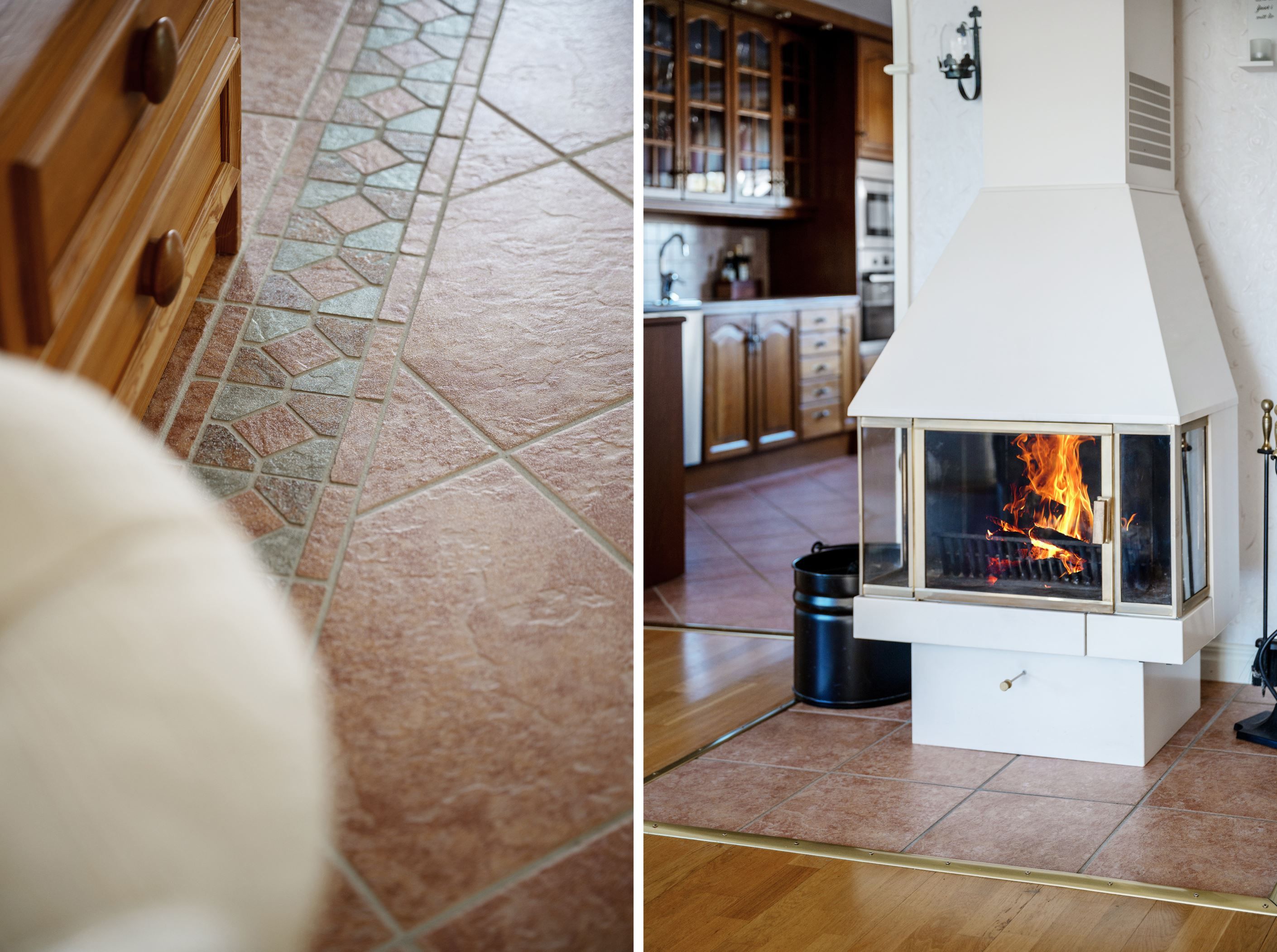 Vidare in i bostaden möter ett generöst vardagsrum i vinkel om cirka 42 kvm. Stora fönsterpartier skapar ett fint ljusflöde och ger rummet en luftig och öppen karaktär. Här finns även en braskamin som tillför både värme och en ombonad känsla. Från vardagsrummet nås terrassen, vilket ger en fin koppling mellan inne- och utemiljö.