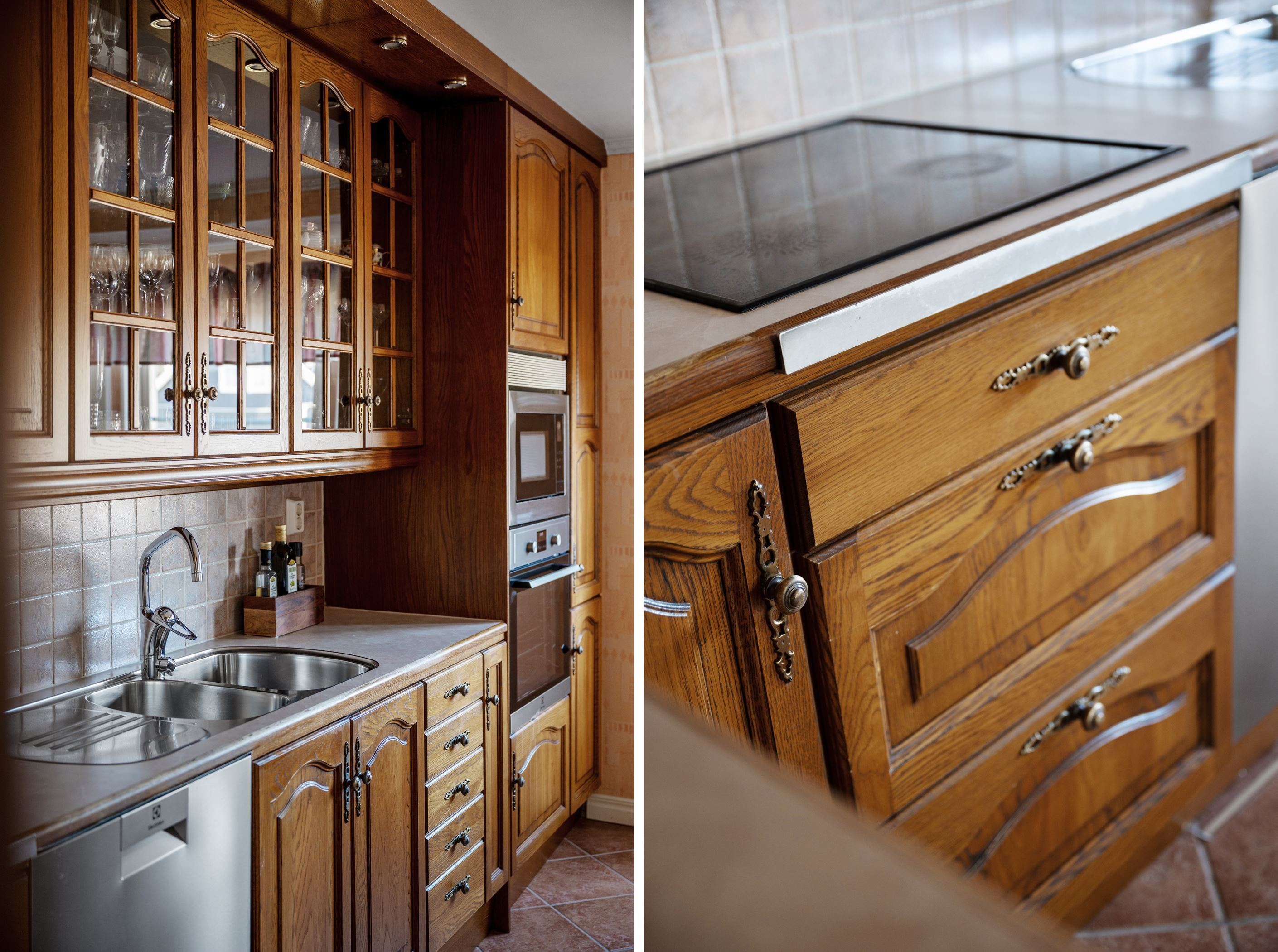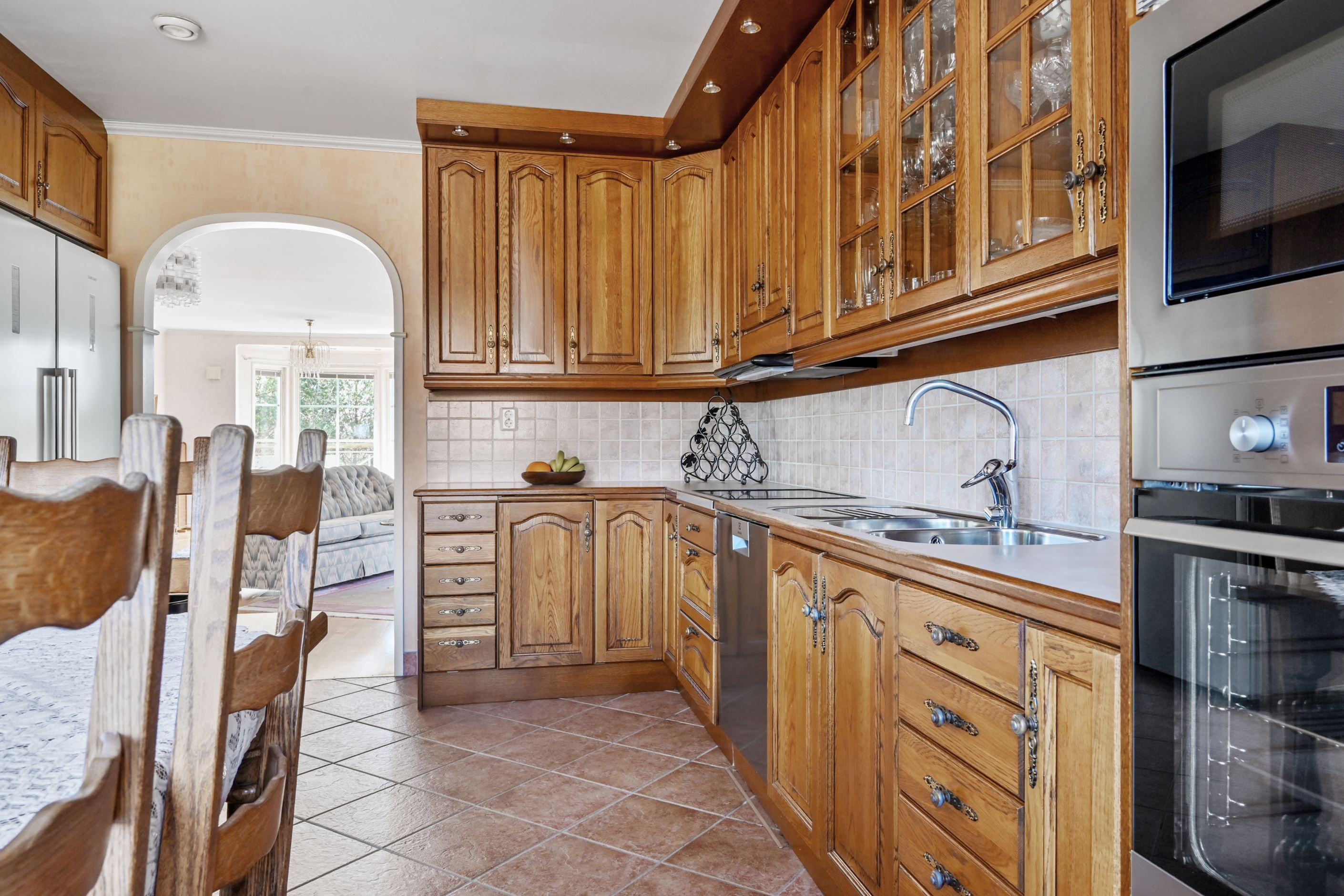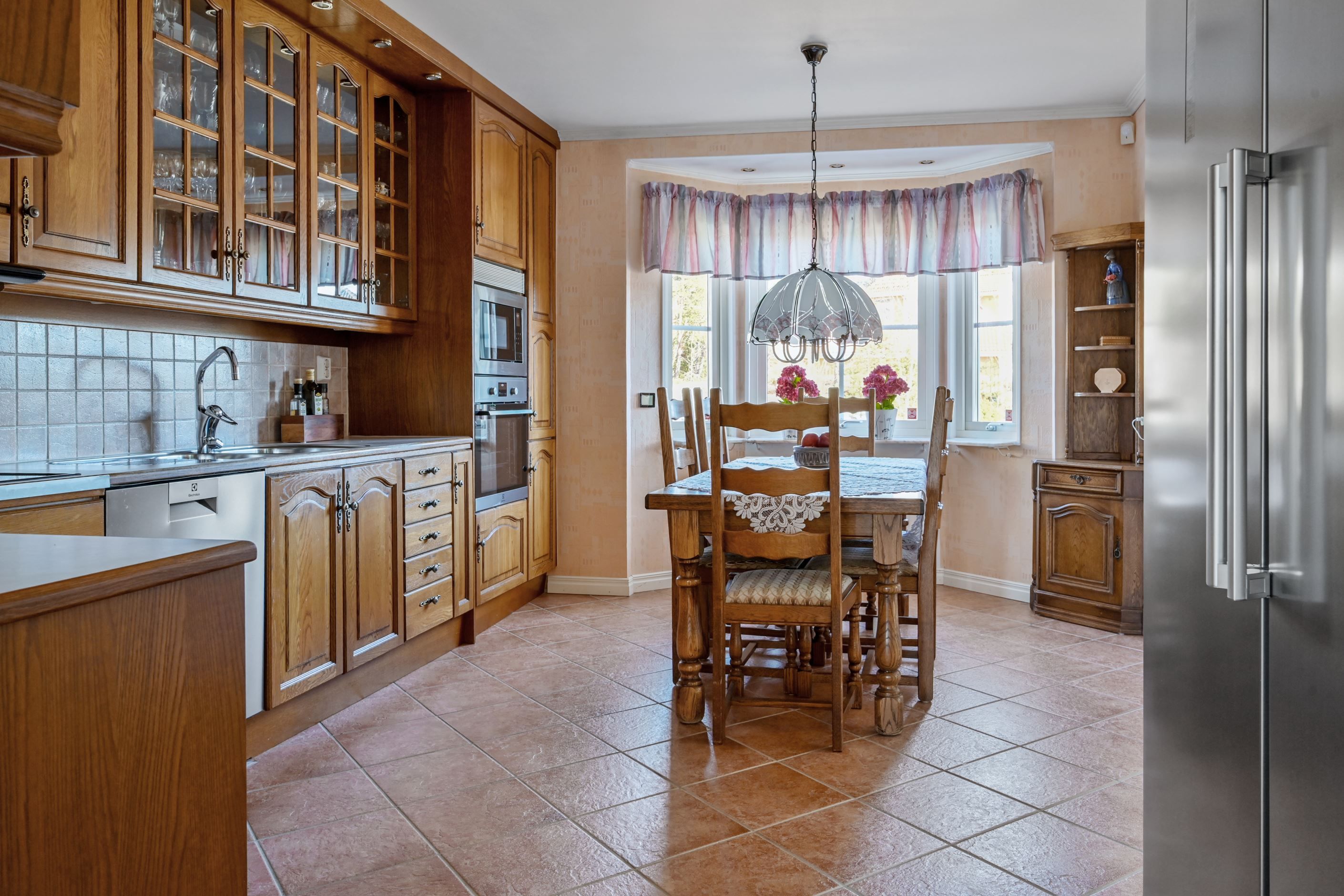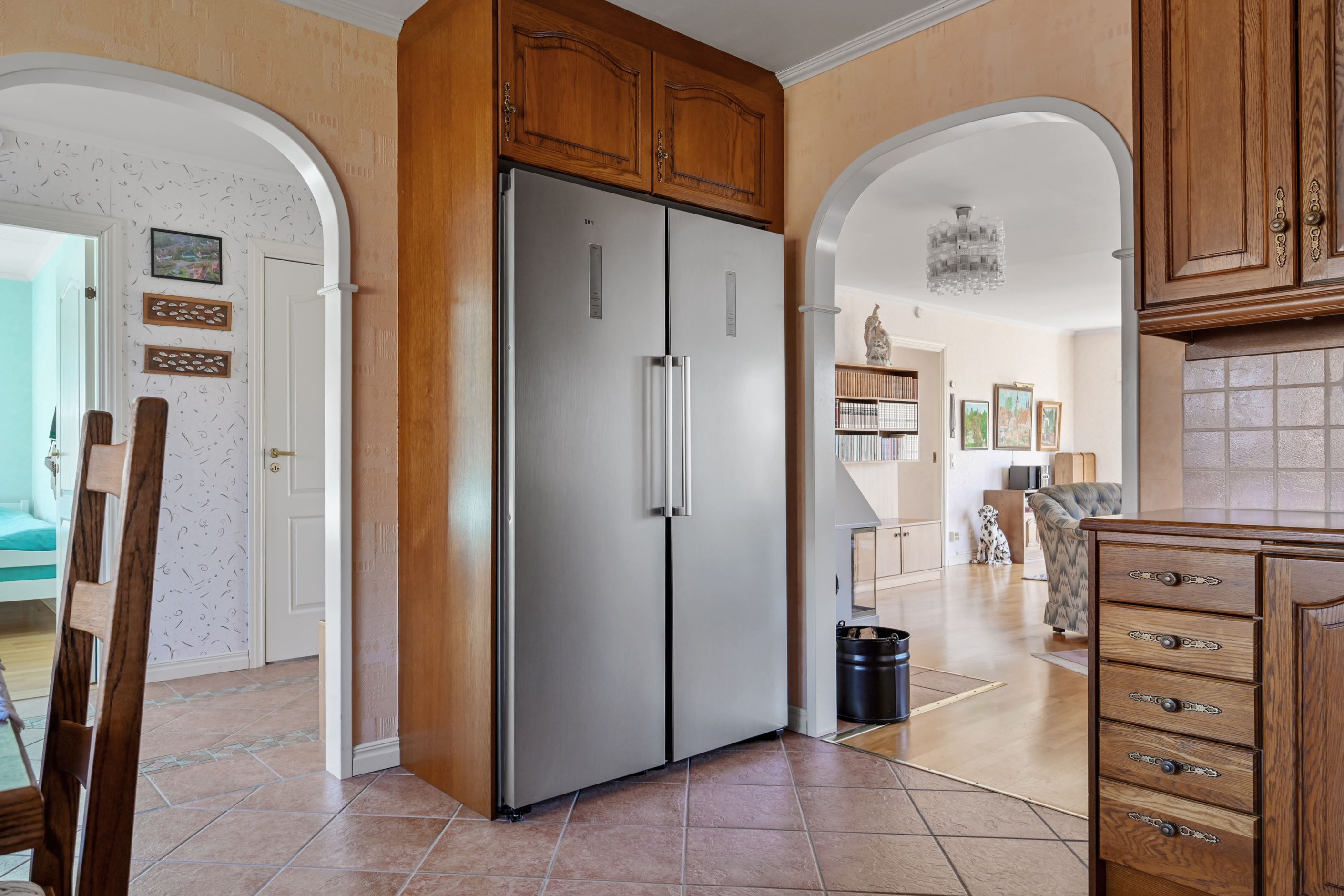 Invändigt möts man av en välkomnande och rymlig hall med slitstarkt klinkergolv och goda avhängningsmöjligheter. Planlösningen är genomtänkt och funktionell, där varje yta nyttjas på ett naturligt sätt. Direkt till vänster ligger ett av husets sovrum om cirka 10 kvm, med fönster i två väderstreck som ger ett behagligt ljusinsläpp. Till höger om hallen öppnar sig det trivsamma köket med matplats i burspråk – en ljus och inbjudande del av huset. Köket är utrustat med fullstor kyl och frys, diskmaskin, varmluftsugn, mikrovågsugn, spishäll och fläkt. De massiva träluckorna ger en gedigen känsla och erbjuder möjlighet till uppdatering för den som önskar sätta sin egen prägel.