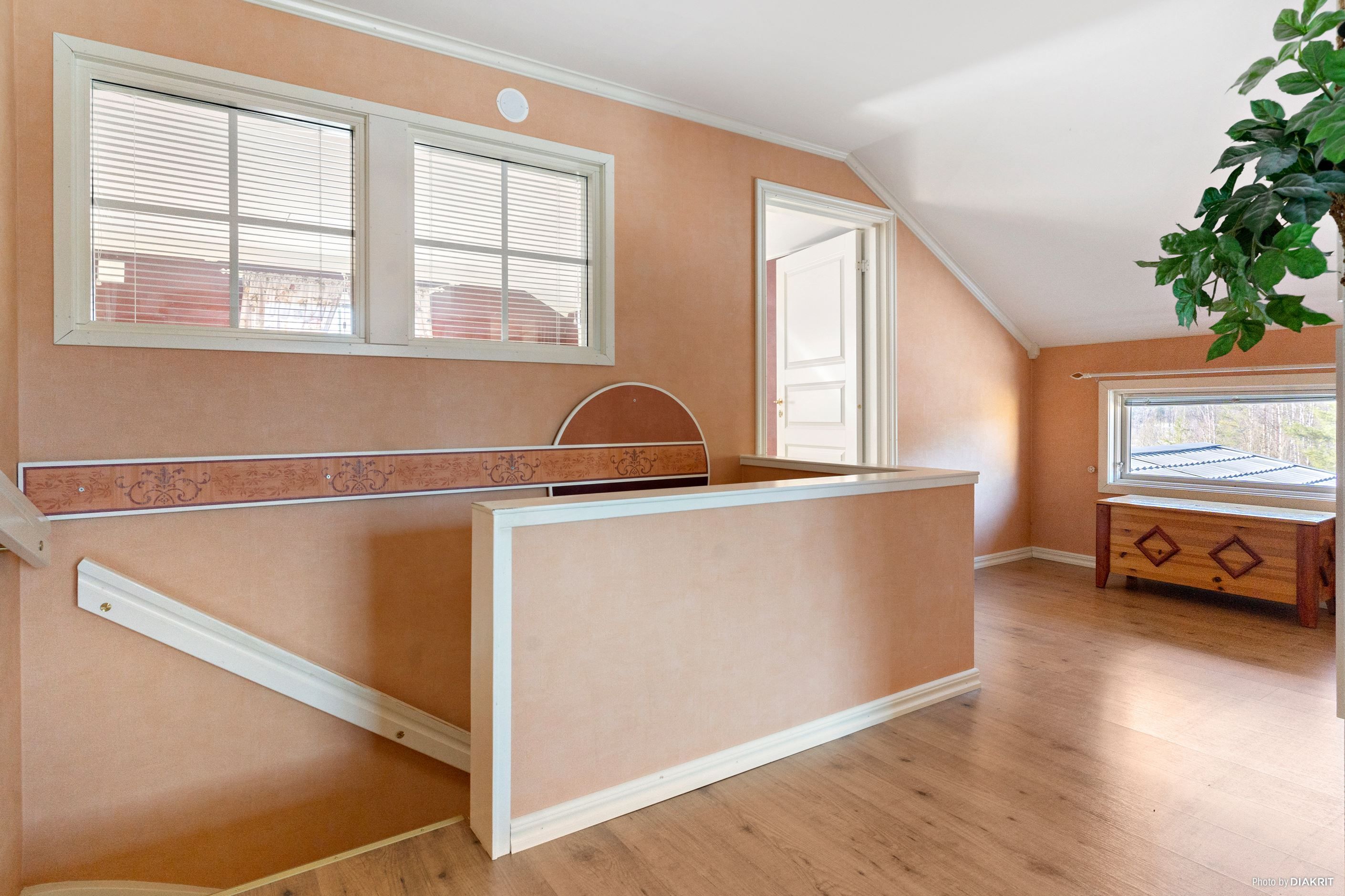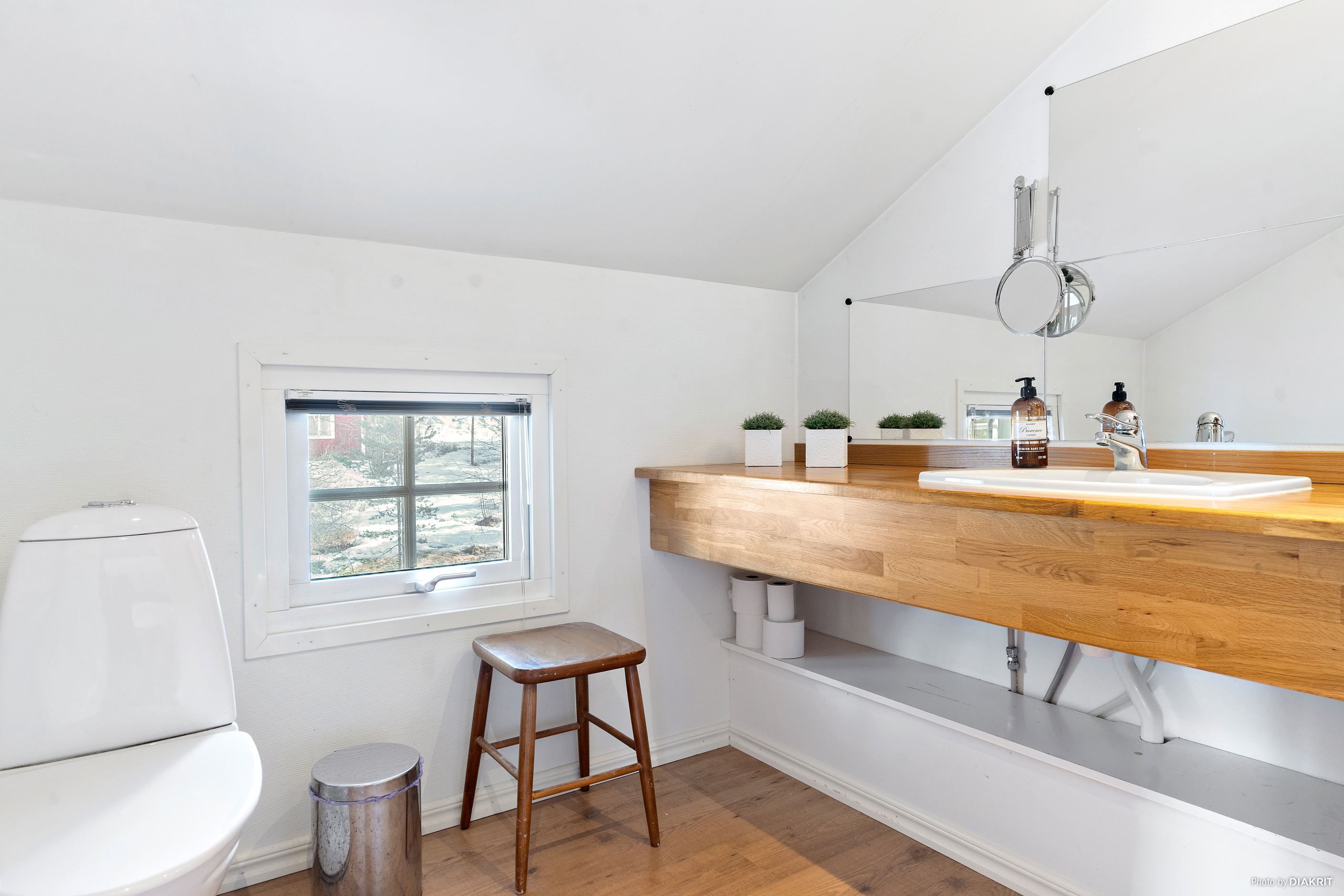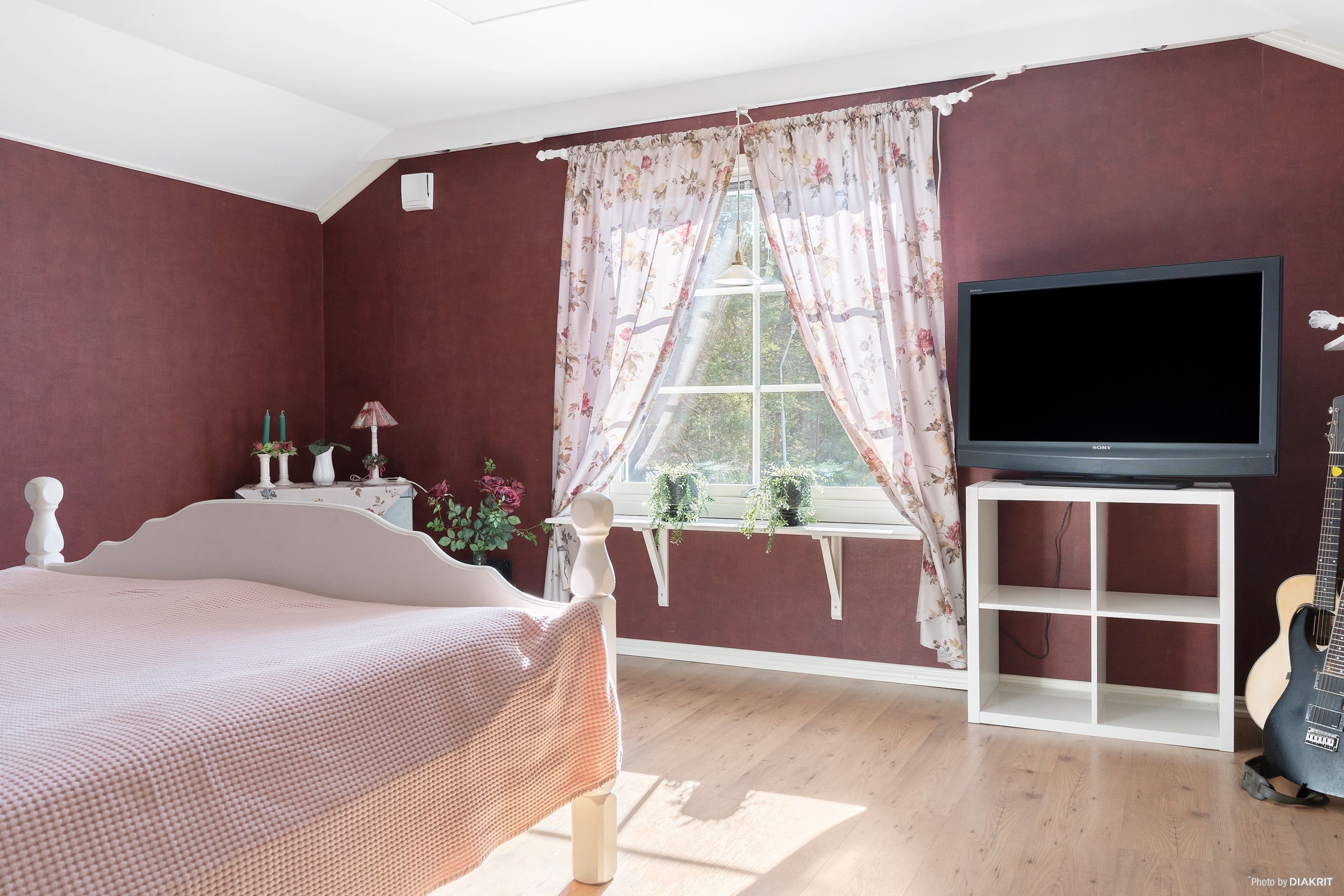 På övre plan ligger vardagsrummet som har fönster i två riktningar vilka bidrar med fina ljusinsläpp. Intill ligger även sovrum 2, som är rymligt och har två kattvindor med förvaringsutrymme.