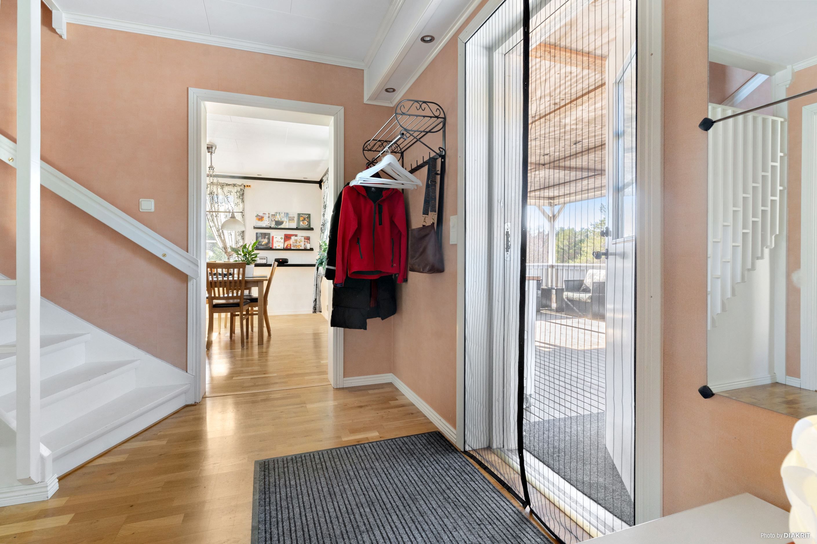 Här välkomnas man till entré/hall på entréplanet, som nås från den upphöjda altanen under tak. Intill hallen ligger köket. Köket är ett Marbodal-kök i trä. Köket är även utrustat med kyl, frys, diskmaskin, köksö med induktionshäll, fläkt och ugn. På entréplanet finner man även sovrum 1 som har vita, tapetserade väggar, en fondvägg, klickgolv och garderob med skjutdörrar.