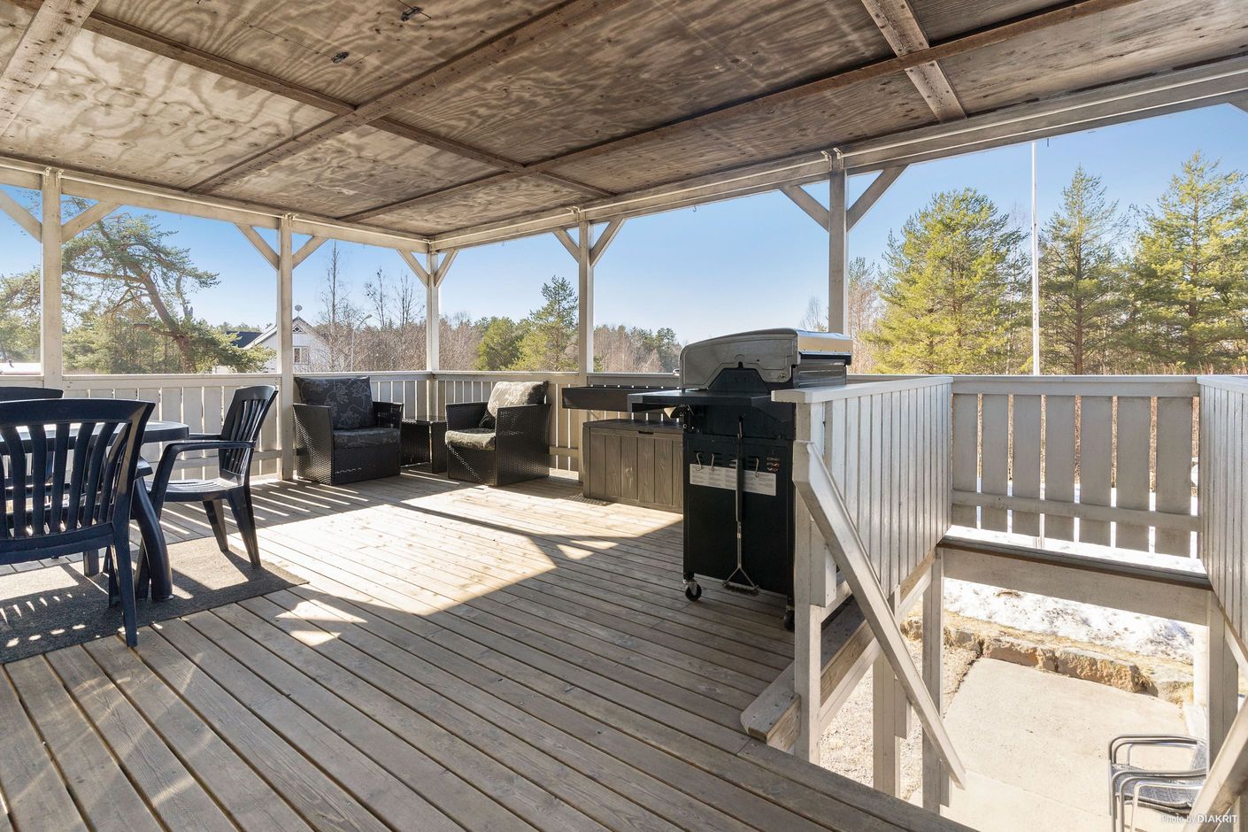 Förutom den upphöjda altanen under tak finns även ytterligare en altan som ligger intill i markplan precis intill husknuten.
