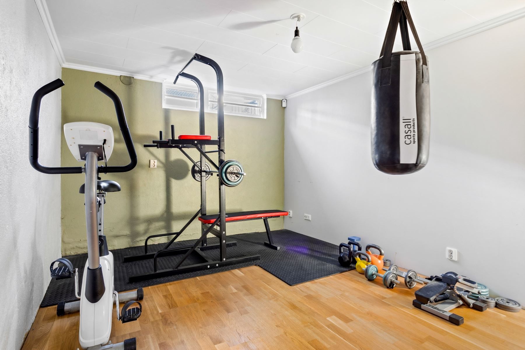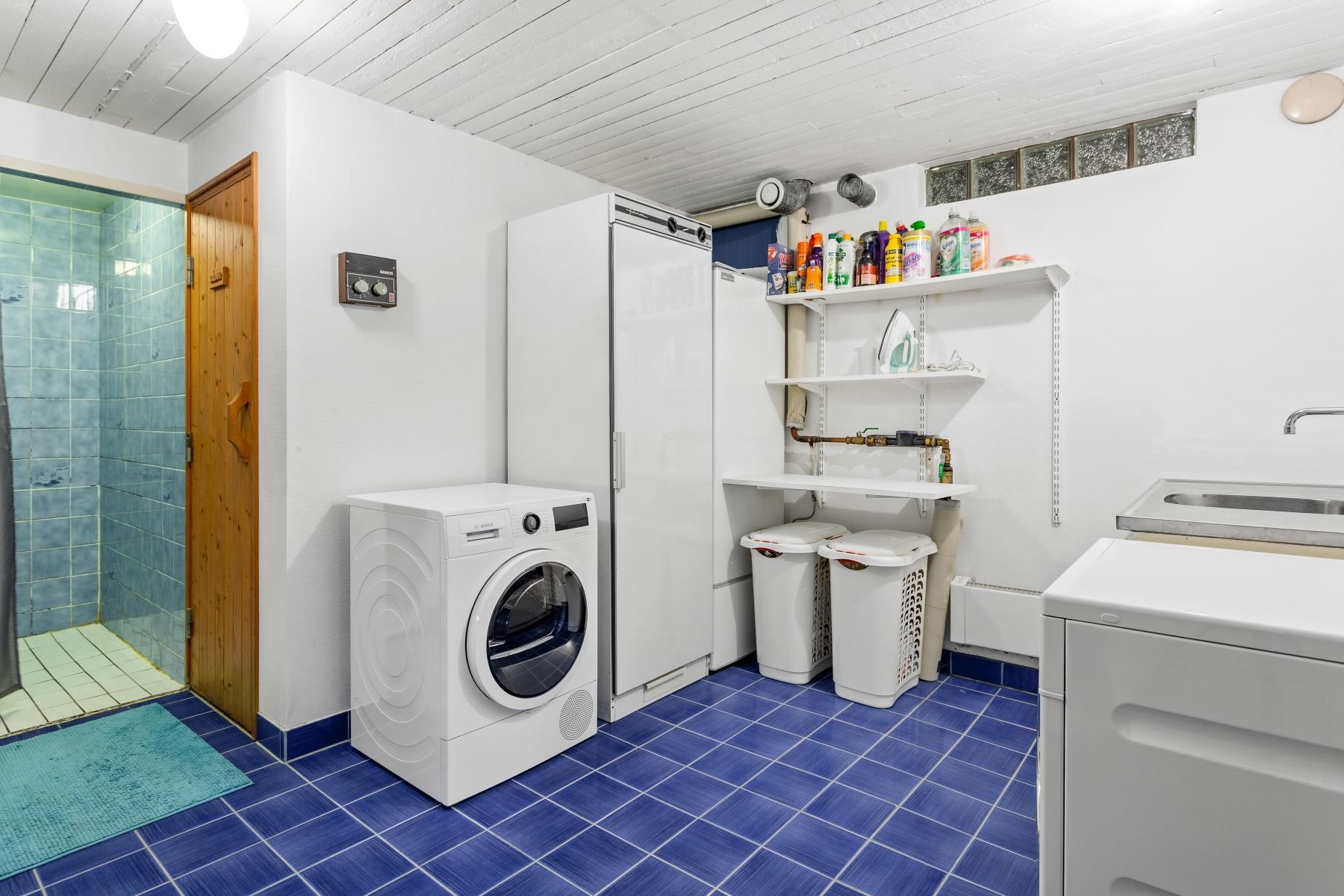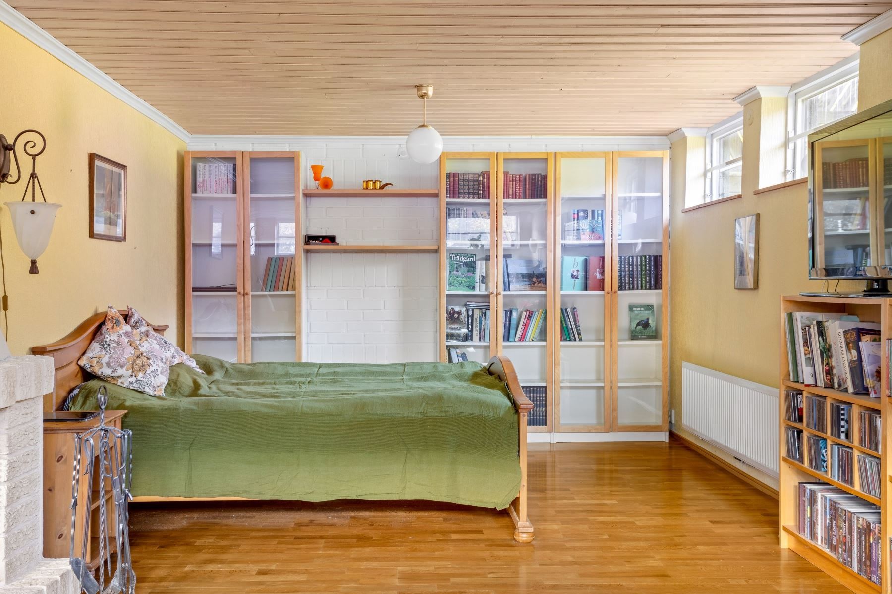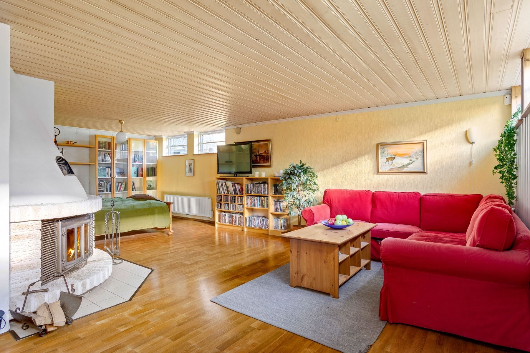 Källarplanet med en rymlig gillestuga med stor braskamin som idag används som sovrum, stor tvättstuga samt bastu och dusch - perfekt som egen relaxavdelning eller ungdomsdel!
