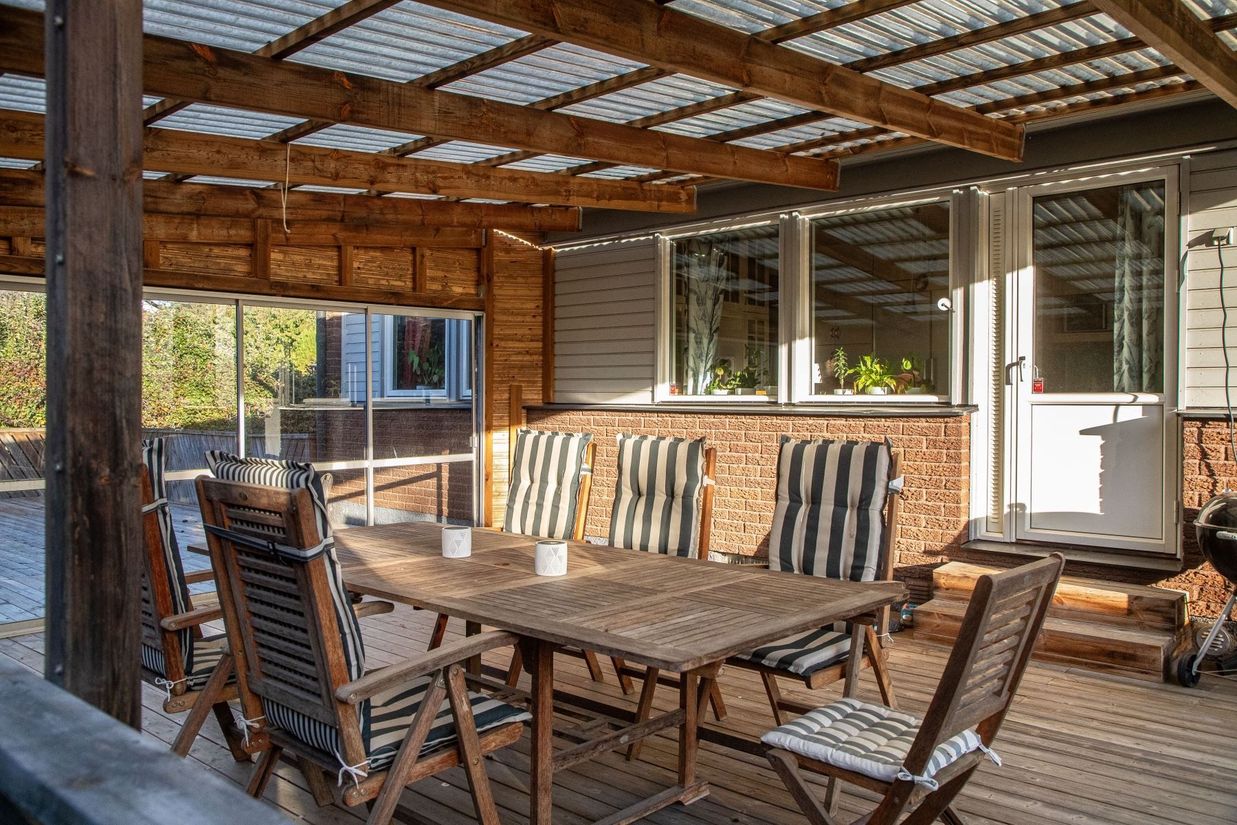 Entréplanet möter dig med en öppen och välkomnande hall som leder vidare till ett stort och ljust vardagsrum och matplats - perfekt för både familjeliv och sociala tillställningar. Det fullutrustade köket har utgång till en altan med tak, där du kan njuta av sena sommarkvällar i lugn och ro. Altanen är precis utbyggd 2025.