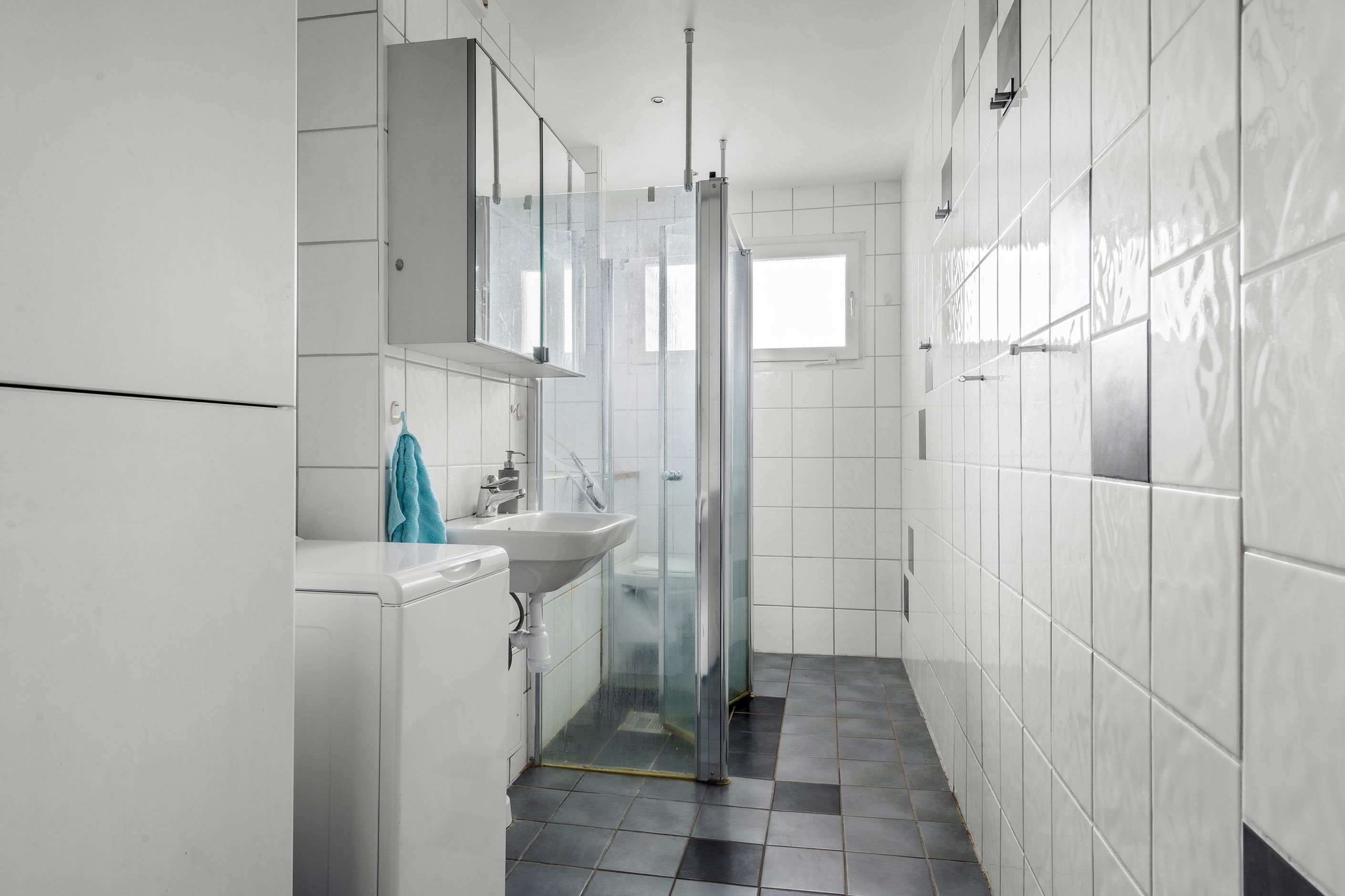 - Helkaklat badrum med dusch, toalett, handfat, kommod, spegel och vädringsfönster.