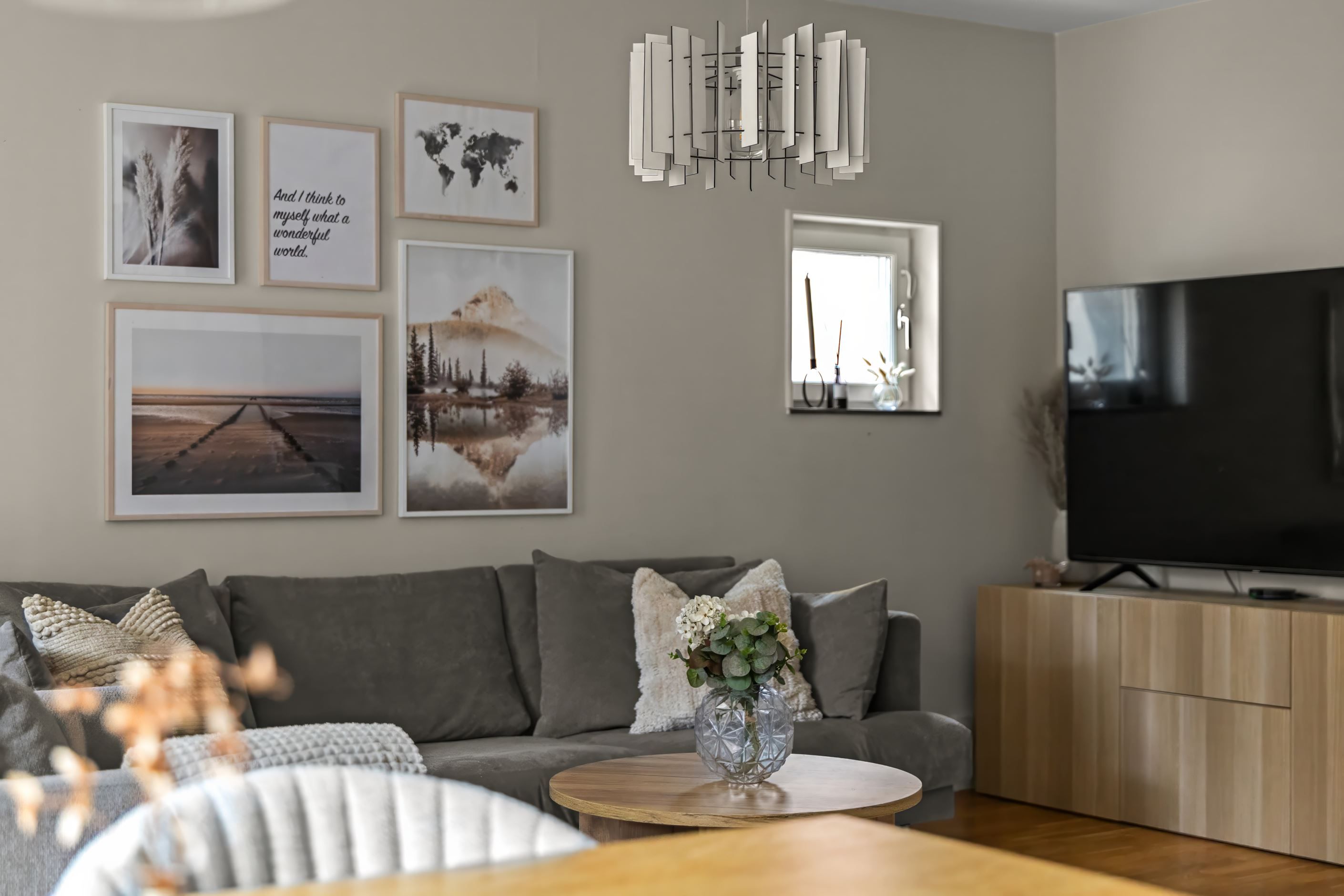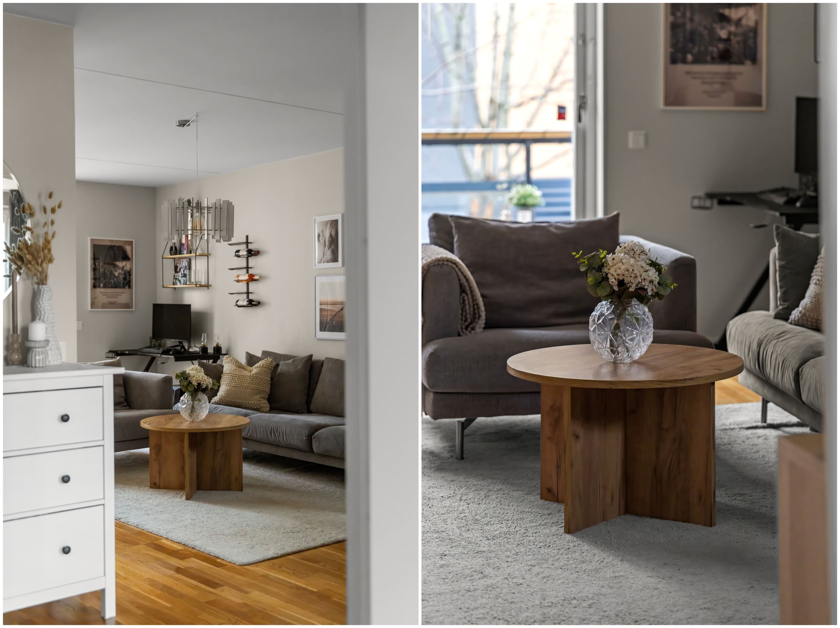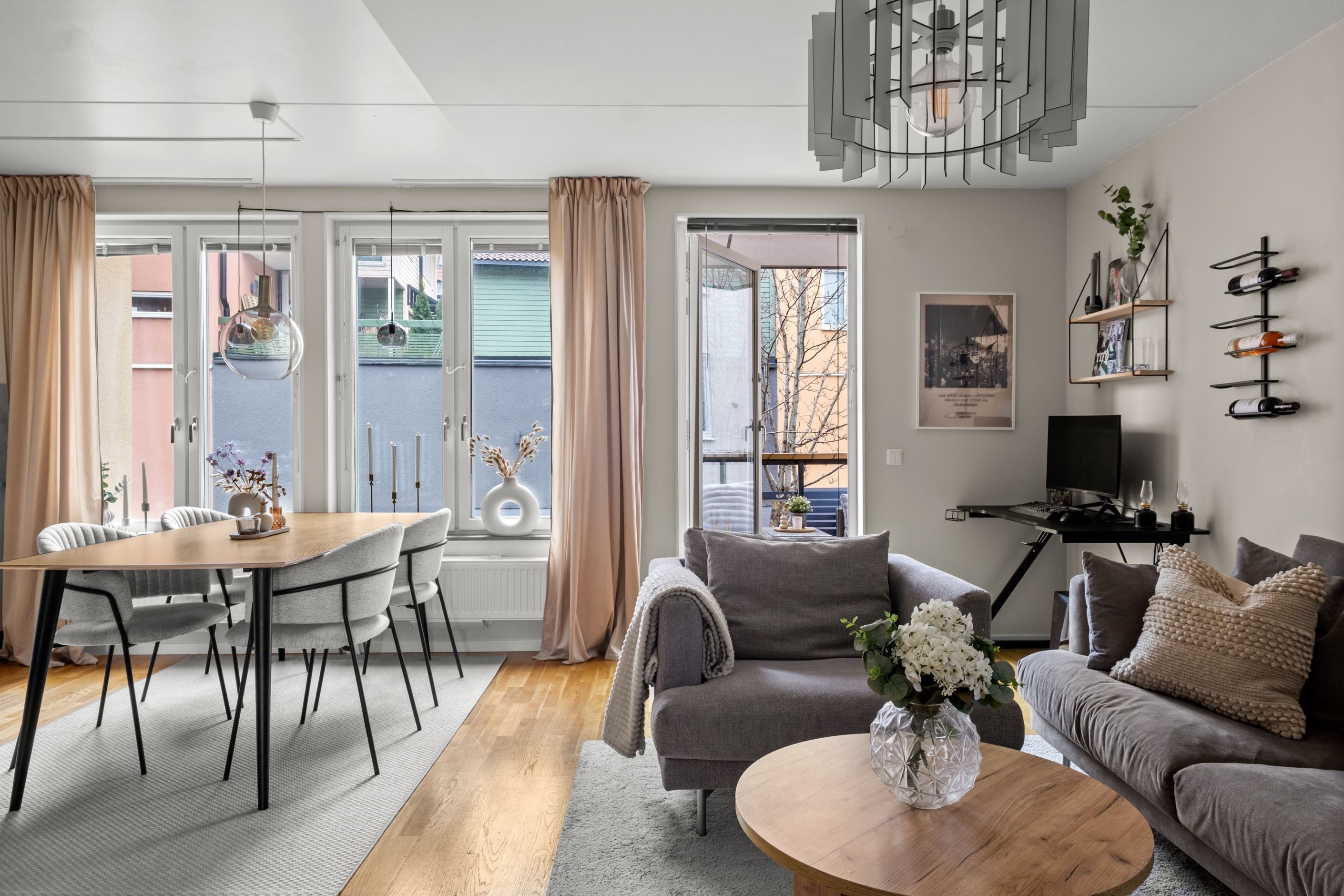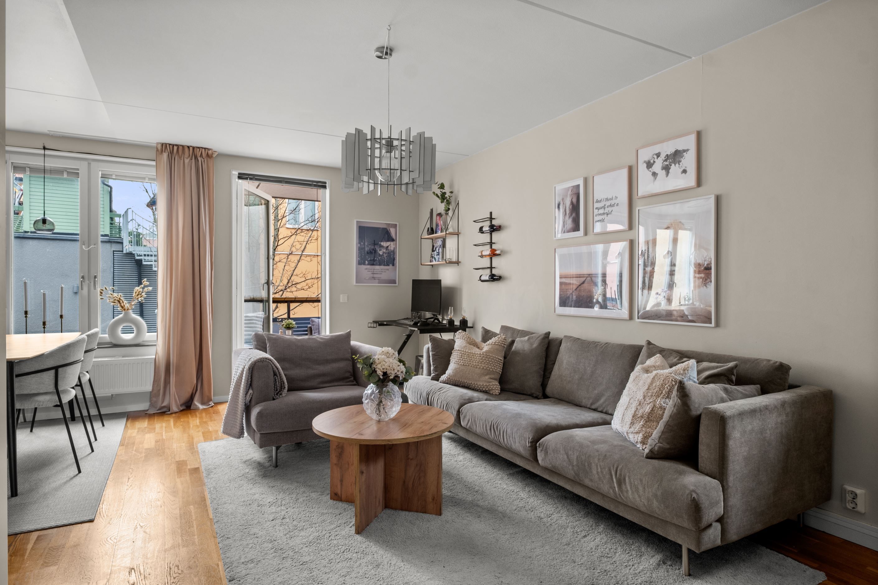 Vardagsrummet är lättmöblerat och rymmer både soffgrupp och övrigt möblemang. Härifrån nås bostadens balkong i soligt söderläge, en perfekt plats för avkoppling, odling eller en kopp kaffe i solen.