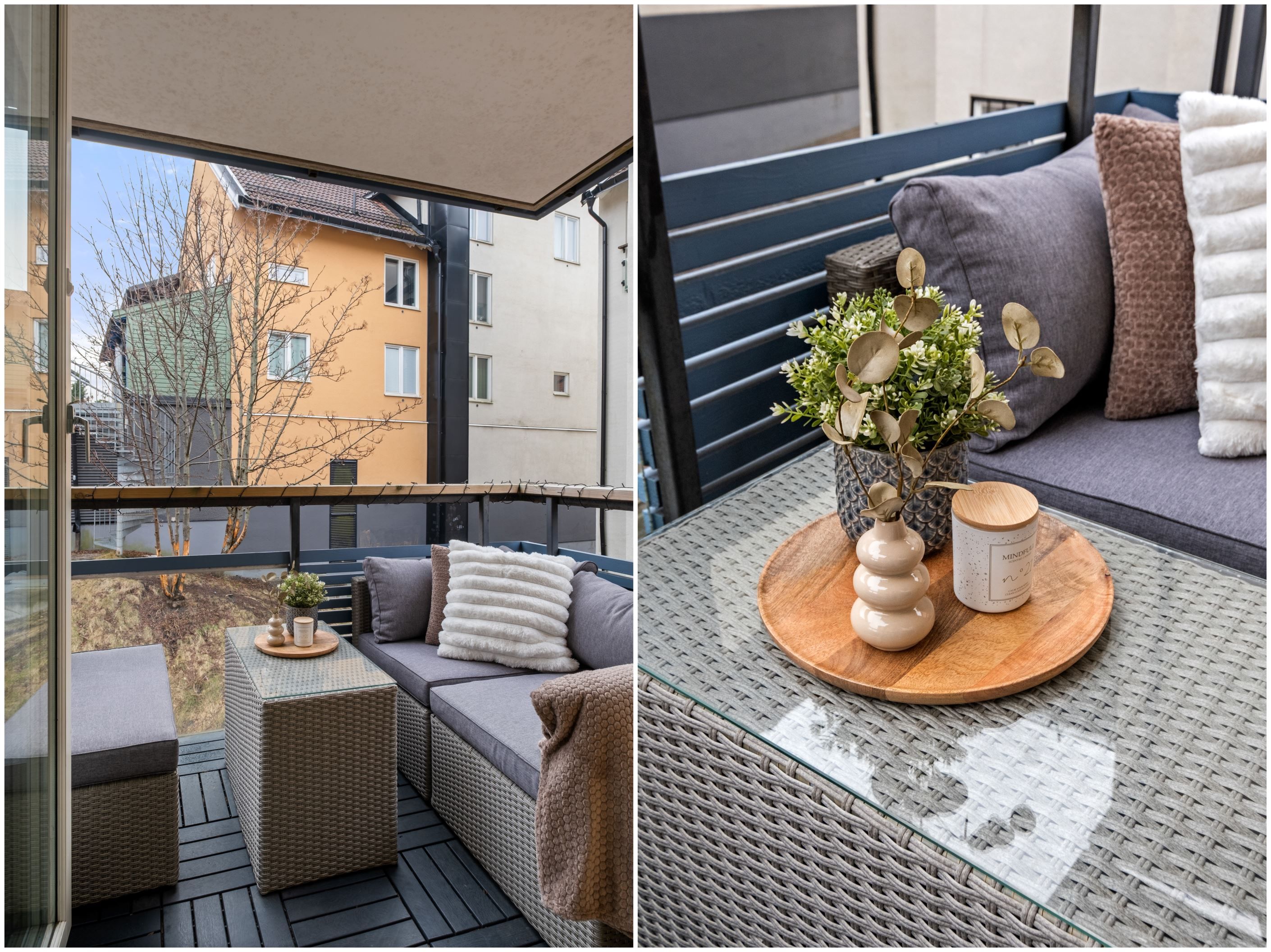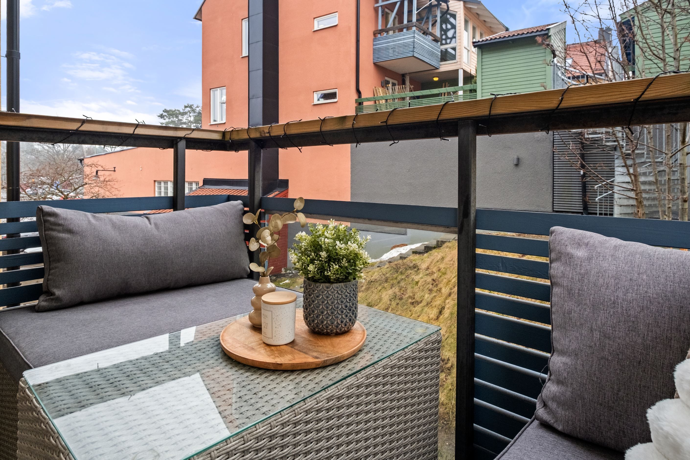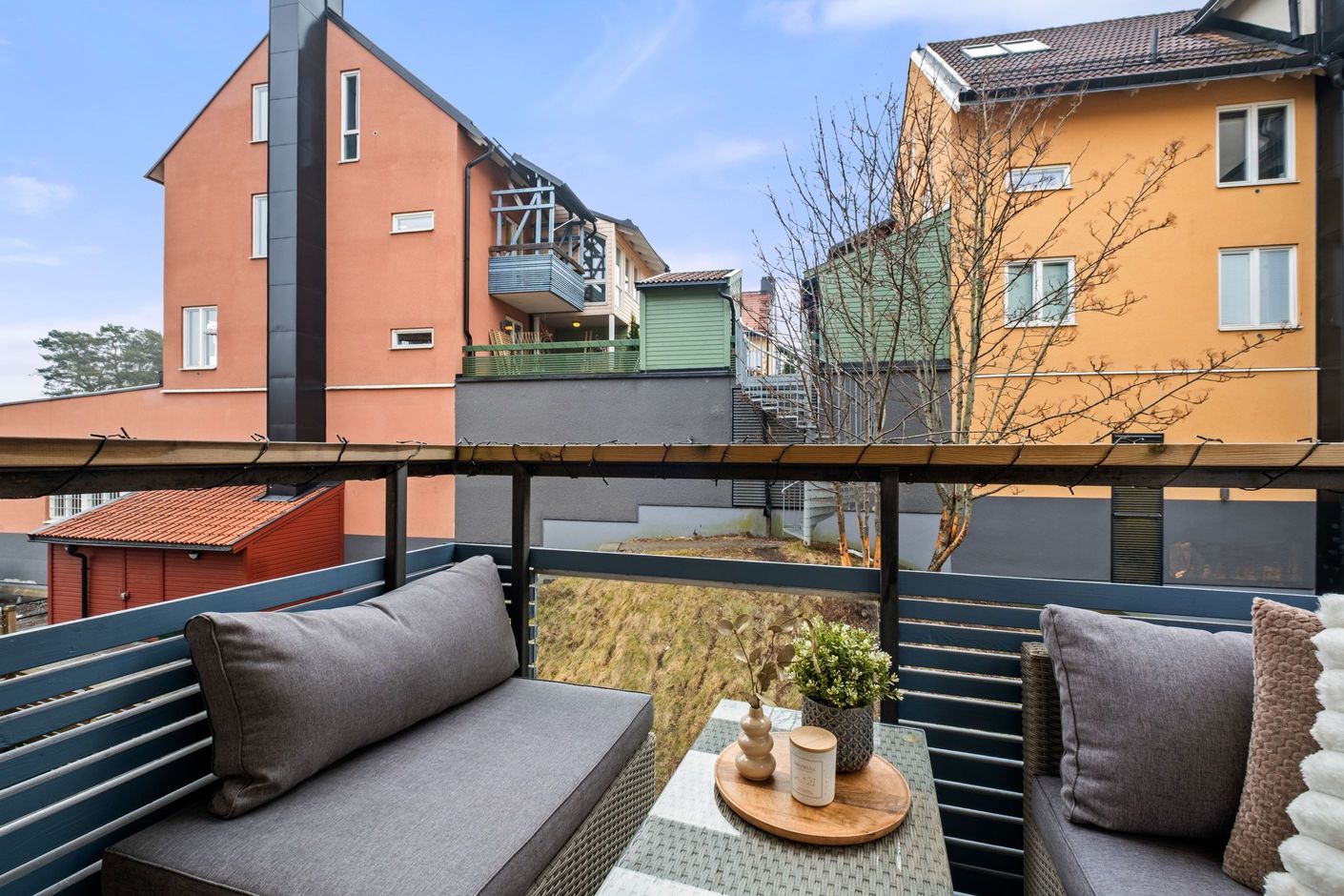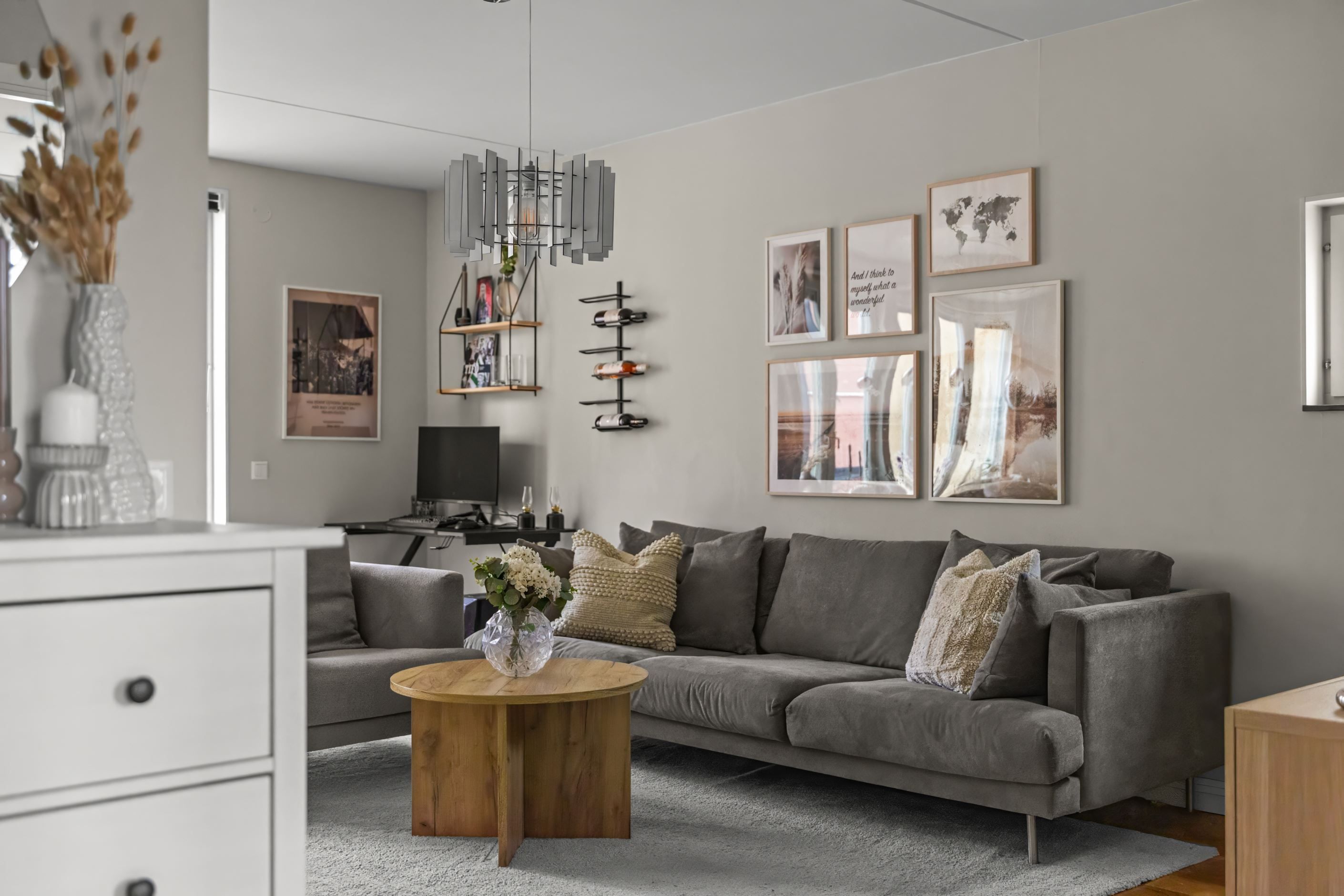 Vardagsrummet är lättmöblerat och rymmer både soffgrupp och övrigt möblemang. Härifrån nås bostadens balkong i soligt söderläge, en perfekt plats för avkoppling, odling eller en kopp kaffe i solen.