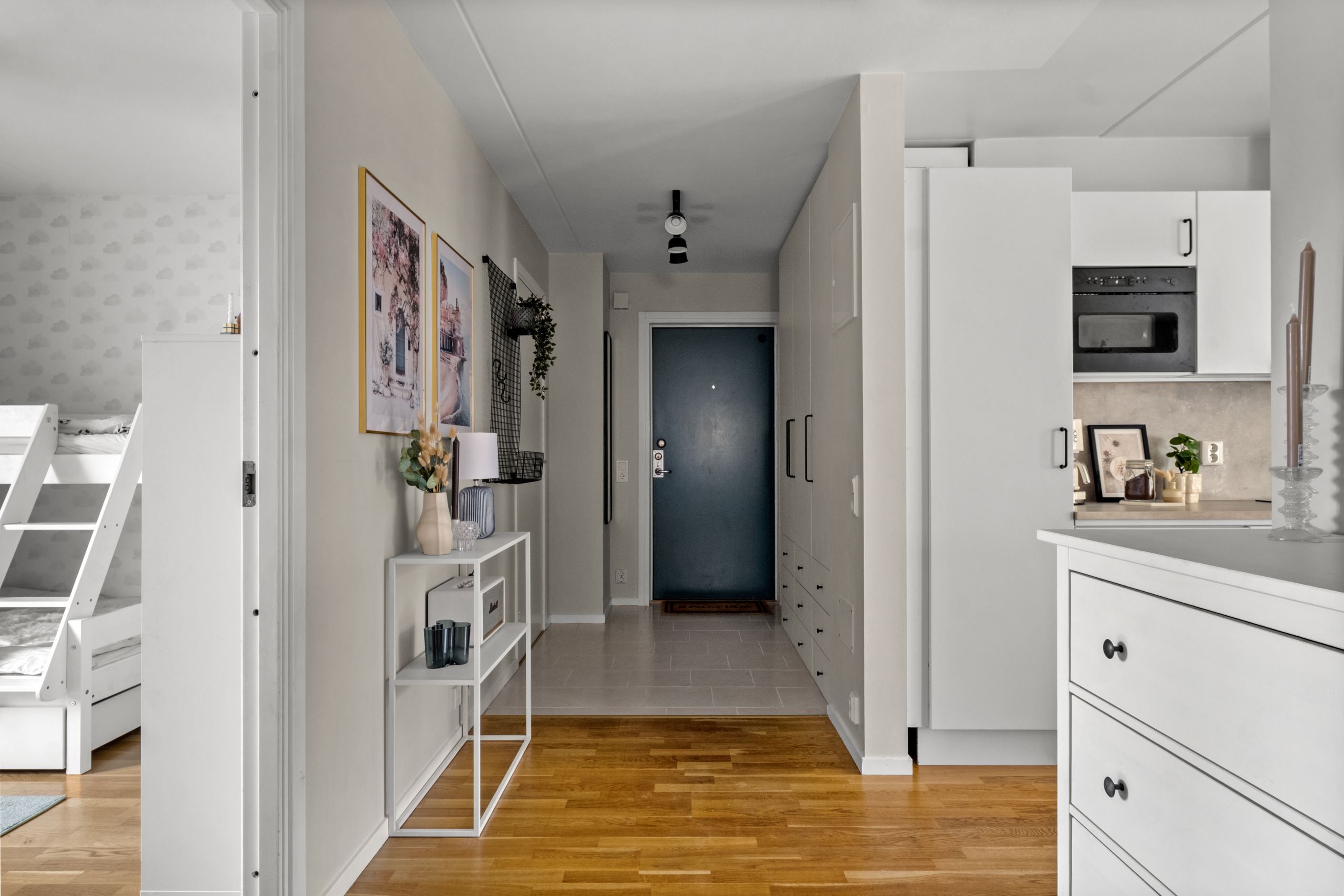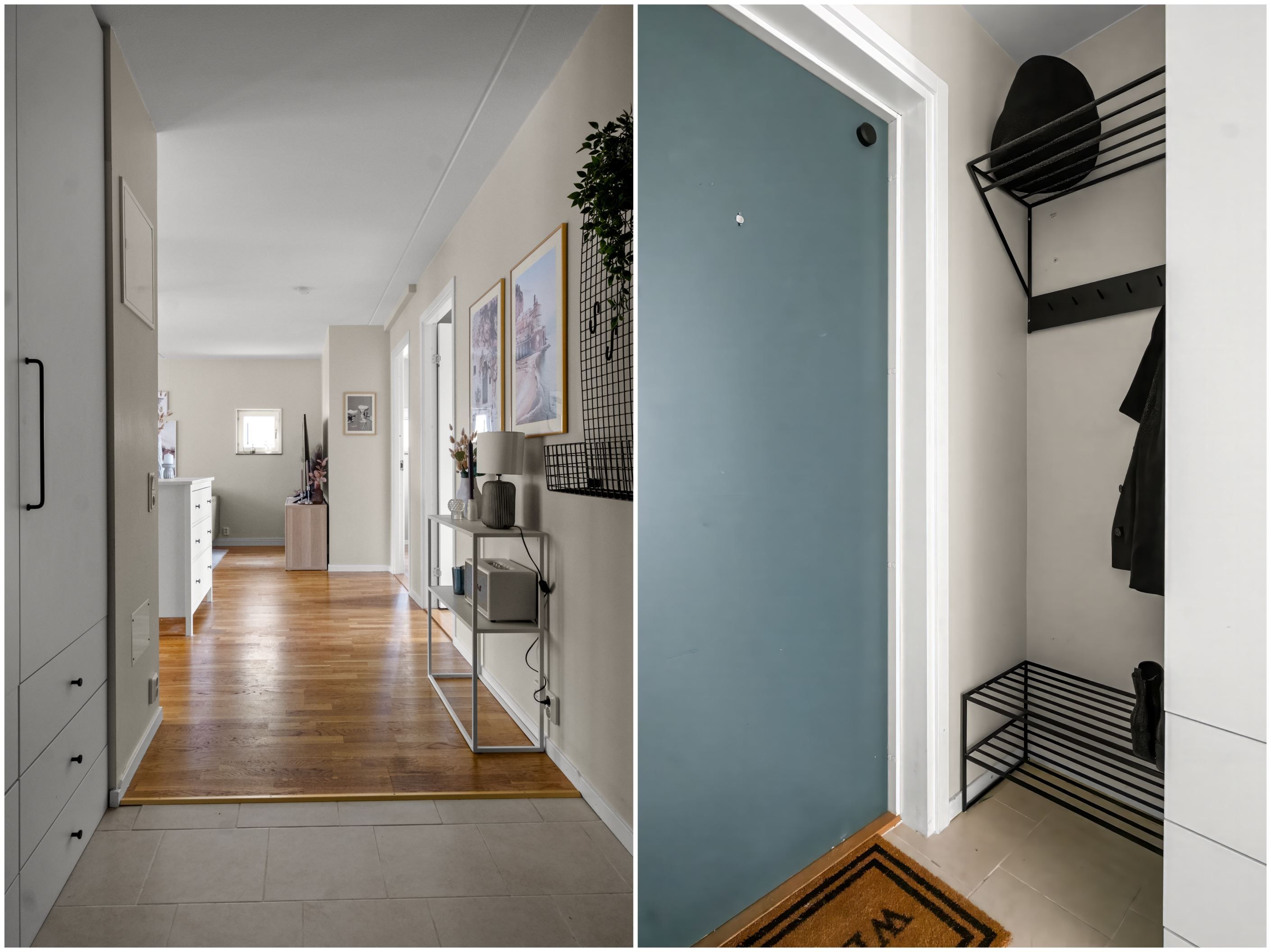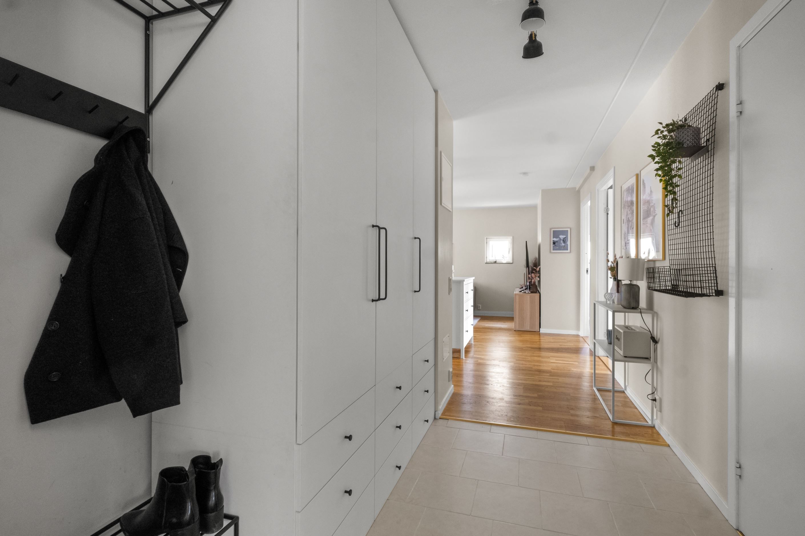 I den välkomnande hallen möts du av klinkergolv, klädhängare samt flera garderober och städskåp som ger gott om förvaring.