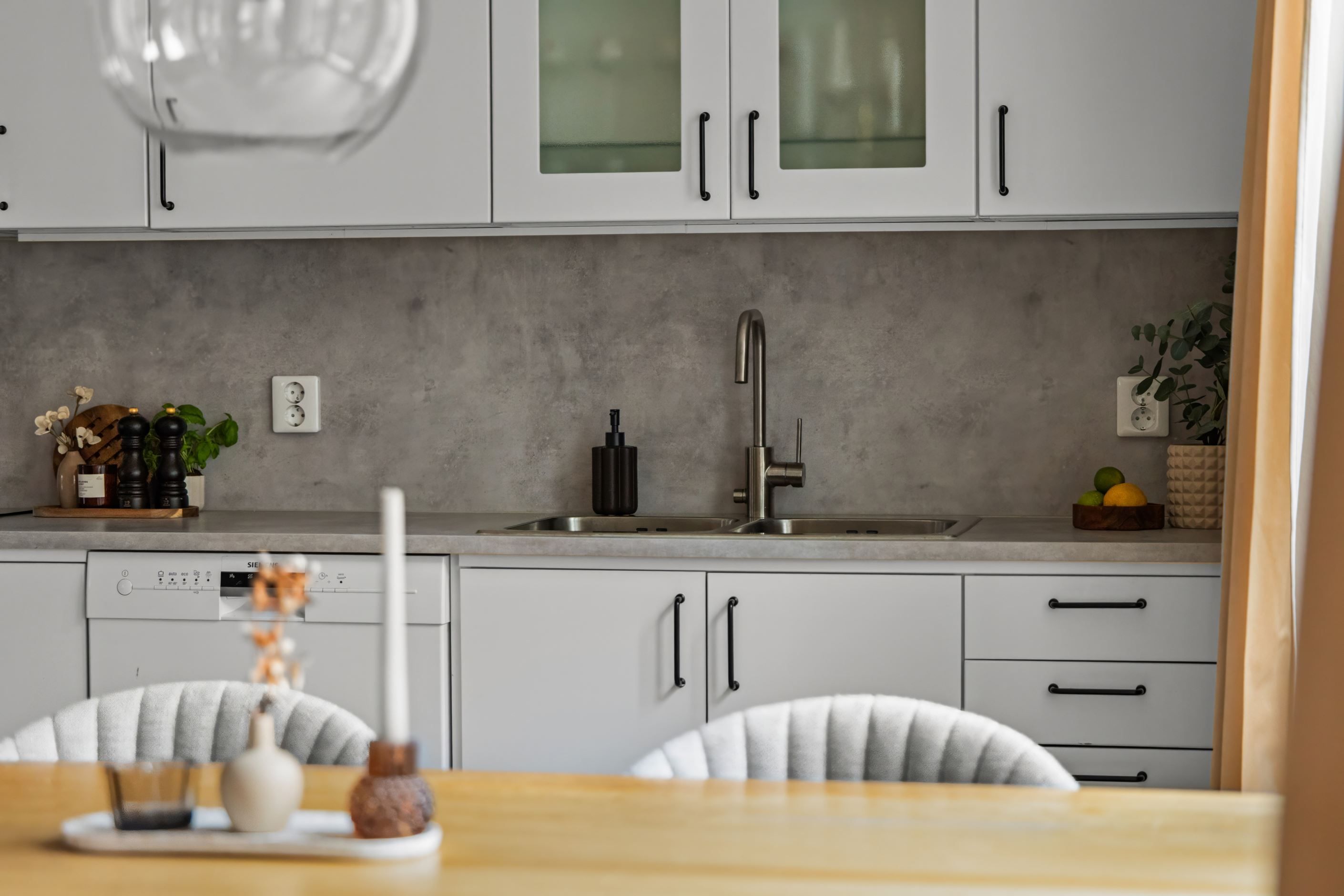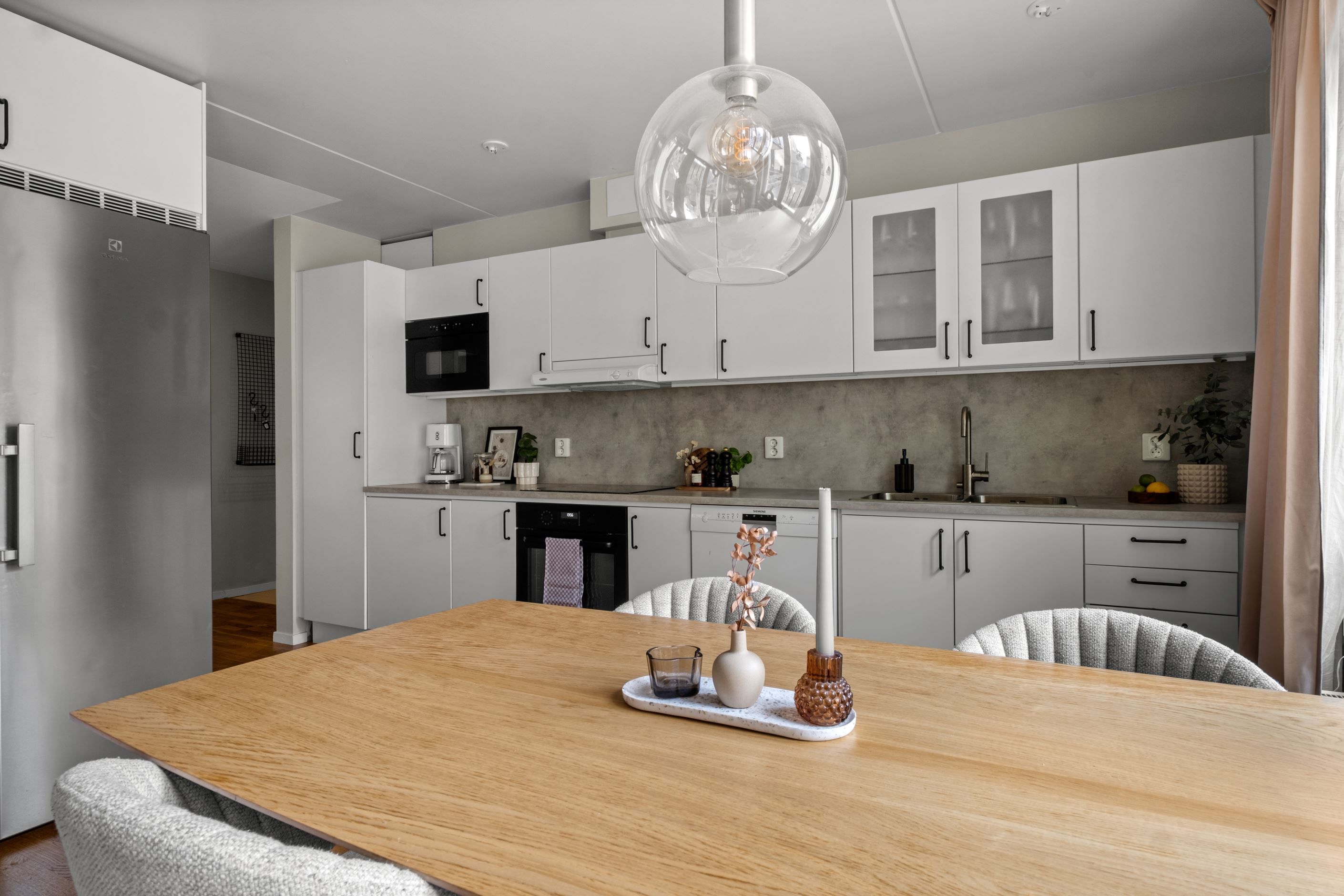 Kök och vardagsrum ligger i öppen planlösning, vilket skapar en härligt social och luftig känsla. Köket är utrustat med full maskinell utrustning, hel kyl och frys samt goda arbetsytor, och här finns plats för en matgrupp.