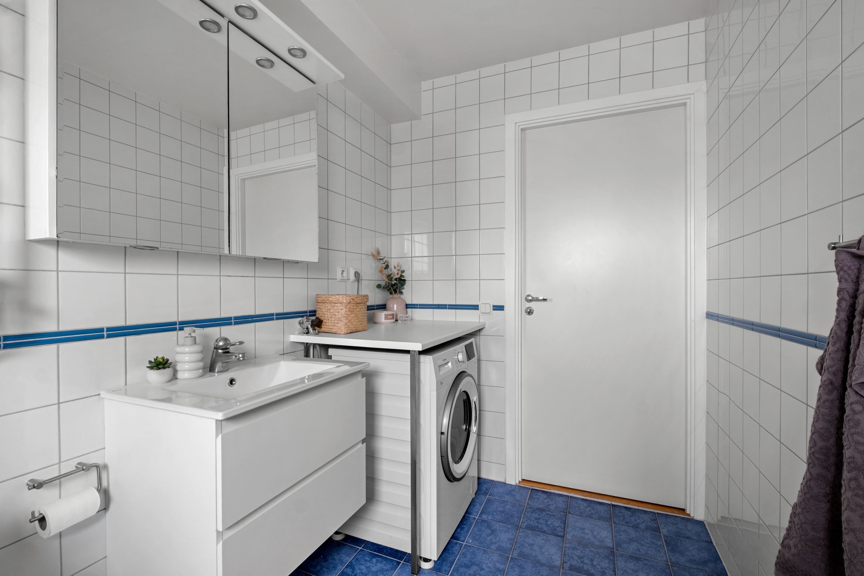 Det helkaklade badrummet är utrustat med badkar, tvättmaskin, kommod och spegelskåp.