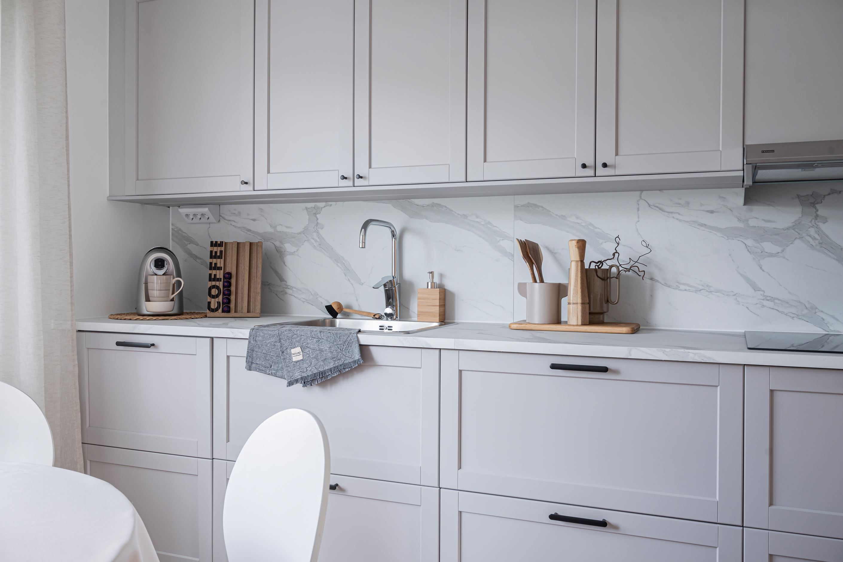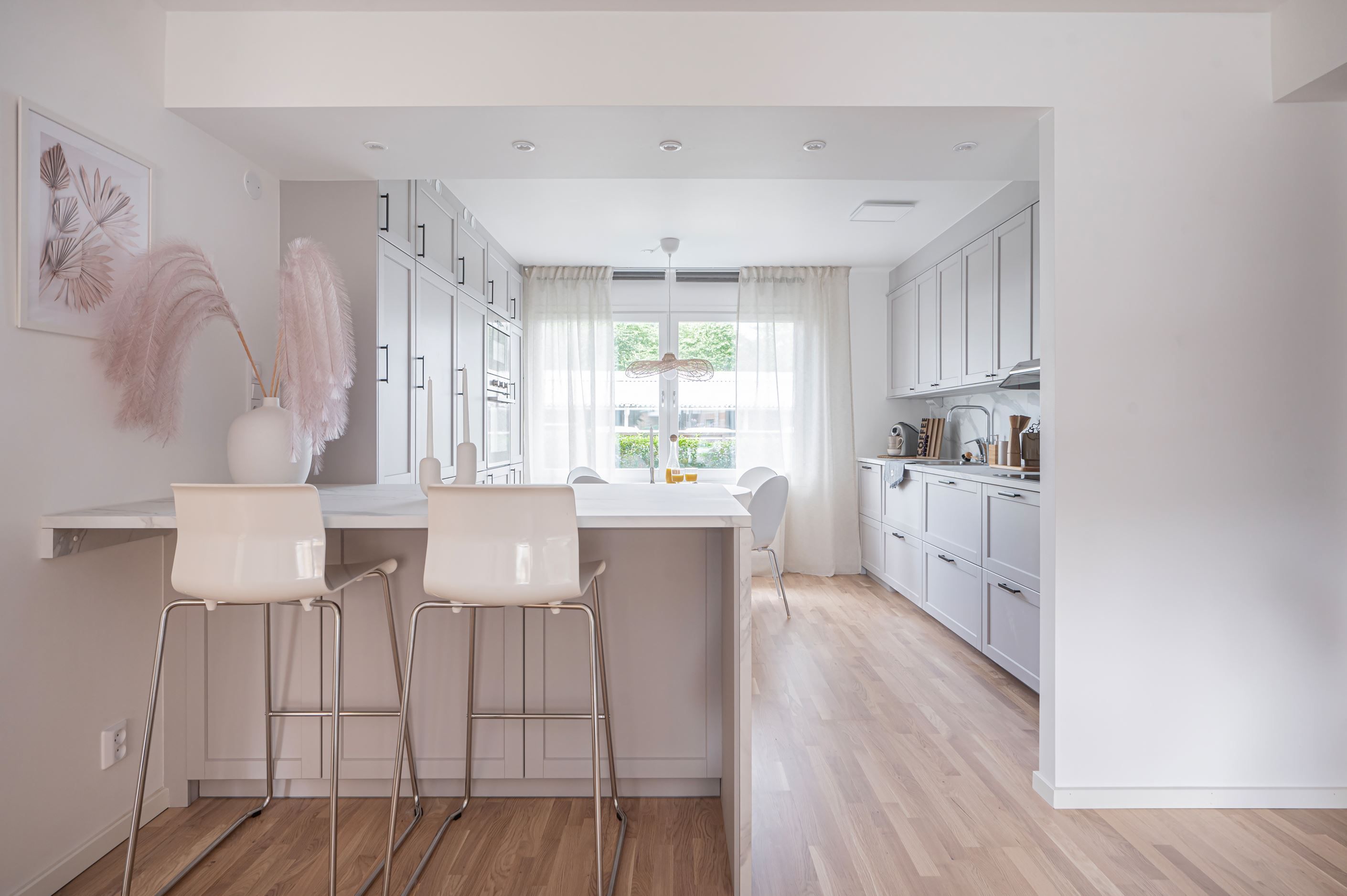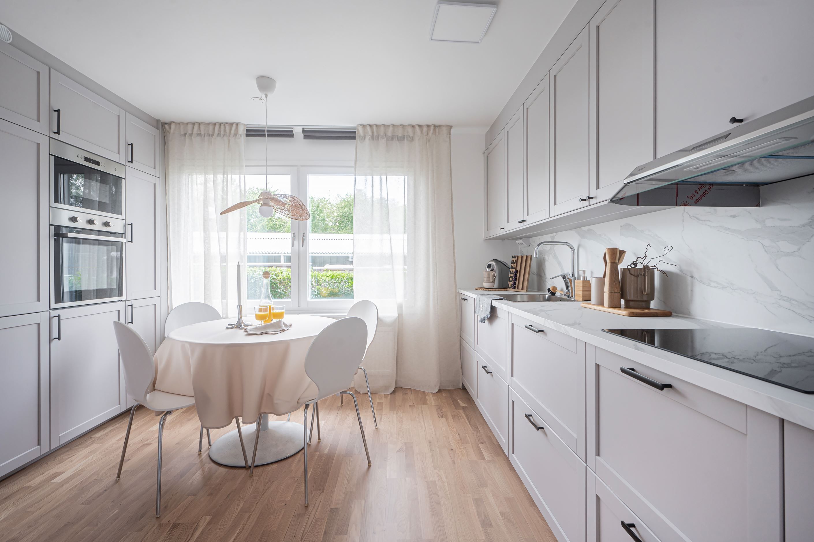 Kök – smakfullt renoverat i stilren skandinavisk design med praktisk köksö, gott om förvaring och en trivsam matplats.