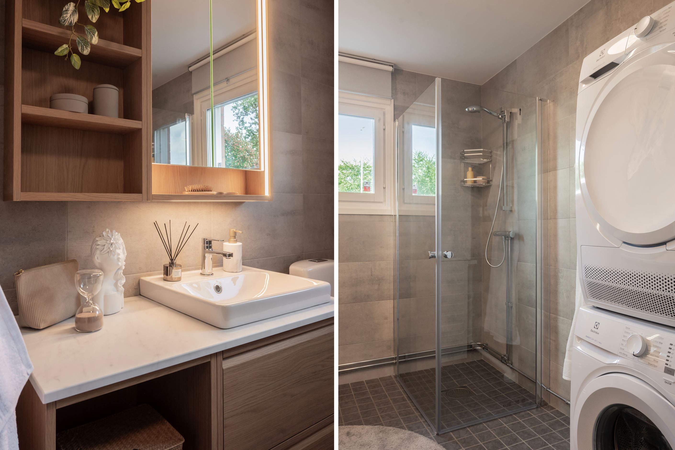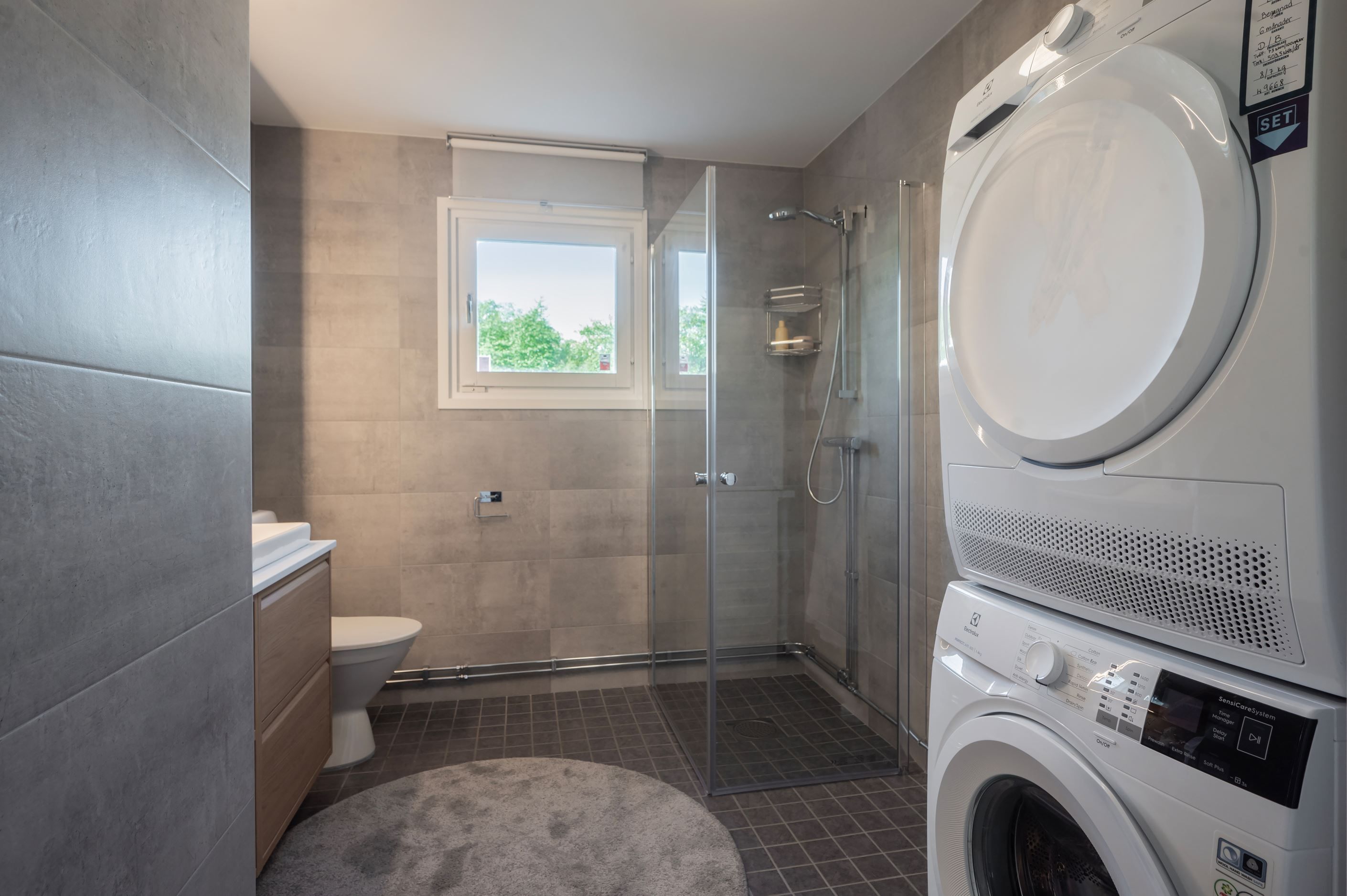 Badrum – lyxigt och stilrent, helkaklat med klinkergolv och golvvärme. Utrustat med dusch med fönster, WC, handfat med kommod samt tvättmaskin och torktumlare.