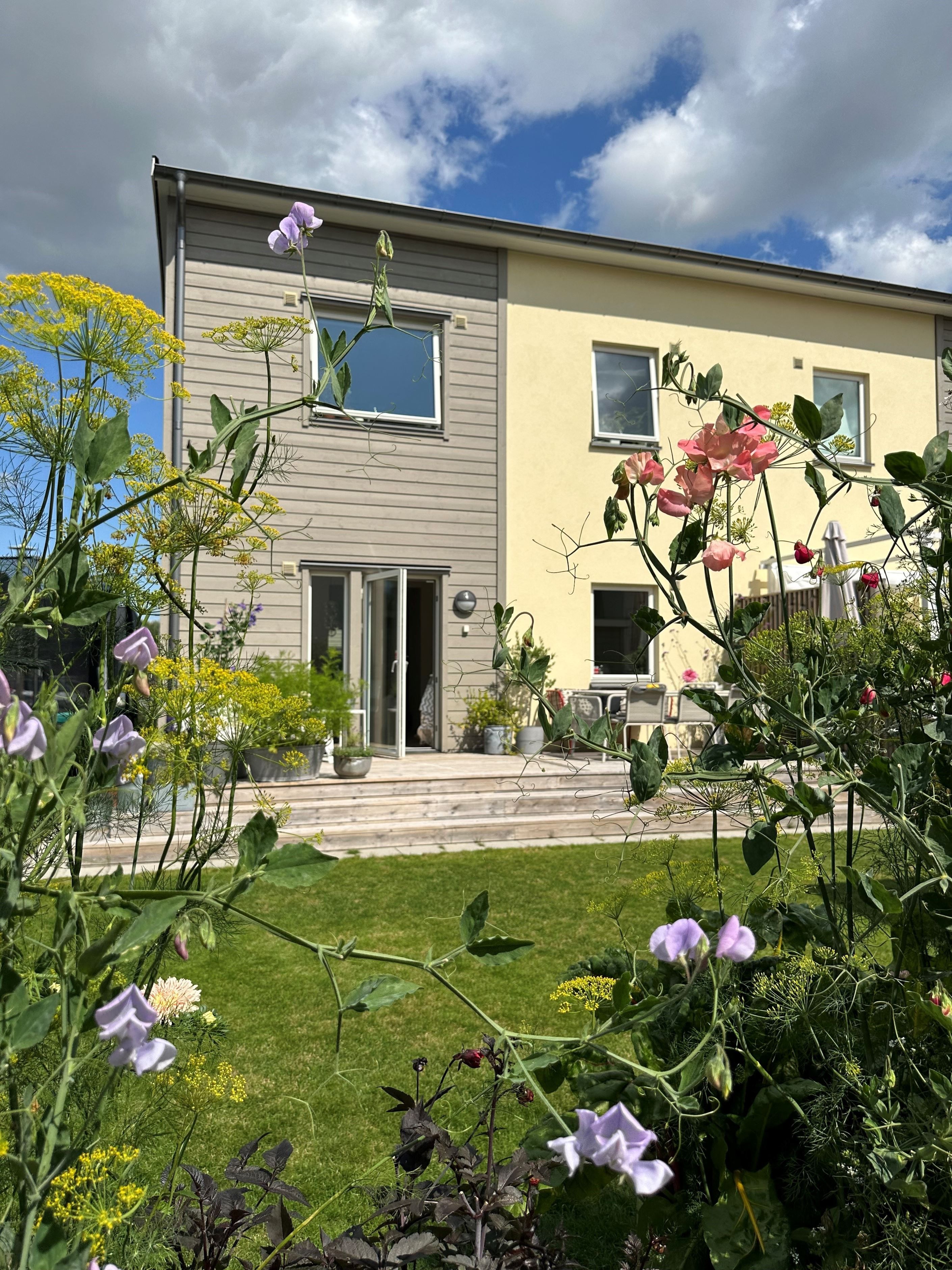 Utemiljön är trivsam och social med närhet till grannarna, men det finns också möjlighet att skapa avskildhet genom spaljéer eller växtlighet. Det finns uteplatser på båda sidor av huset – ett upphöjt trädäck mot trädgården samt en mindre uteplats på framsidan. Trädgården, som är en av de större i föreningen tack vare gavelläget, erbjuder både gräsmatta och odlingslådor samt ett privat förråd med åtkomst från trädgården.