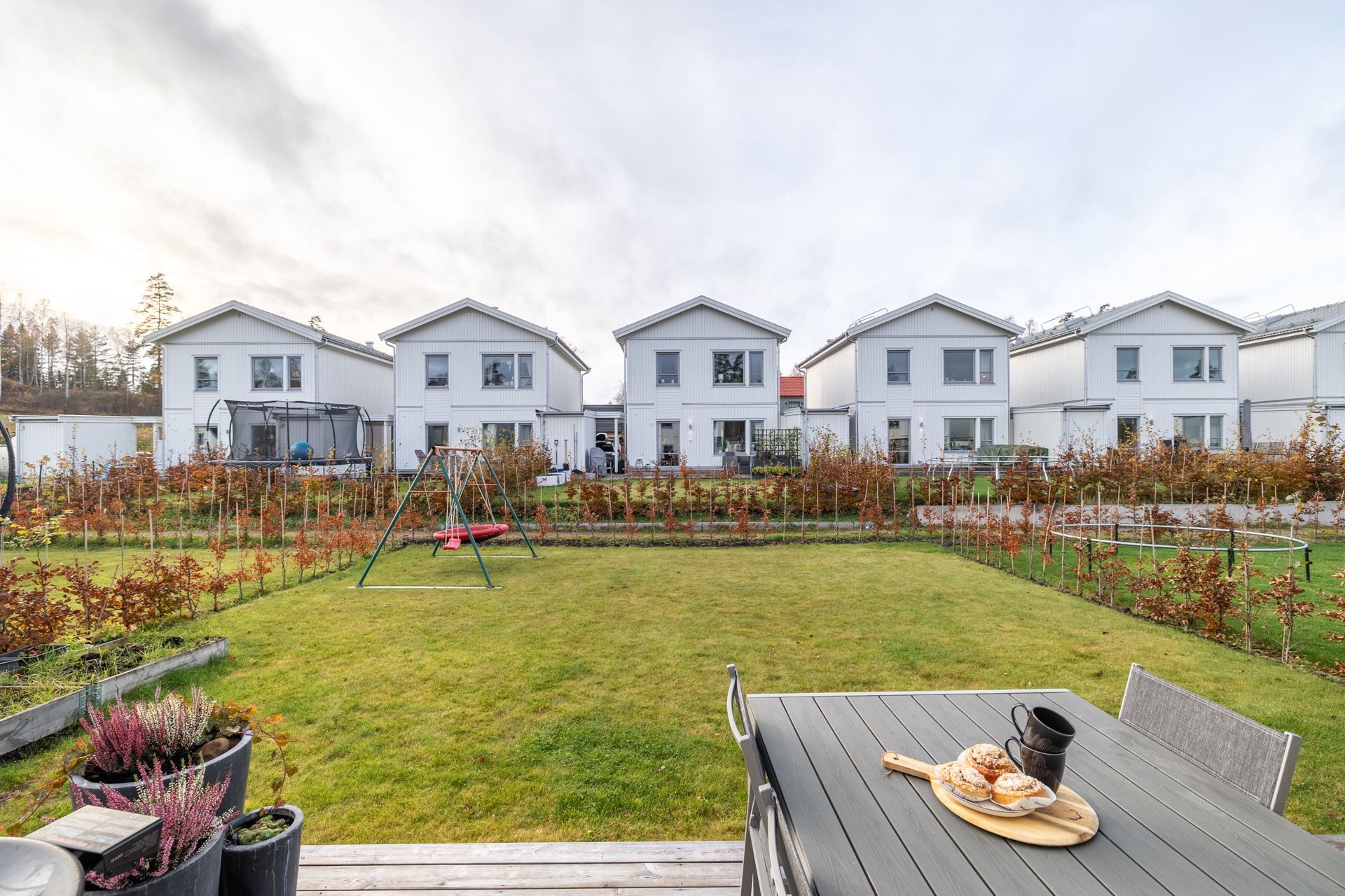 När du kliver ut i den fina trädgården öppnar sig en oas av grönska och lugn. Här kan du njuta av soliga dagar, kanske med en bok i handen eller i sällskap av nära och kära under en mysig grillkväll.