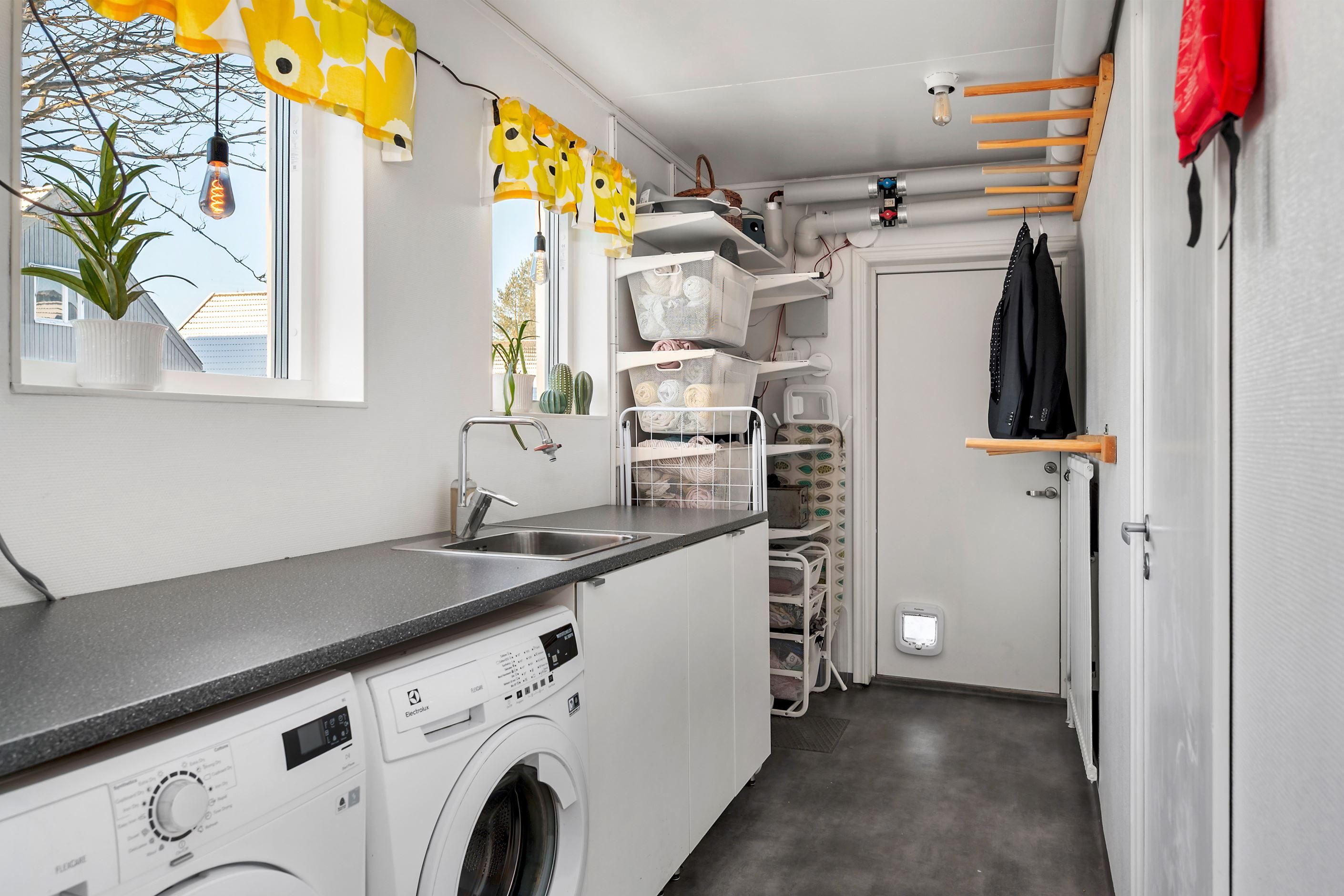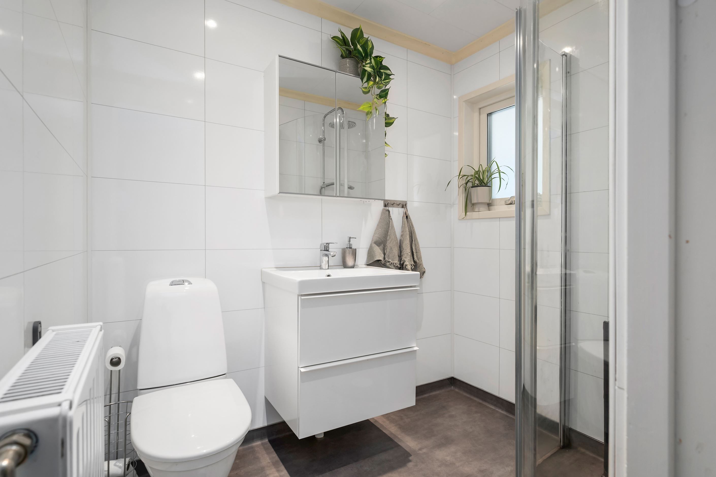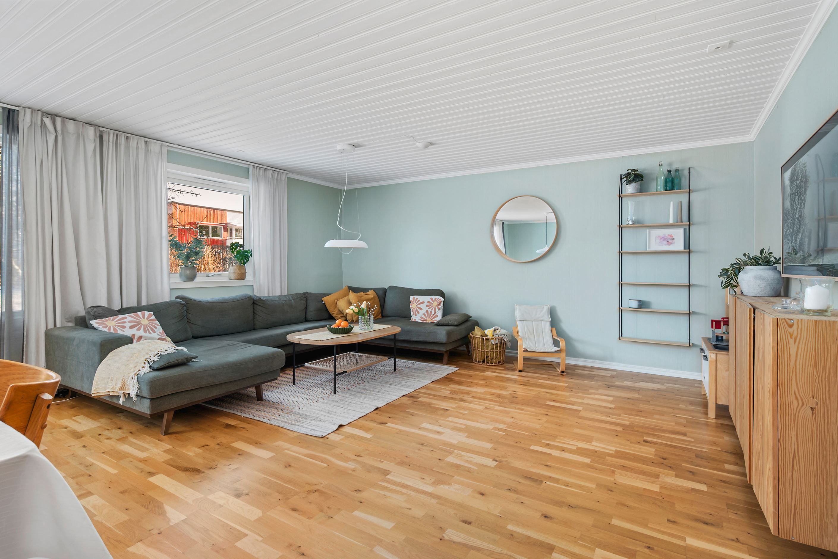 I det väl tilltagna vardagsrummet finns utrymme för större sociala sammankomster då ett matsalsbord om 8-10 platser samt större soffgrupp får plats utan problem. Här finner ni också stora fönster mot baksidan i soligt läge. Tomten erbjuder goda möjligheter för sociala aktiviteter samtidigt som ni kan ta er tid att koppla av på altanen där ena delen är försedd med tak då vädret inte tillåter er att sitta under bar himmel och den andra delen erbjuder er att njuta av solens strålar när möjlighet finns.