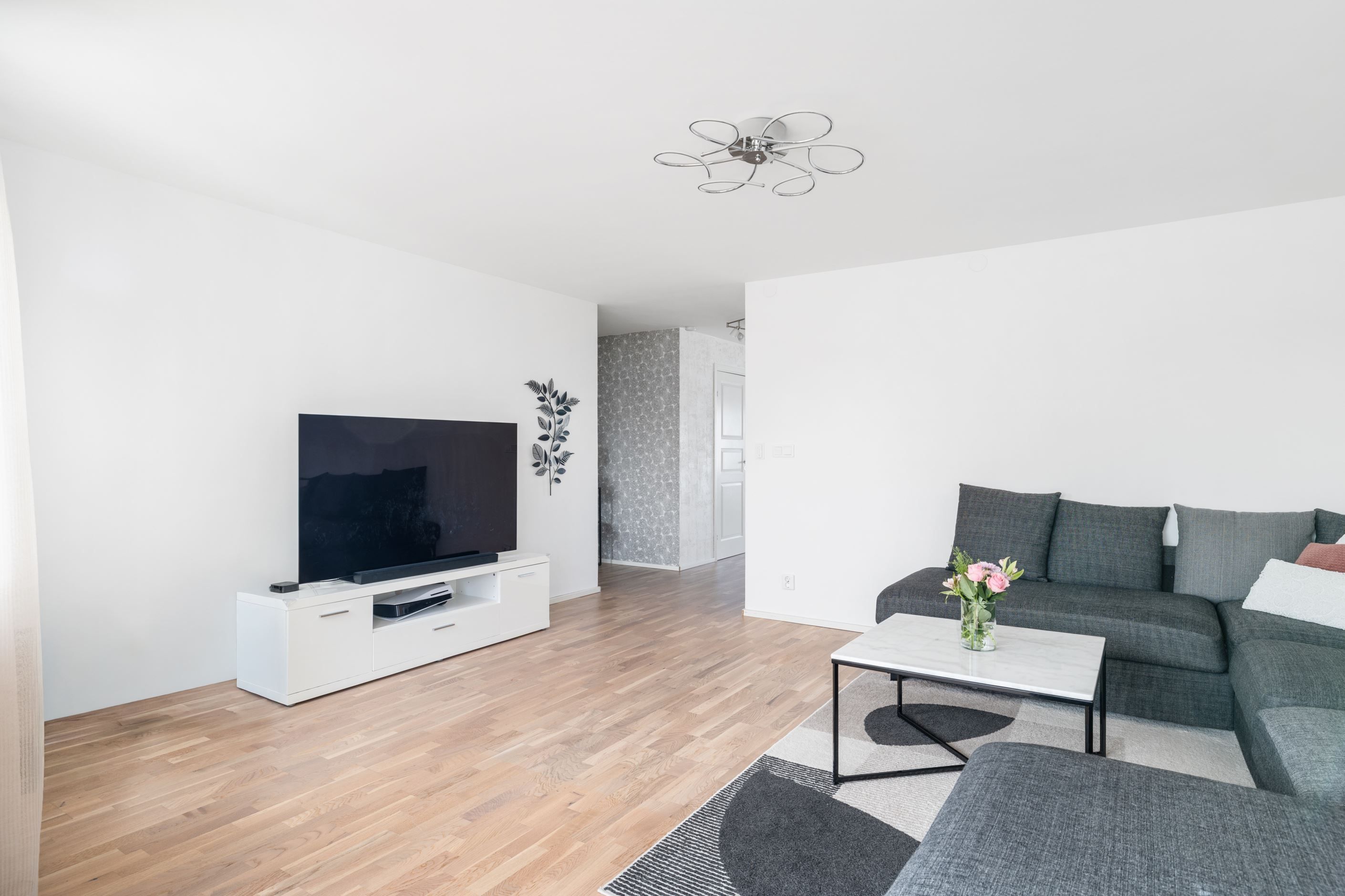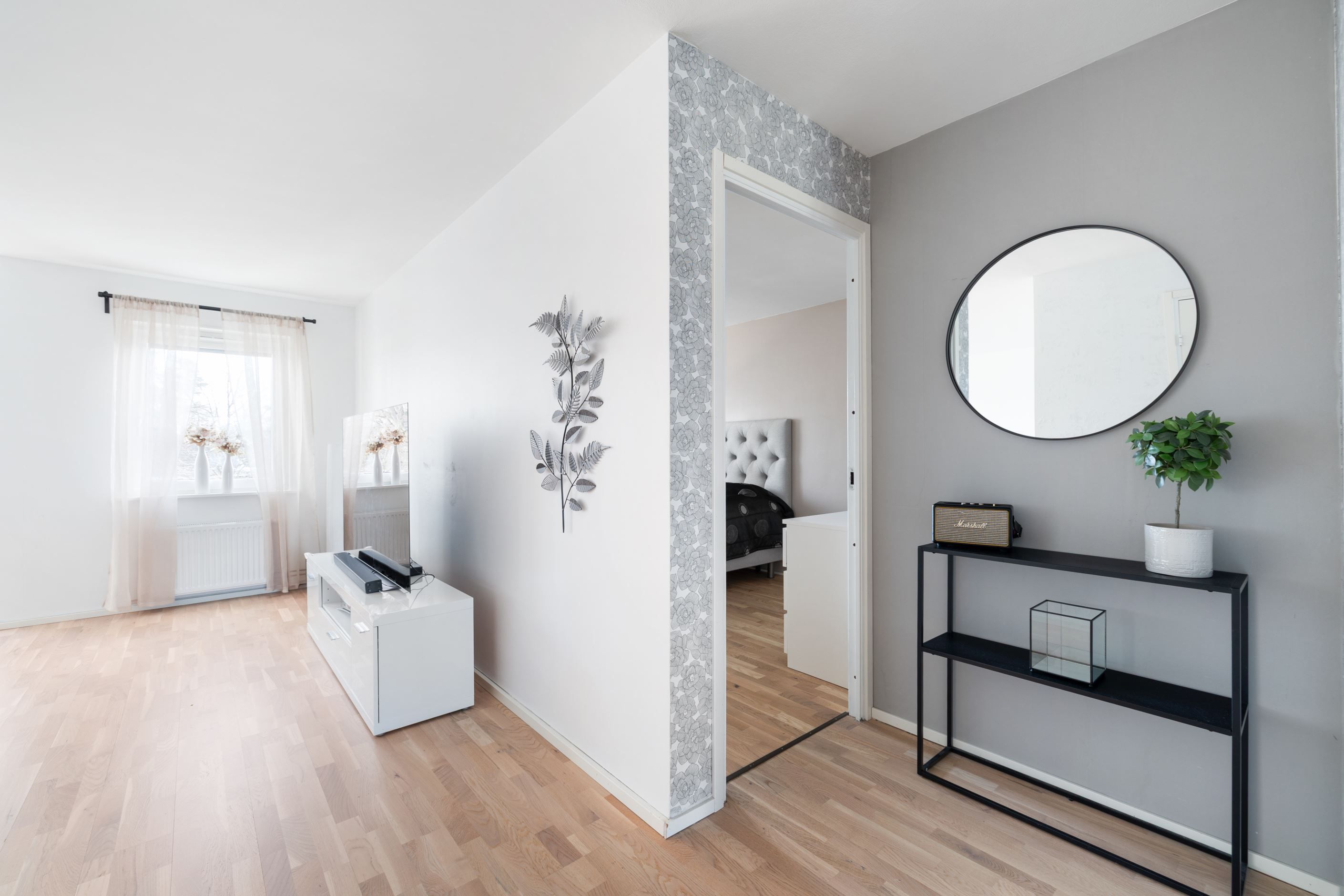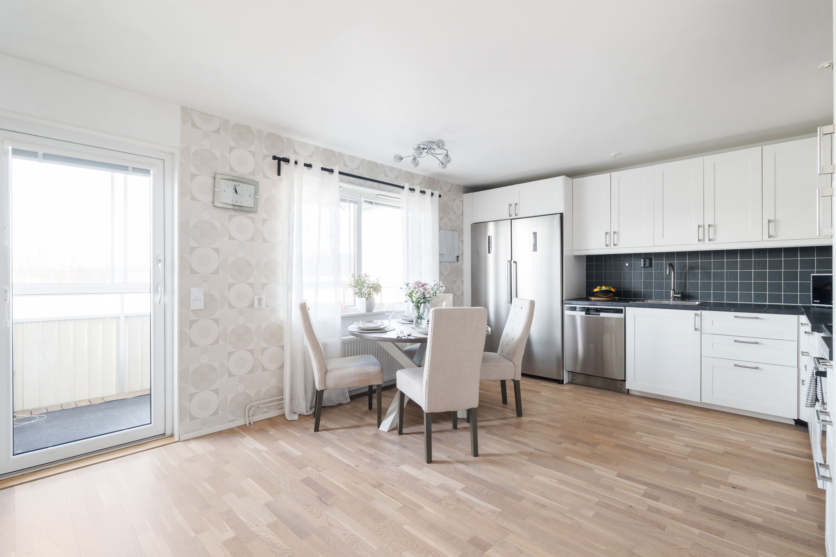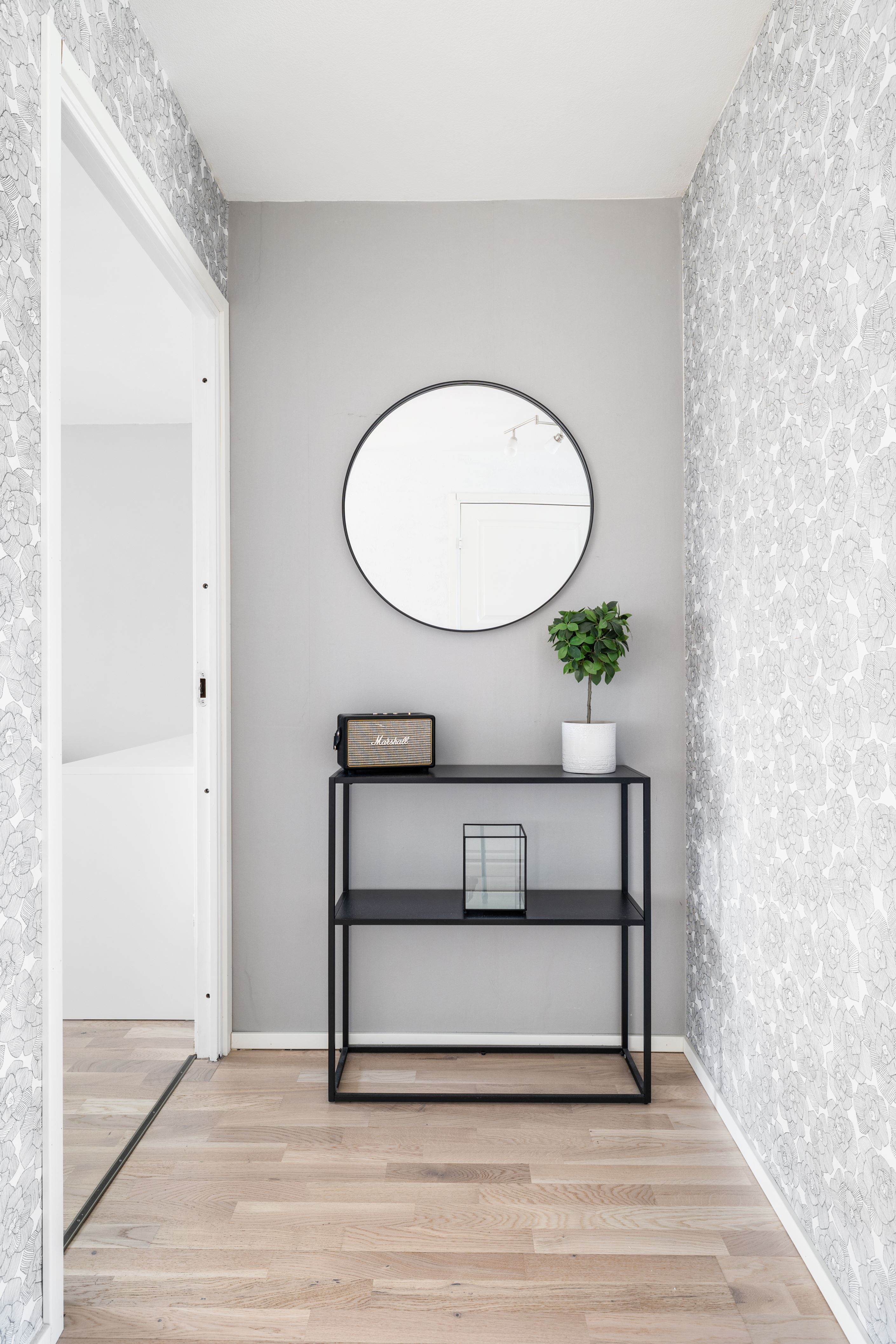 Genom hela lägenheten löper en vitlaserad ekparkett som skapar ett enhetligt och ljust intryck. Det stilrena badrummet, renoverat 2017, är helkaklat i klinker och kakel och utrustat med dusch, kommod, badrumsskåp samt både tvättmaskin och torktumlare. Smakfulla färgval i beige toner med svarta detaljer ger badrummet en modern och tidlös känsla.