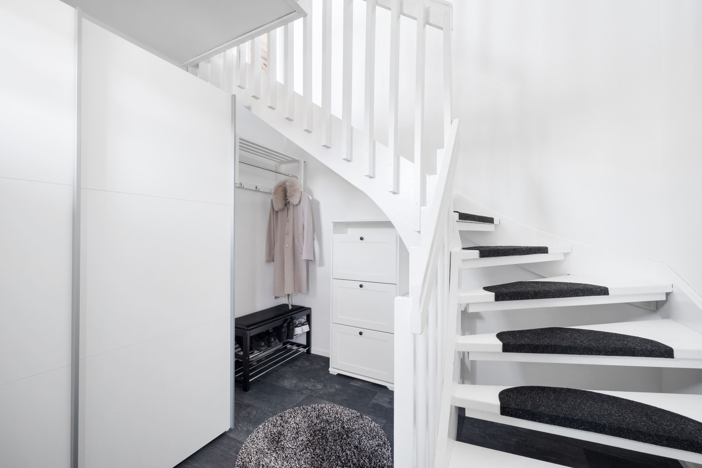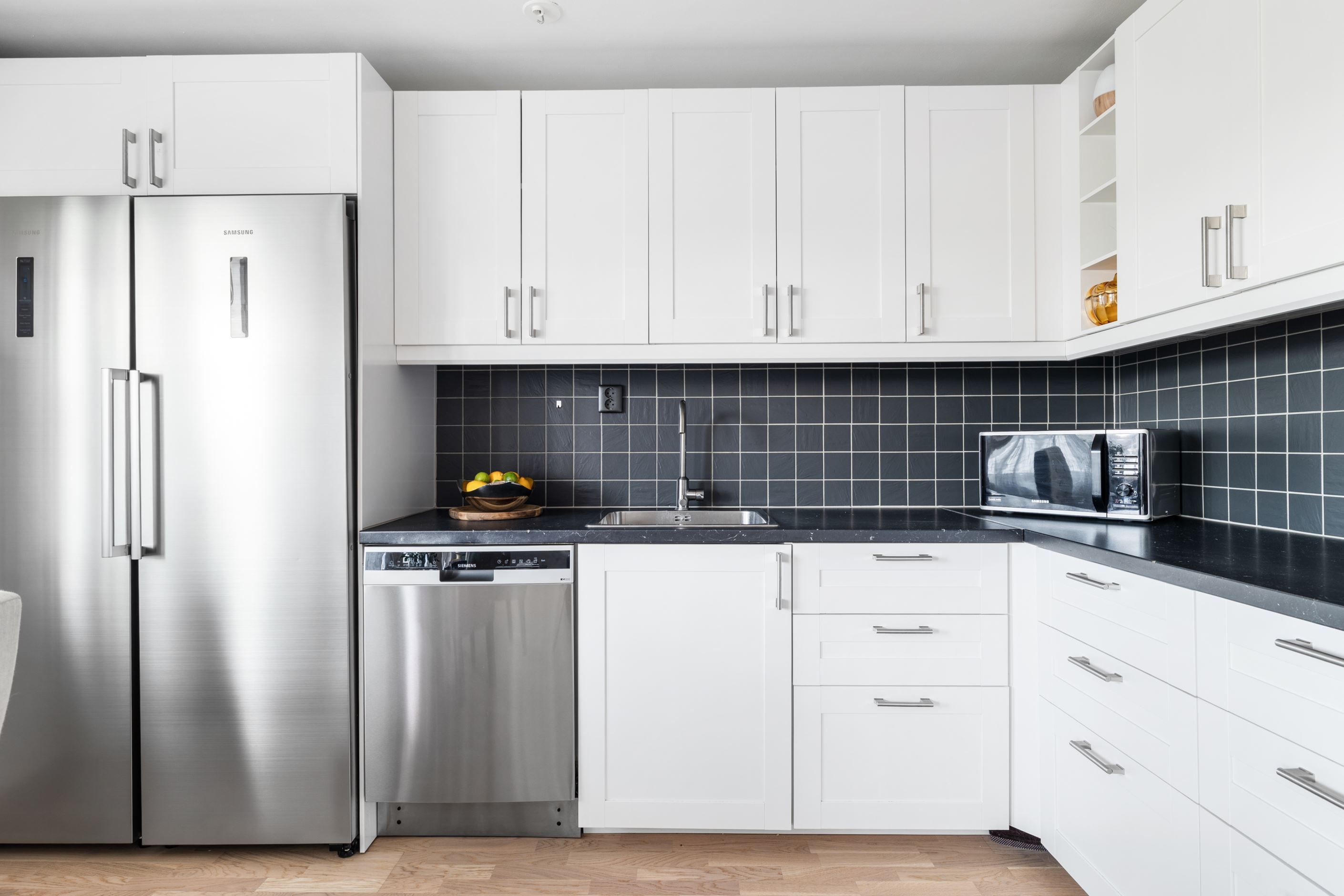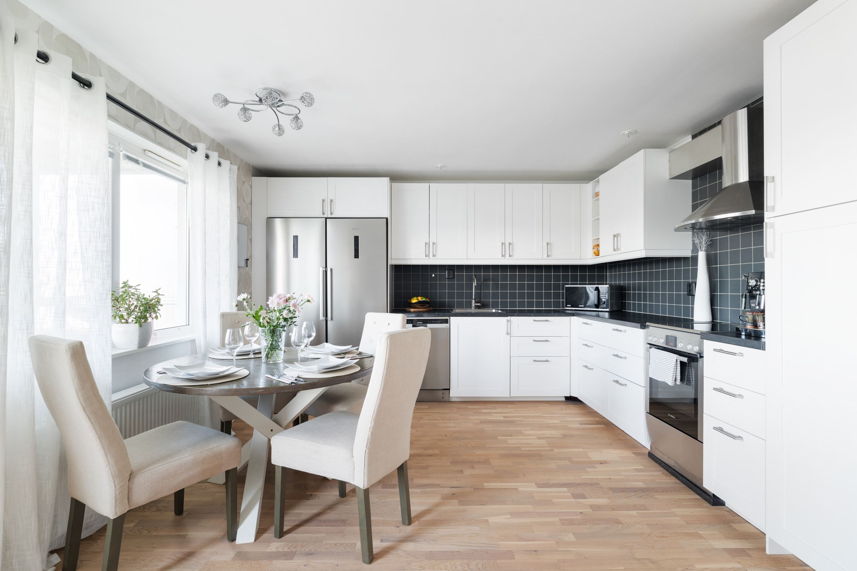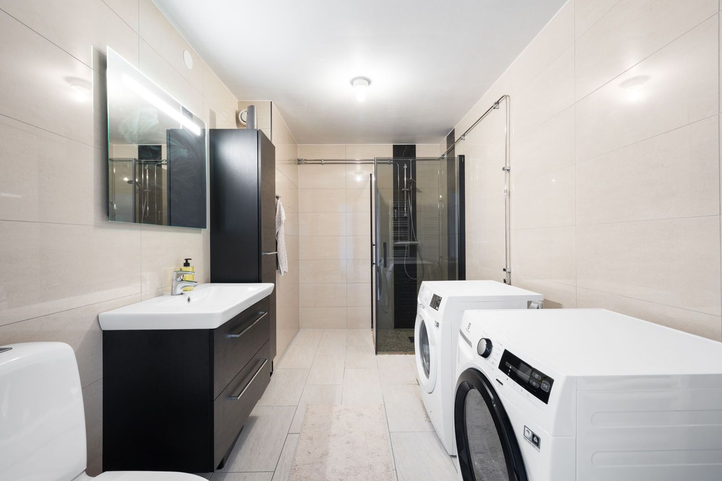 Genom hela lägenheten löper en vitlaserad ekparkett som skapar ett enhetligt och ljust intryck. Det stilrena badrummet, renoverat 2017, är helkaklat i klinker och kakel och utrustat med dusch, kommod, badrumsskåp samt både tvättmaskin och torktumlare. Smakfulla färgval i beige toner med svarta detaljer ger badrummet en modern och tidlös känsla.