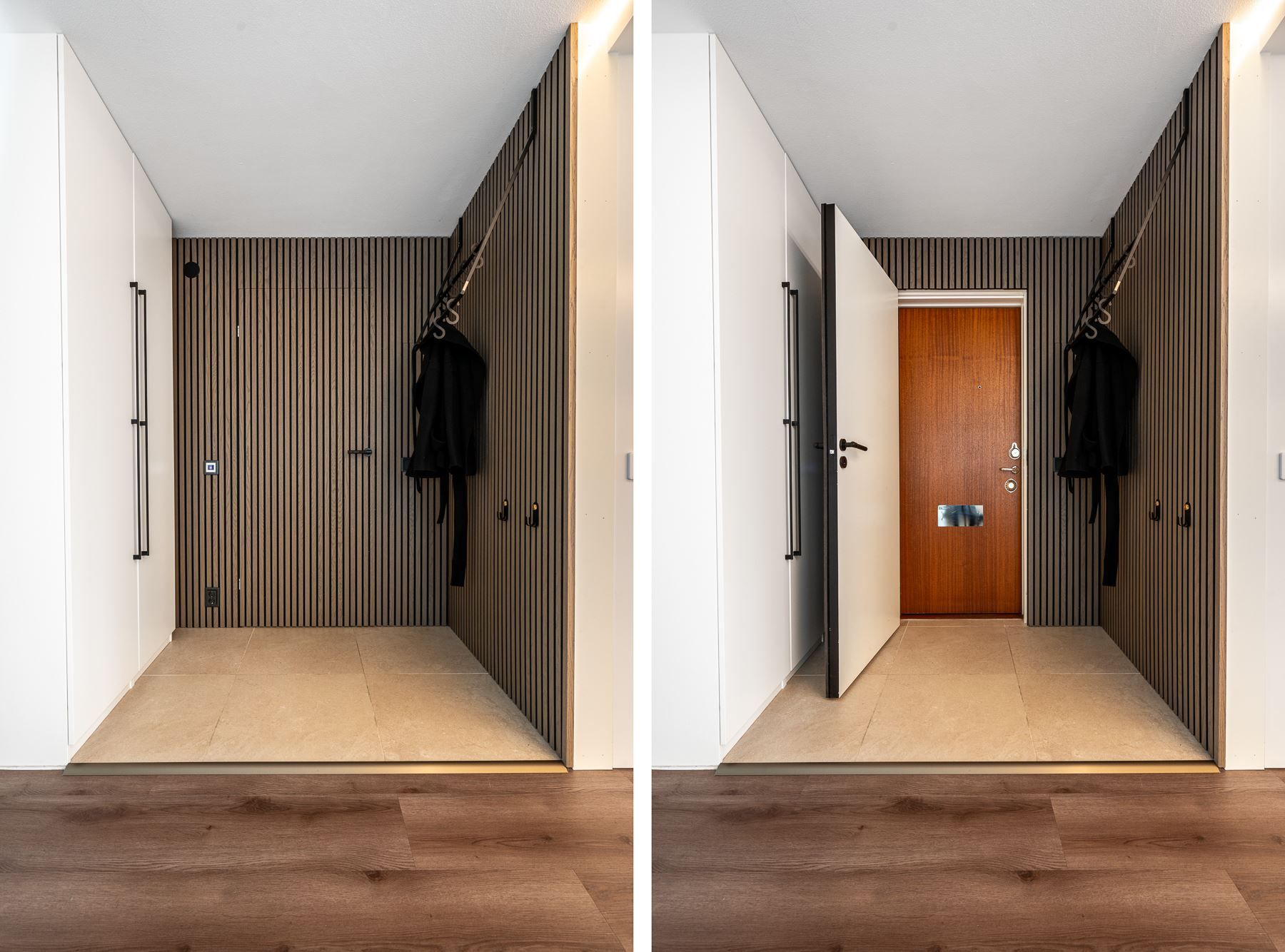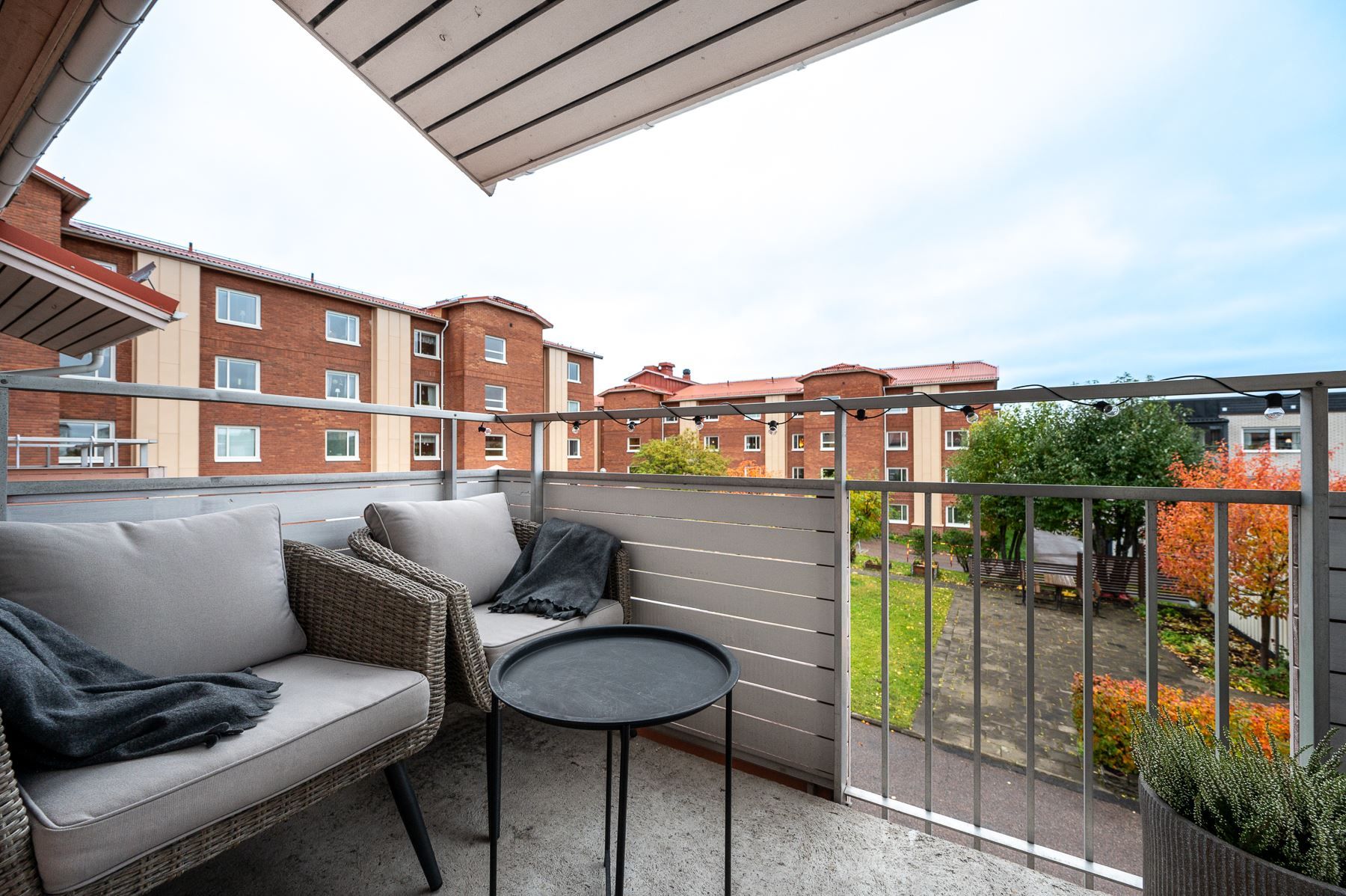 Hall med stilren akustikpanel både på vägg och över ytterdörren – en snygg och praktisk detalj. Klinkergolv med behaglig elgolvvärme. Öppen planlösning mellan kök, vardagsrum och hall som ger ett fint ljusflöde genom hela bostaden. Kök med ljus inredning, inbyggd belysning och gott om arbetsytor. Vardagsrum med extra ljudisolerad vägg mot grannen. Balkong med kvällssol, utsikt över den lugna innergården och med ingång till matplatsen. Sovrum med garderob och fönster mot innergård. Stort sovrum med garderober samt platsbyggd sänggavel med inbyggd belysning och eluttag. Badrum med ”det lilla extra”: elgolvvärme, kakel och klinker, väggmonterad dusch och wc, inbyggd hylla samt tvättmaskin.