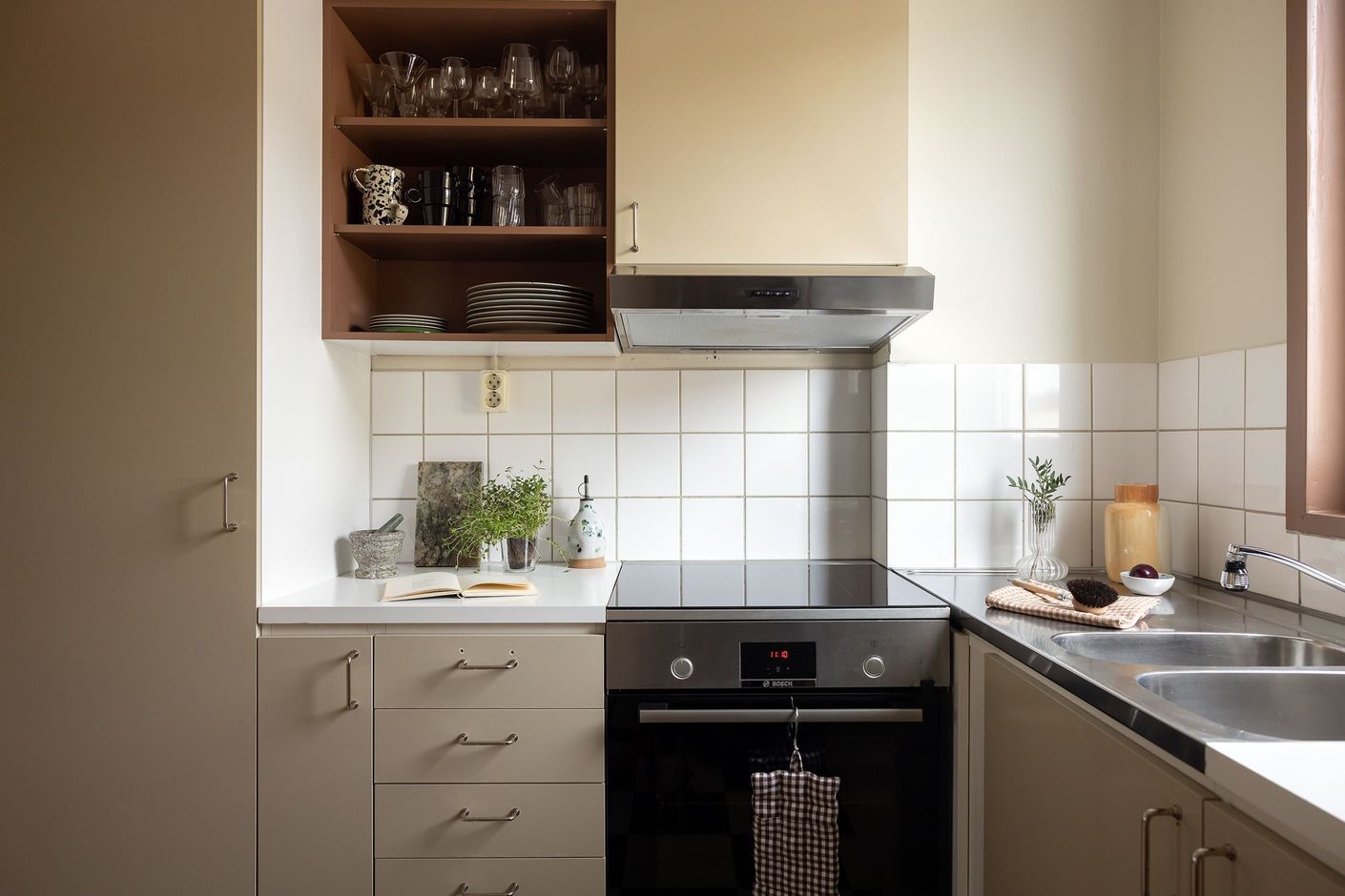 Du välkomnas av en rymlig hall med praktiska avhängningsmöjligheter direkt till höger samt garderober som erbjuder generös förvaring. Till vänster om hallen ligger köket som är inrett med ett charmigt schackrutigt golv och ljusa väggar. Köket rymmer en mindre matgrupp och är utrustat med kyl/frys, spishäll, ugn samt fläkt. Direkt till höger om hallen nås badrummet, som är helkaklat i ljusa toner och utrustat med badkar samt spegelskåp ovanför handfatet.