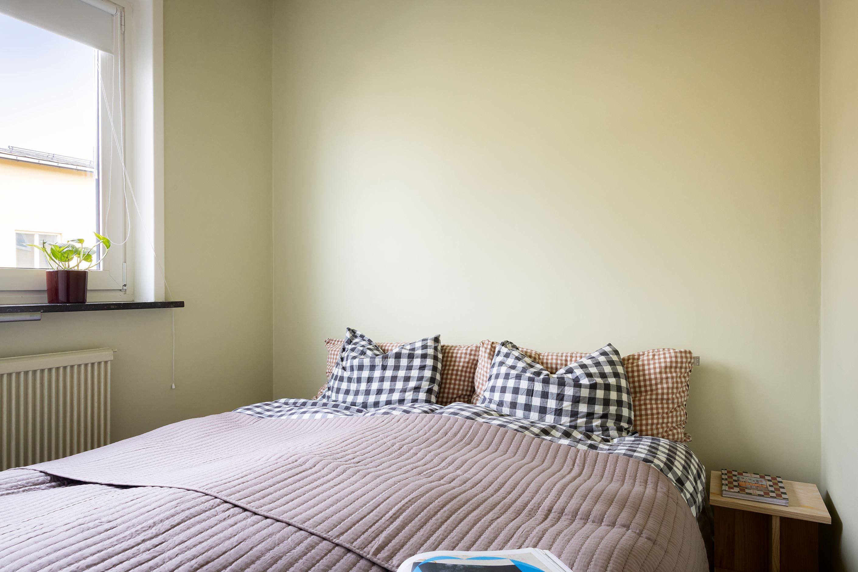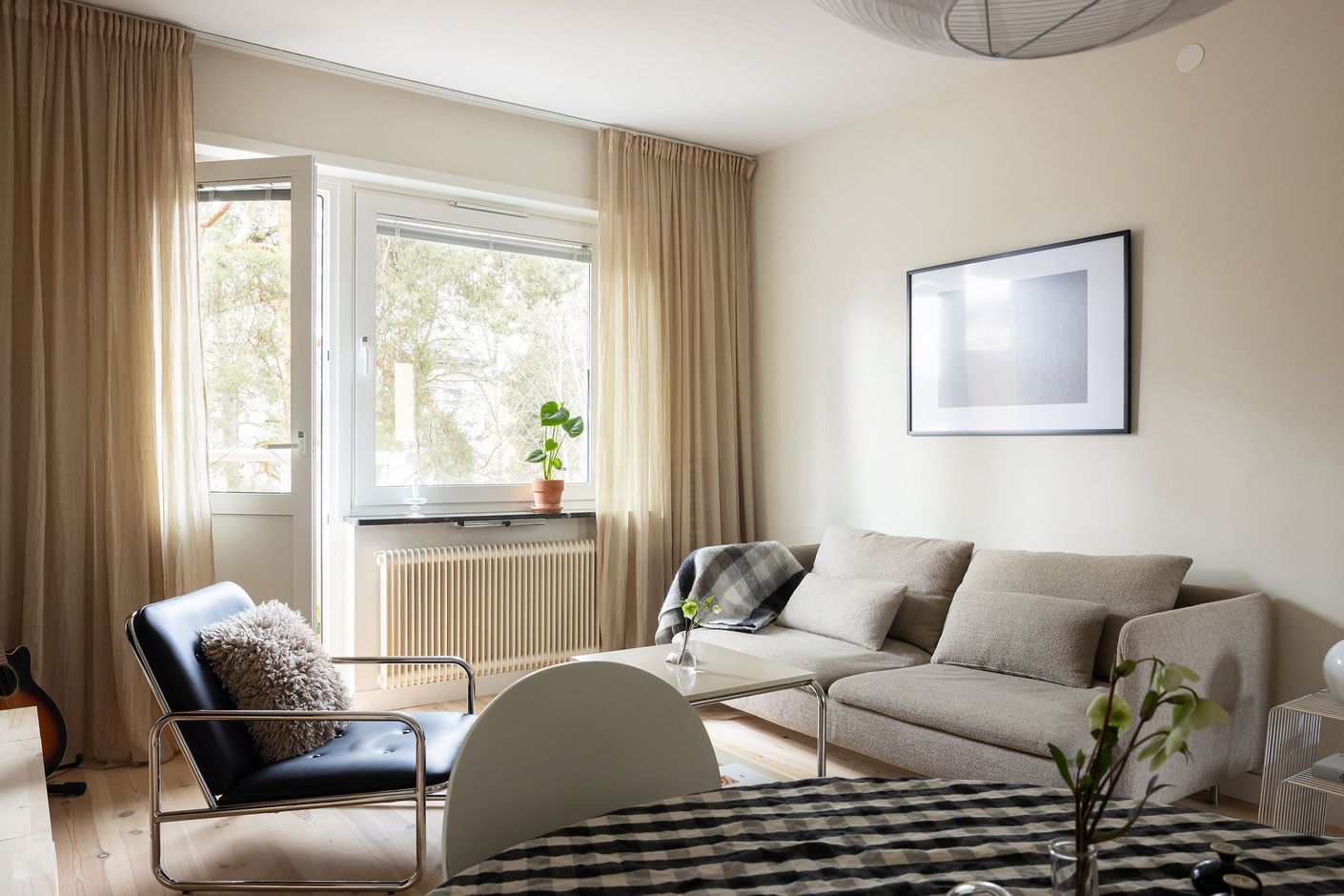 Vidare in i bostaden möts du av ett luftigt och lättmöblerat vardagsrum med generösa ytor för soffgrupp, TV-möbel samt en större matplats för 4–6 personer. Härifrån nås även balkongen - en härlig plats för avkoppling och umgänge under årets varmare månader. Från vardagsrummet når du sovrummet, som rymmer en dubbelsäng med tillhörande sängbord. Här finns även garderober som erbjuder ytterligare förvaringsmöjligheter.