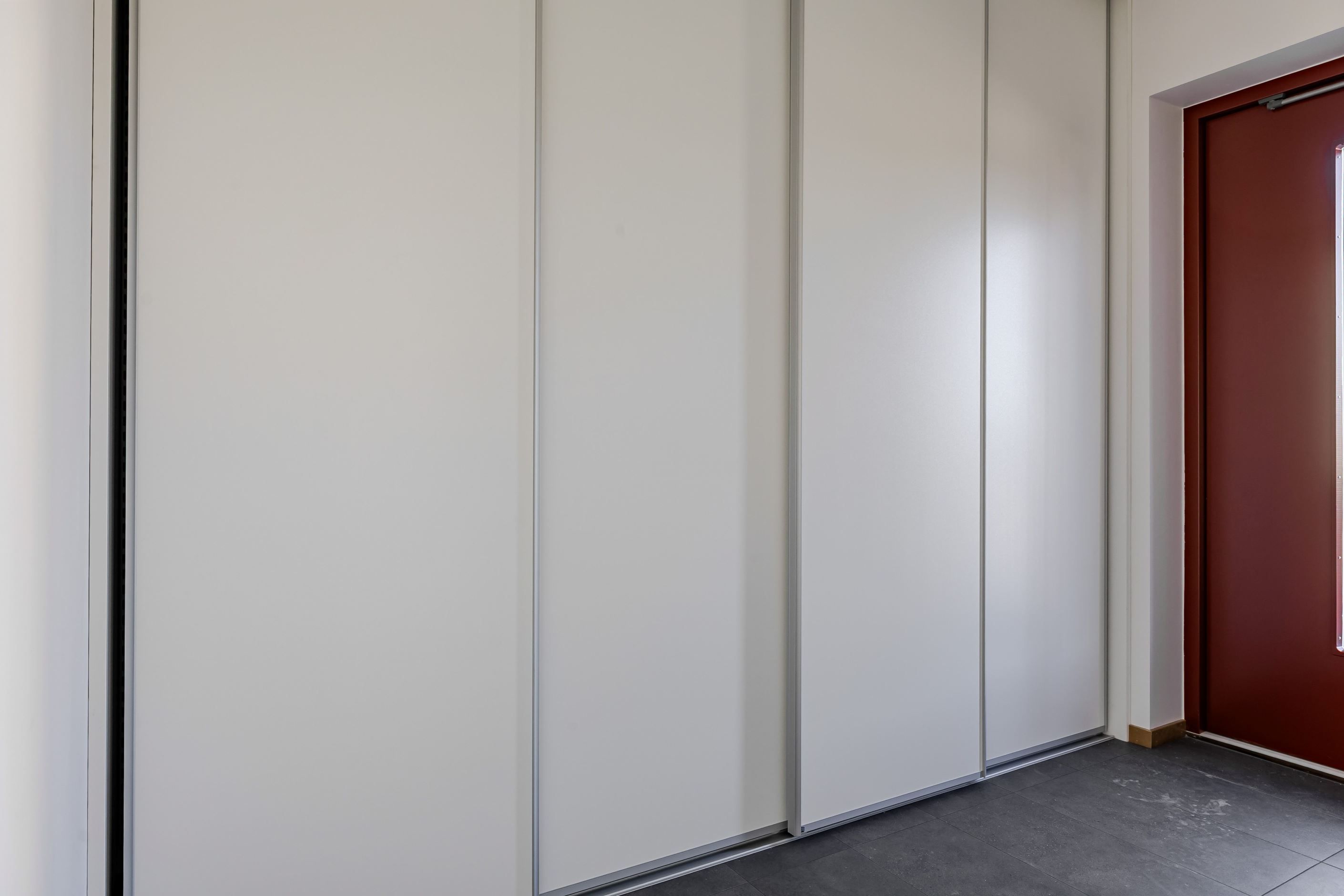 En rejäl hall med klinkers och och bra förvaring i skjutdörrsgarderob.