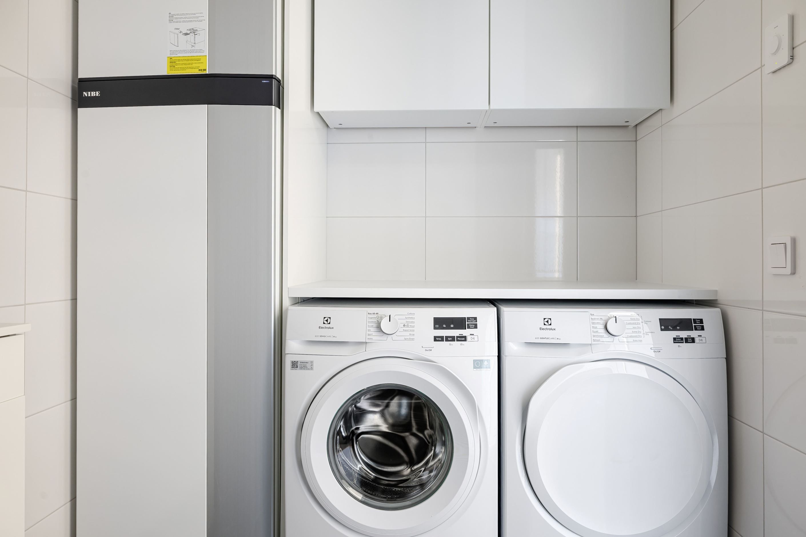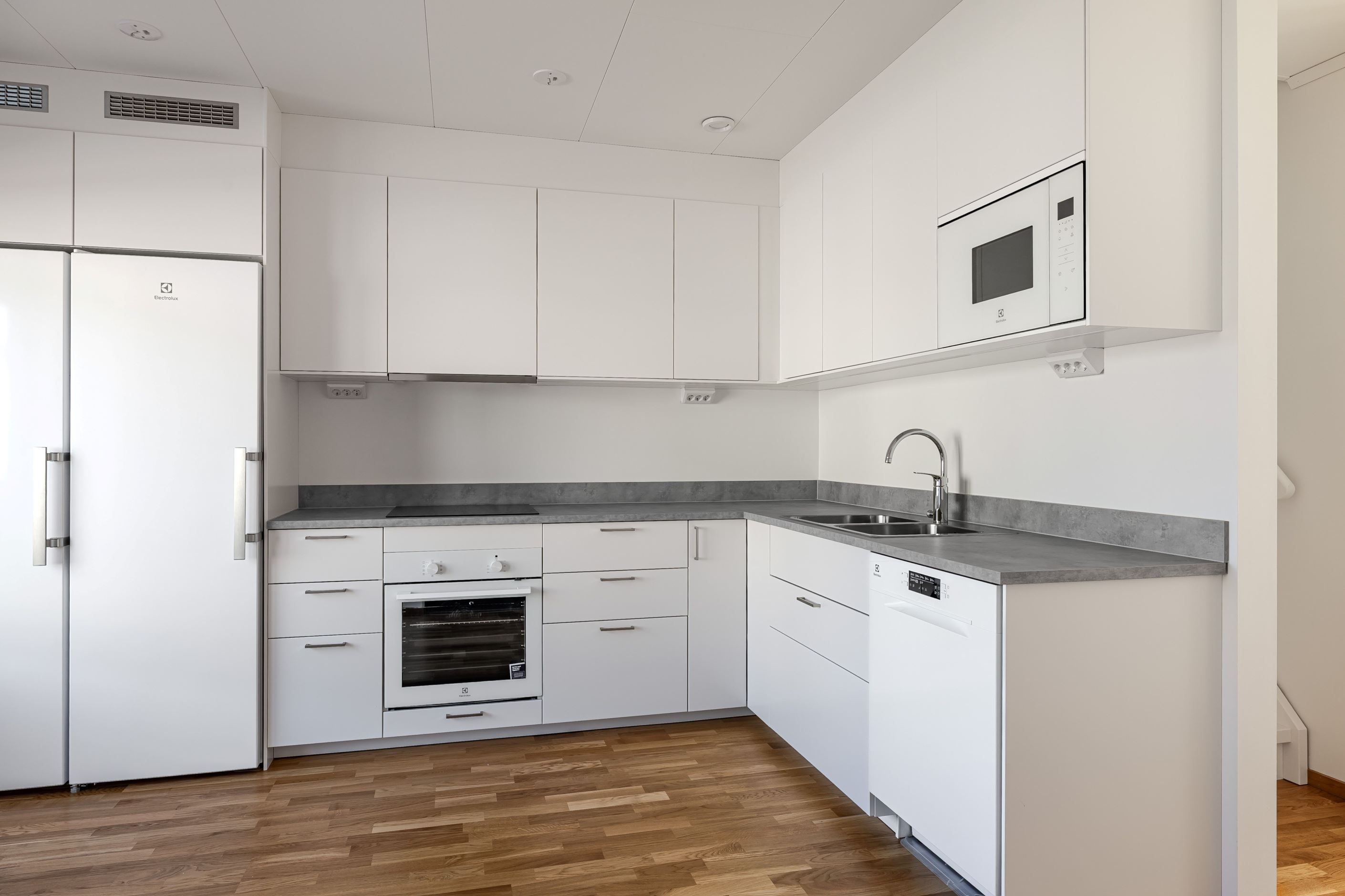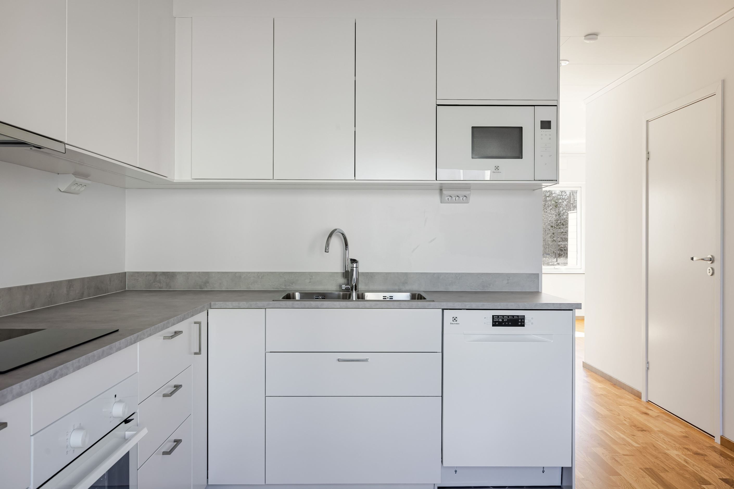 Läckert kök i vitt utförande med mycket bra och energisnåla vitvaror. Gott om plats för matbord.