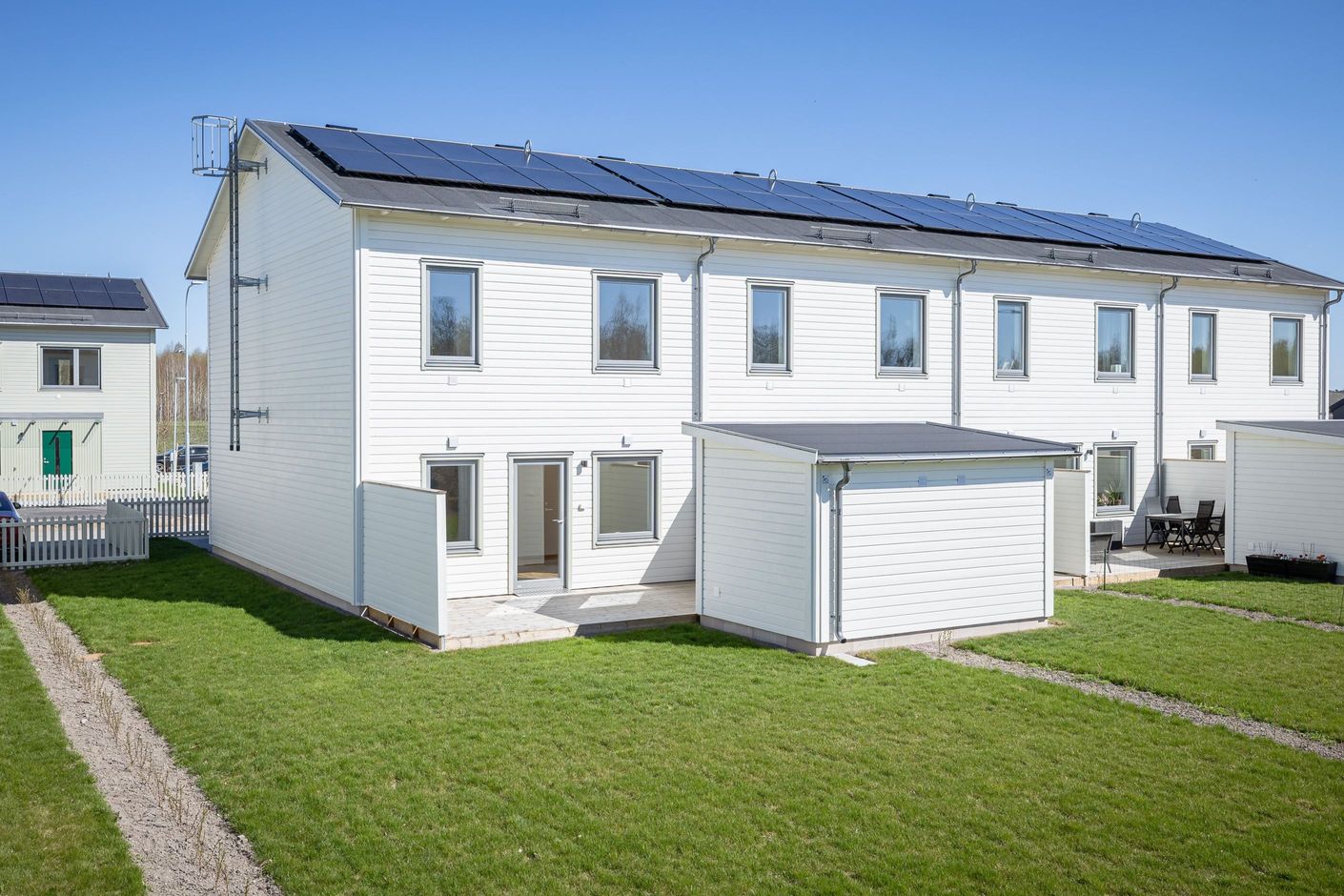 Huset har solceller installerat på taket, som genererar mellan cirka 3 500 - 4 200 kWh/år och hus vilket bidrar till lägre elkostnad. Varje hus har en egen parkeringsplats, platserna är förberedda för laddstolpe. Elen du producerar kan du antingen använda själv eller sälja vidare till elnätet. Detta är dessutom ett Svanenmärkt hus med energieffektiv och bra isolering, energisnåla vitvaror och effektiv värmeåtervinning som håller nere driftkostnaderna. Det innebär också att huset ger möjlighet till Grönt bolån, dvs lägre ränta!