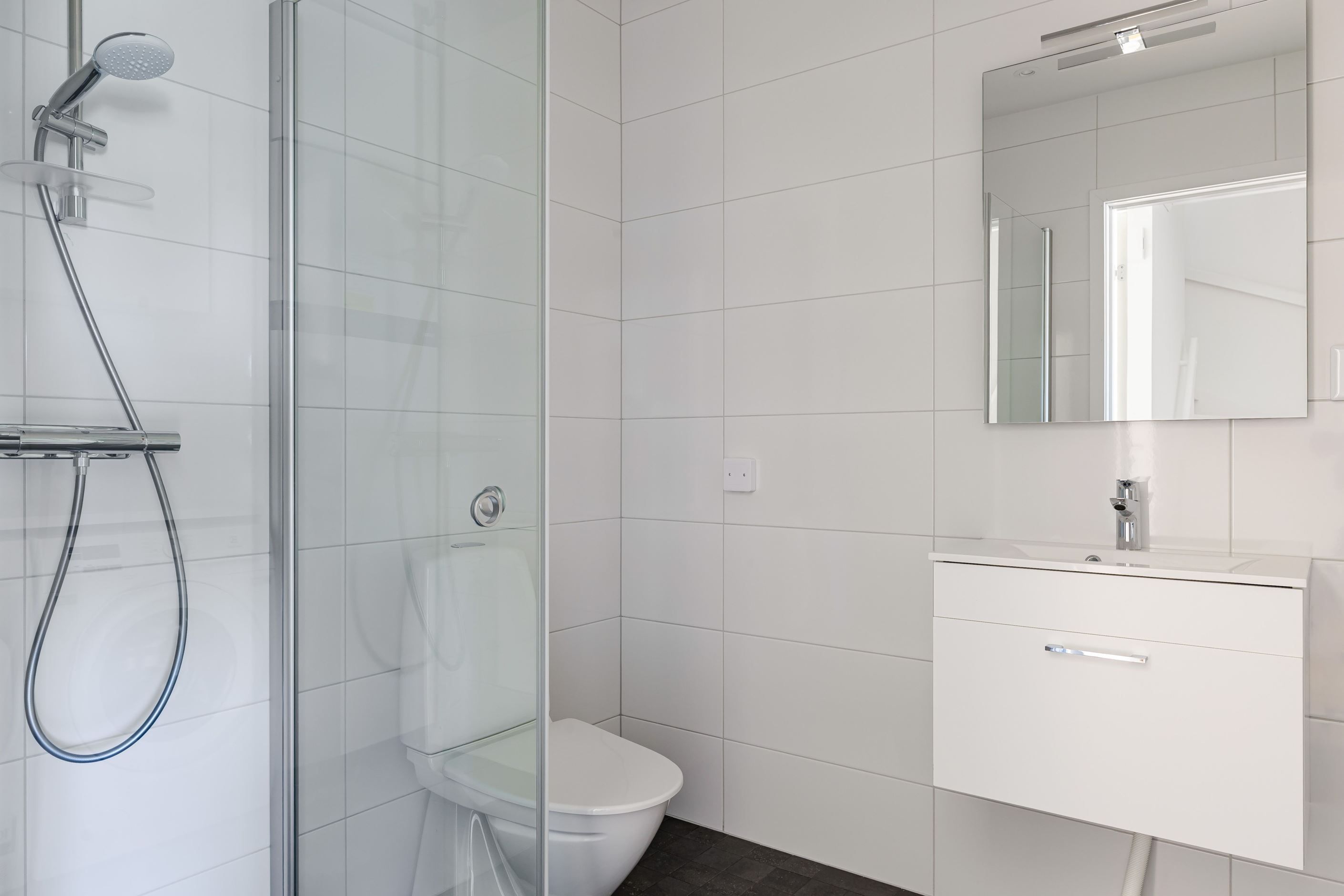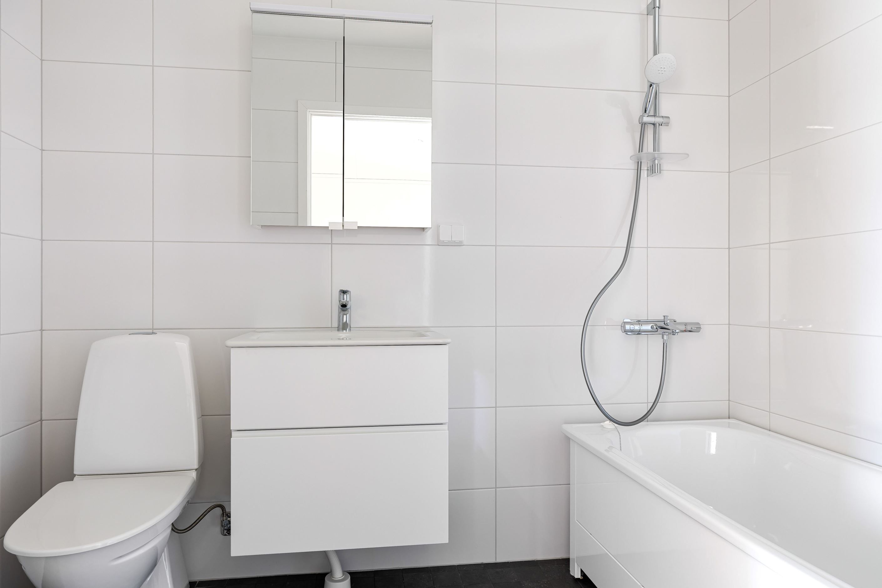 Från hallen nås ett fint duschrum med snyggt kakel och klinkers. Inrett med duschhörna, wc, handfat i kommod med spegelskåp och spotlights.