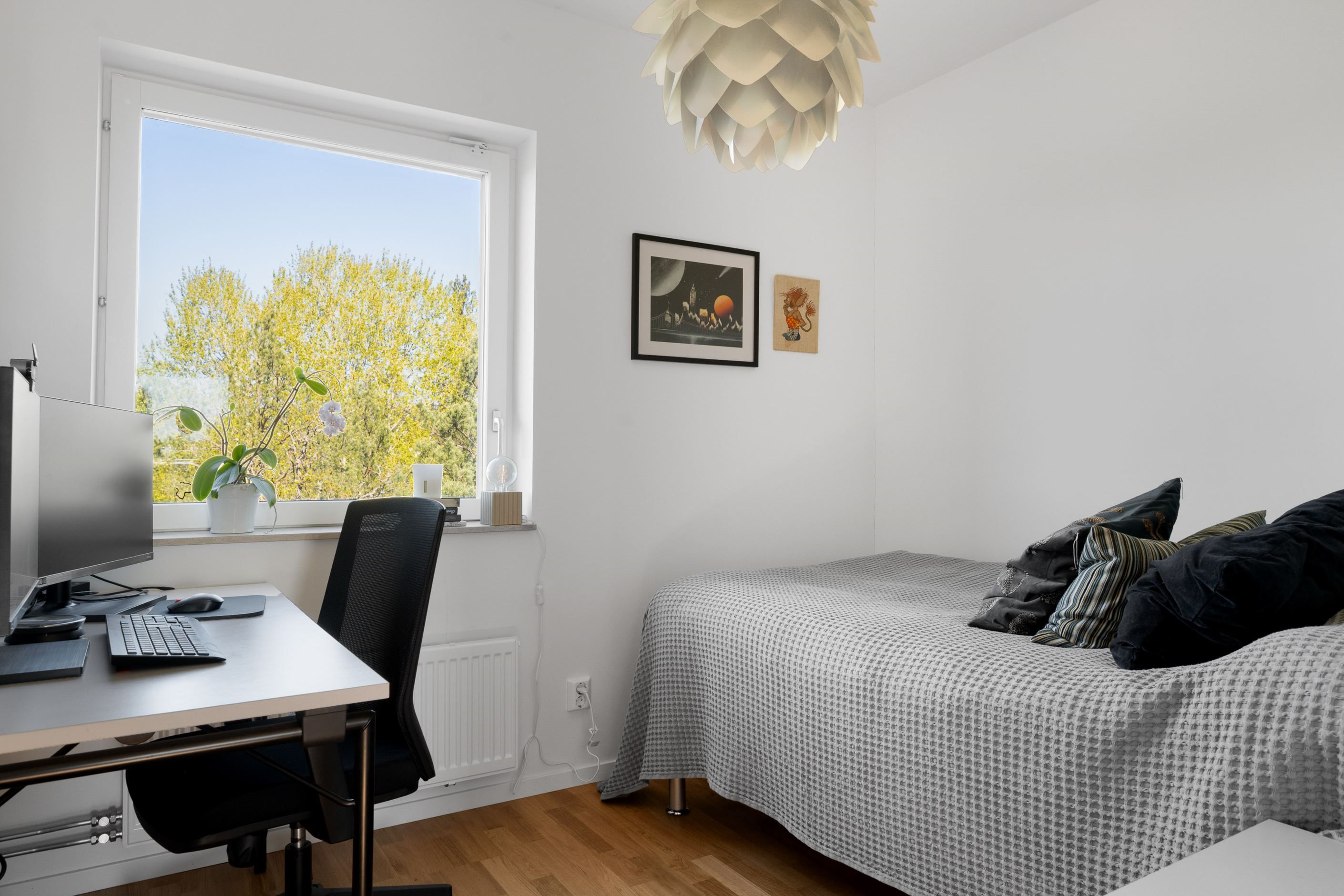 Stort allrum/vardagsrum. Finns behov av ytterligare ett sovrum går detta rum enkelt att göra om. Tre stora och välplanerade sovrum. Helkaklat badrum med golvvärme. Här finns wc, handfat med kommod, badkar, tvättmaskin och torktumlare. Förråd. En trappa upp når man bostadens trevliga takterrass.
