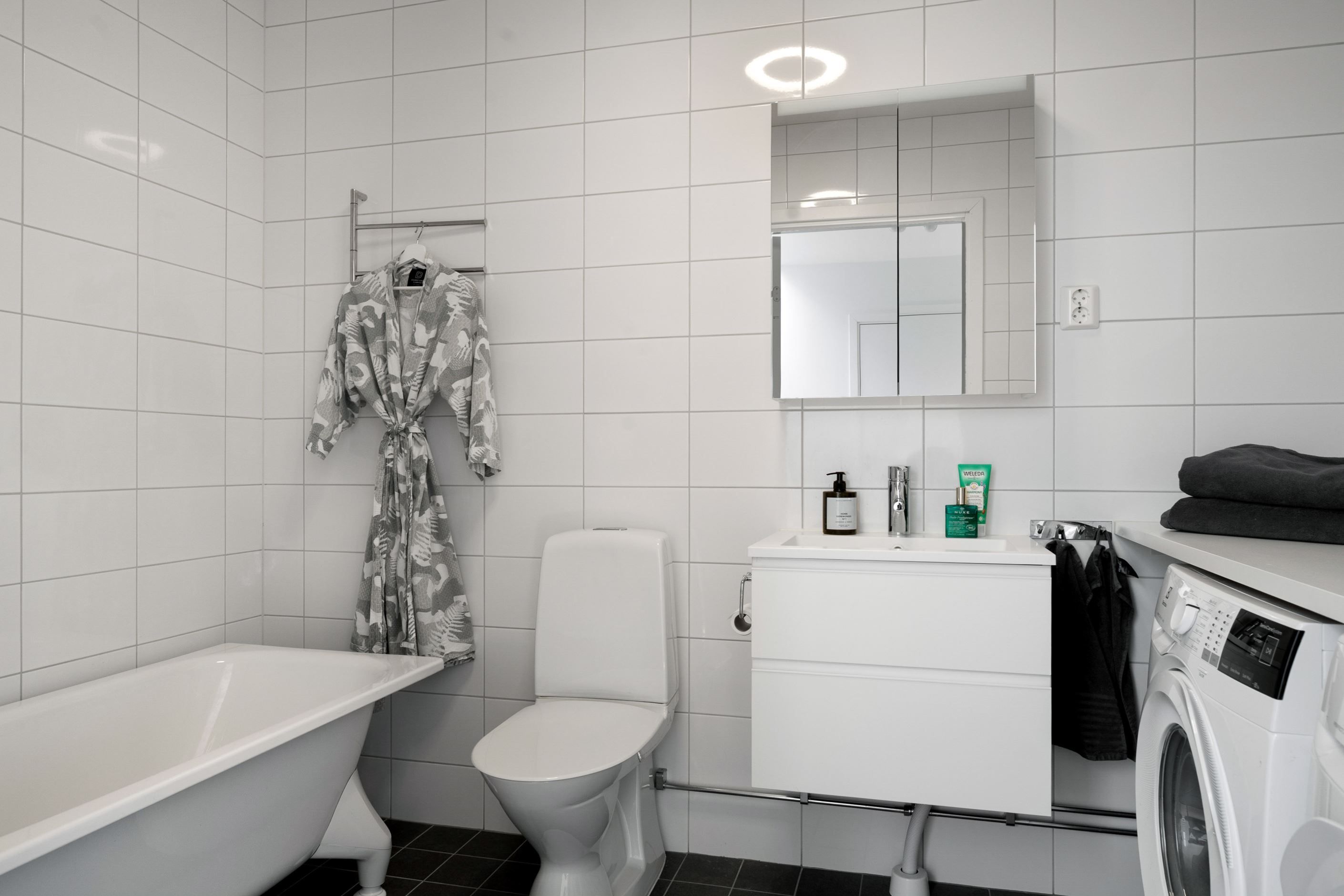 Entré till hall med klinkergolv och plats för avhängning, direkt till vänster om hallen finns ett förråd. Helkaklat badrum med wc, handfat med kommod och duschhörna. Kök och vardagsrum i trevlig öppen planlösning och utgång till balkong. Kök med gråa skåpsluckor och bänkskiva i sten. Den maskinella utrustningen består av ugn, micro, spis, vinkyl, kyl och frys.