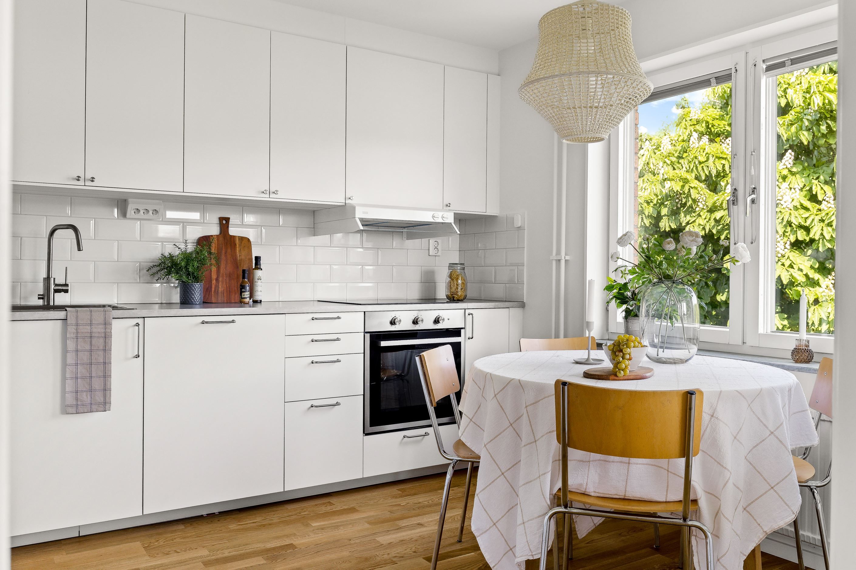 Fräscht och komplett utrustat kök i stilrena toner med både arbetsytor och förvaringsmöjligheter samt plats för matbordet invid trevligt hörnfönster.