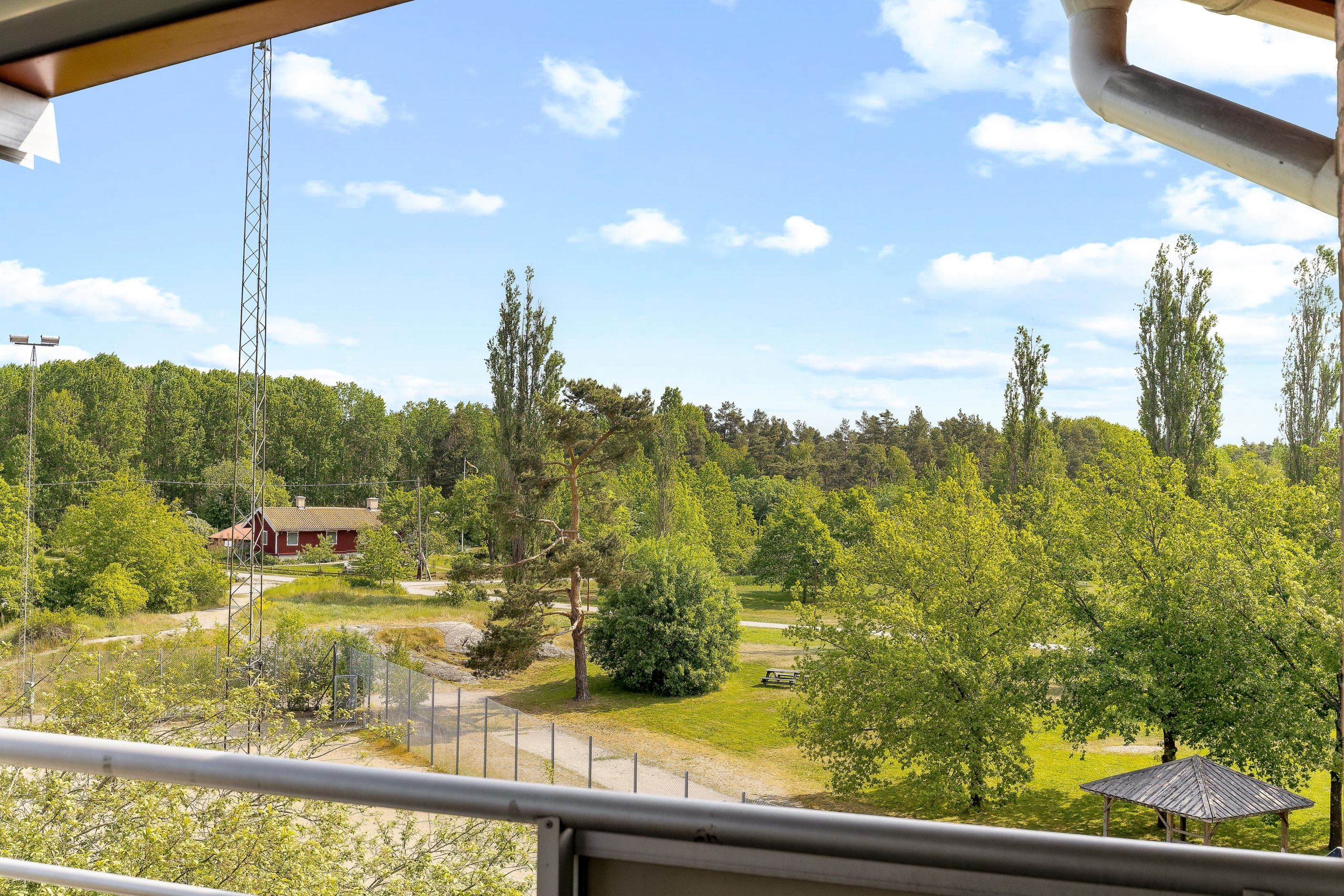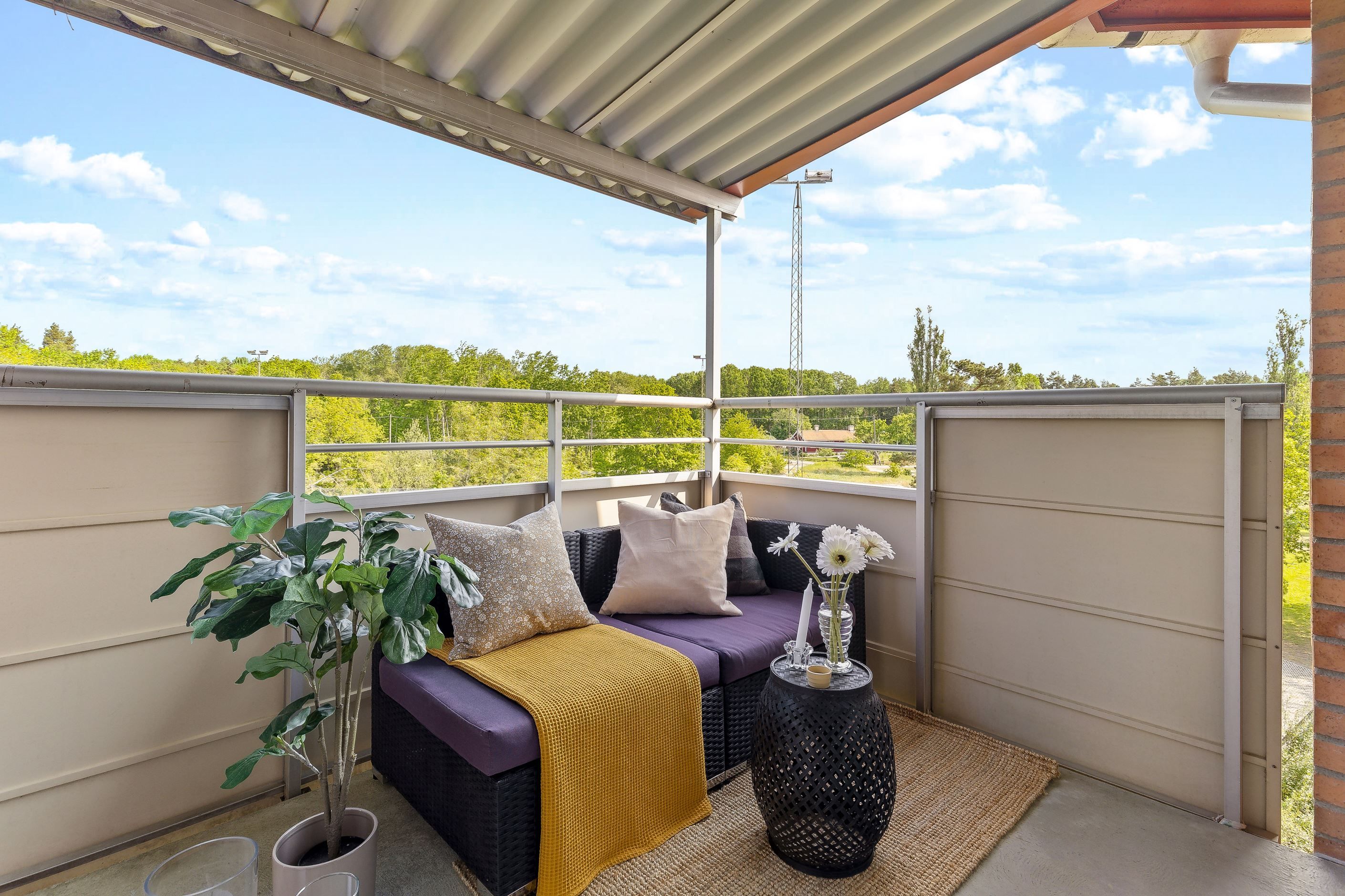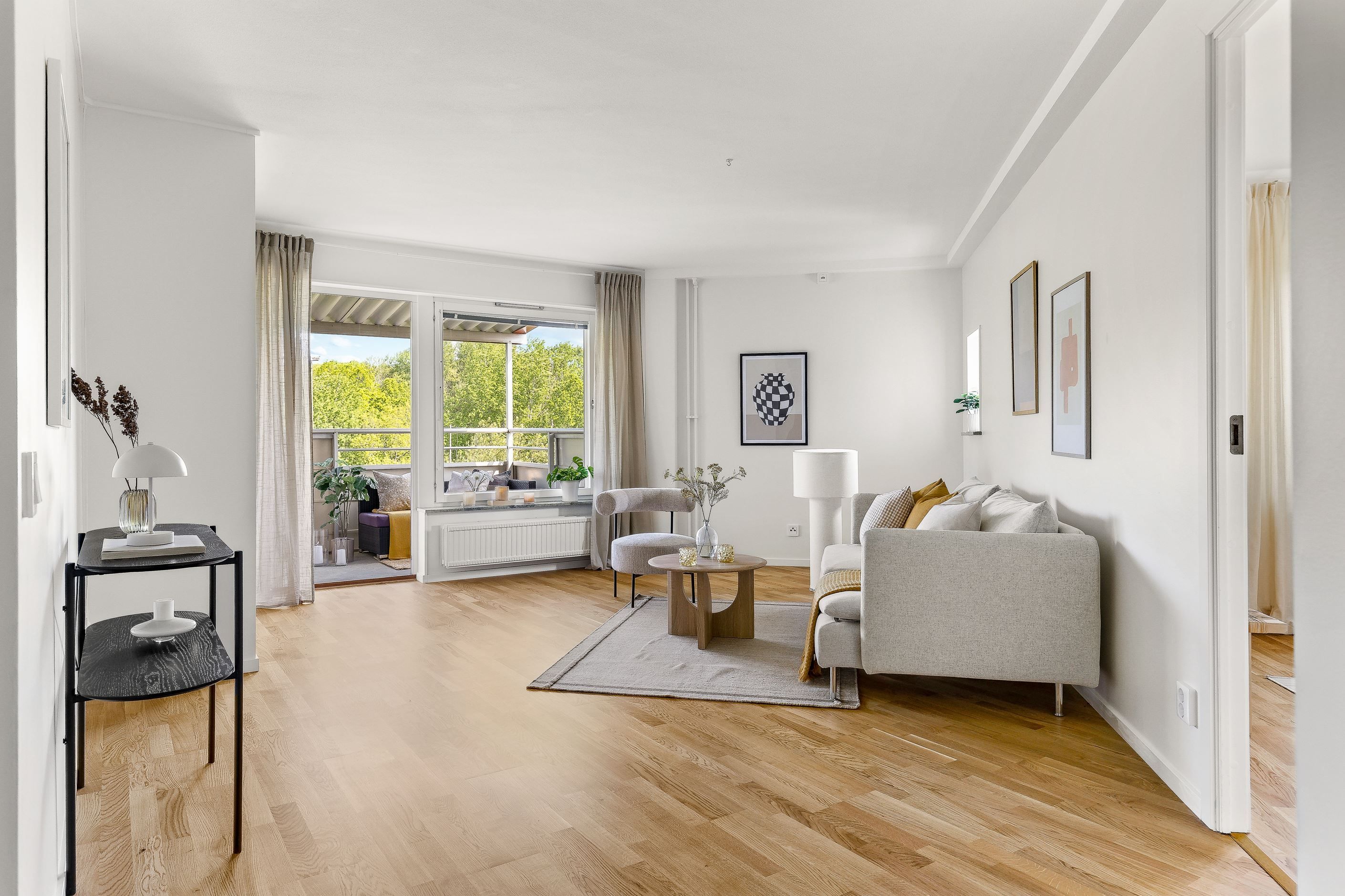 Det sociala och ljusa vardagsrummet får ett rikligt ljusinsläpp tack vare det breda fönsterpartiet i anslutning till balkongen. Den trevliga balkongen har plats för både balkongmöbler och växter samt bjuder på sol tidig morgon och sen kväll ihop med en lummig och ostörd utsikt.