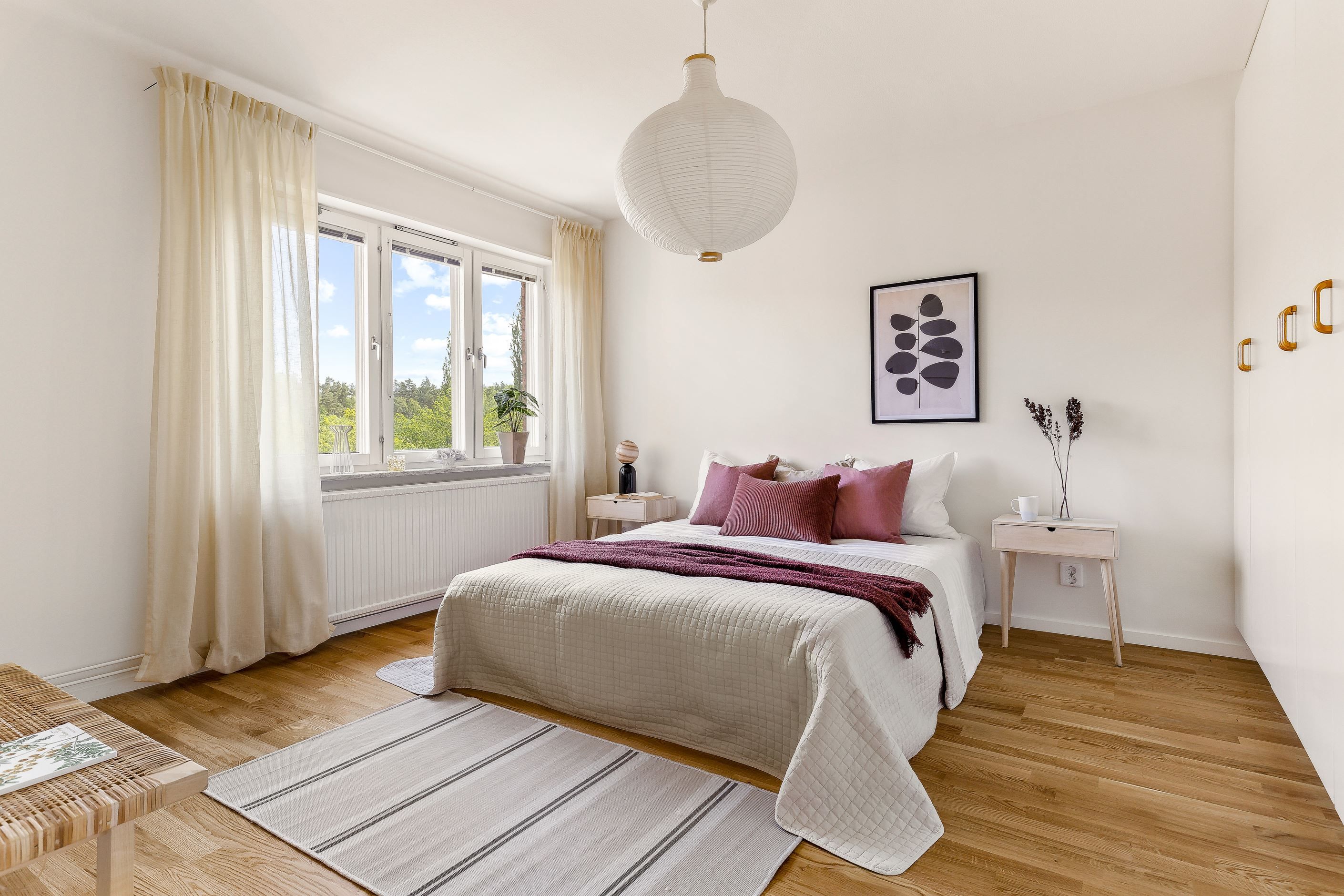 Sovrummet är tilltaget i storlek med gott om plats för dubbelsäng med sängbord och erbjuder rikligt med förvaring genom garderober längs med ena väggen.
