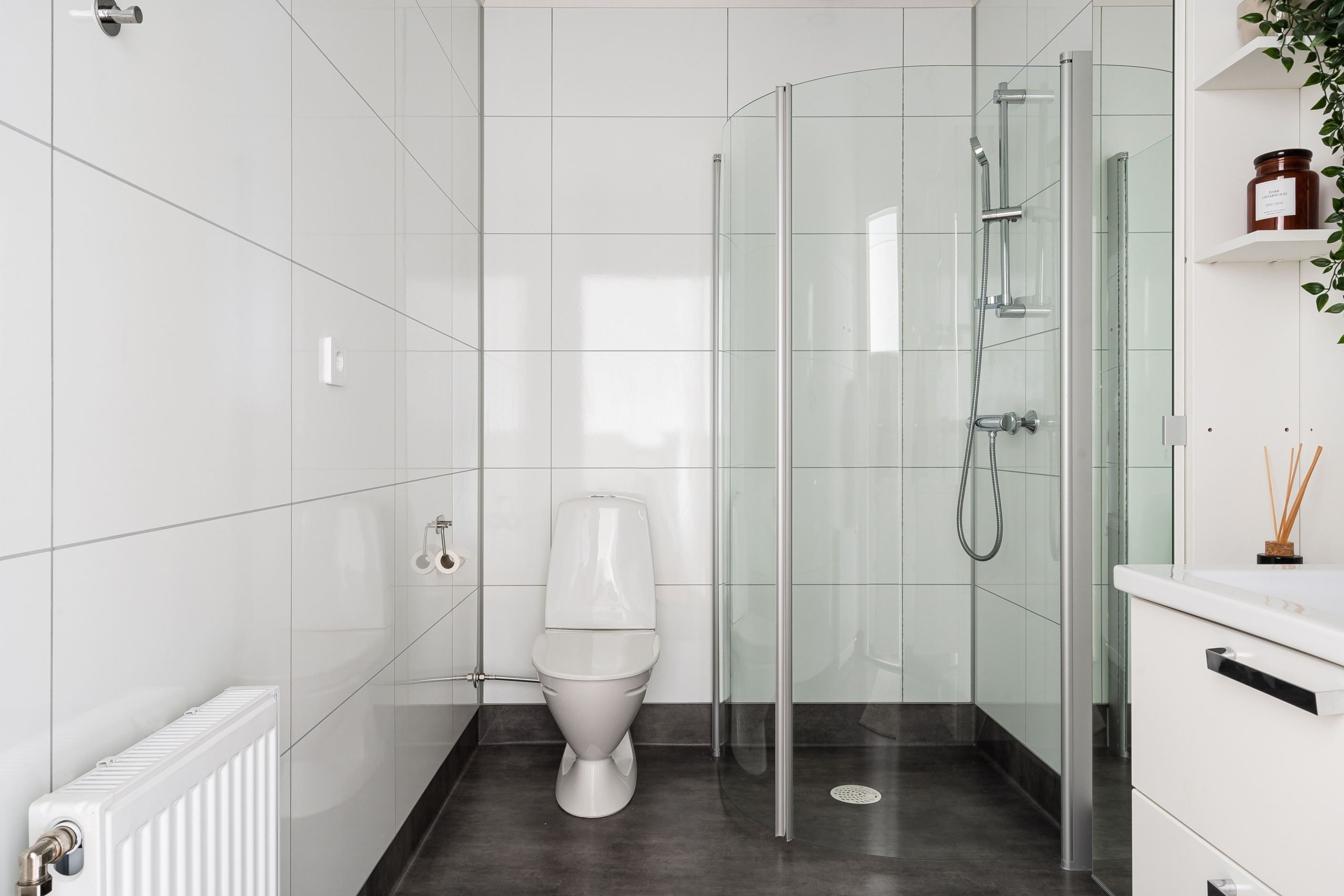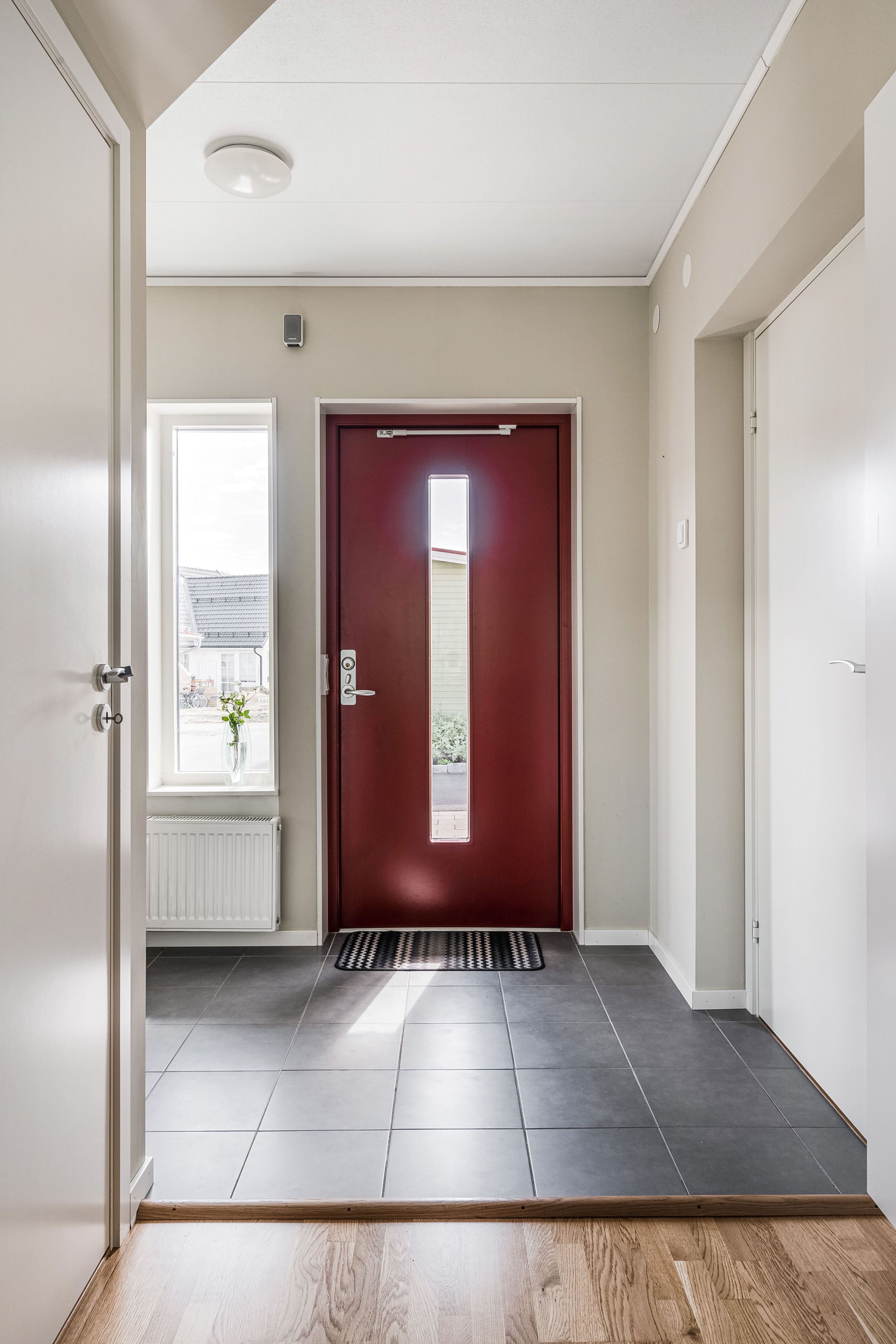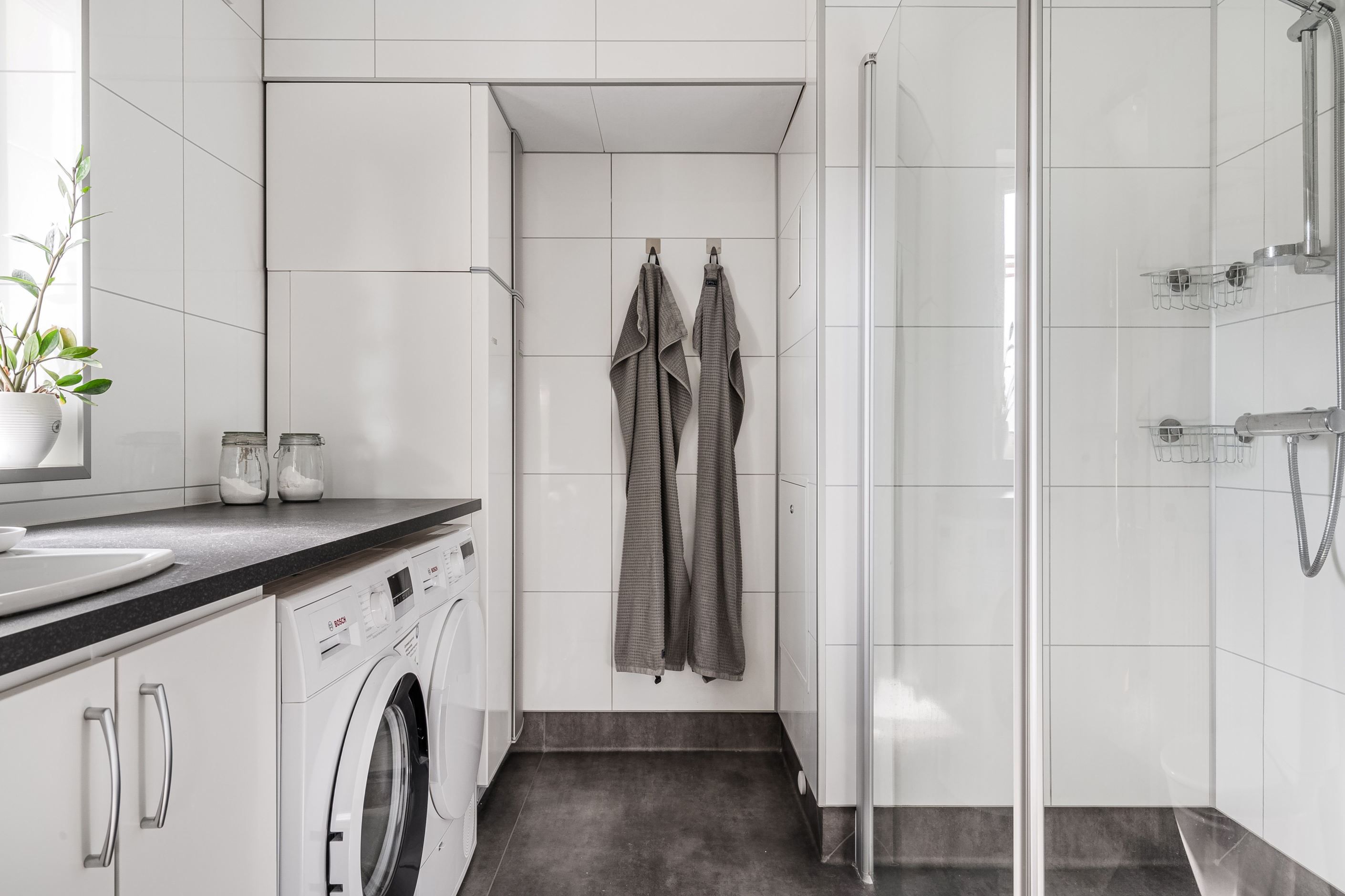 Entréplanet präglas av sociala ytor och smarta lösningar. Den rymliga hallen välkomnar med gott om plats för avhängning och förvaring, snyggt klinkergolv och behaglig vattenburen golvvärme. Det moderna köket ligger i öppen planlösning mot matplats och vardagsrum – perfekt för både vardagsliv och trevliga middagar med familj och vänner. Här binds ytorna samman på ett naturligt sätt och skapar ett hem där det är lätt att umgås. På entréplanet finns även ett stilrent badrum kombinerat med tvättstuga, utrustat med WC, handfat, dusch samt tvättmaskin och torktumlare.