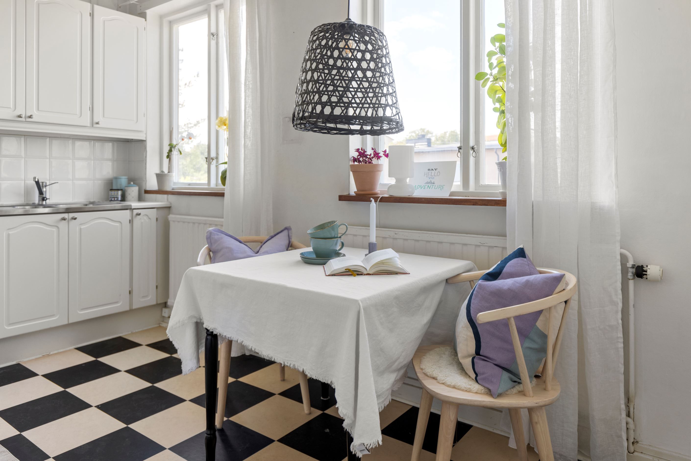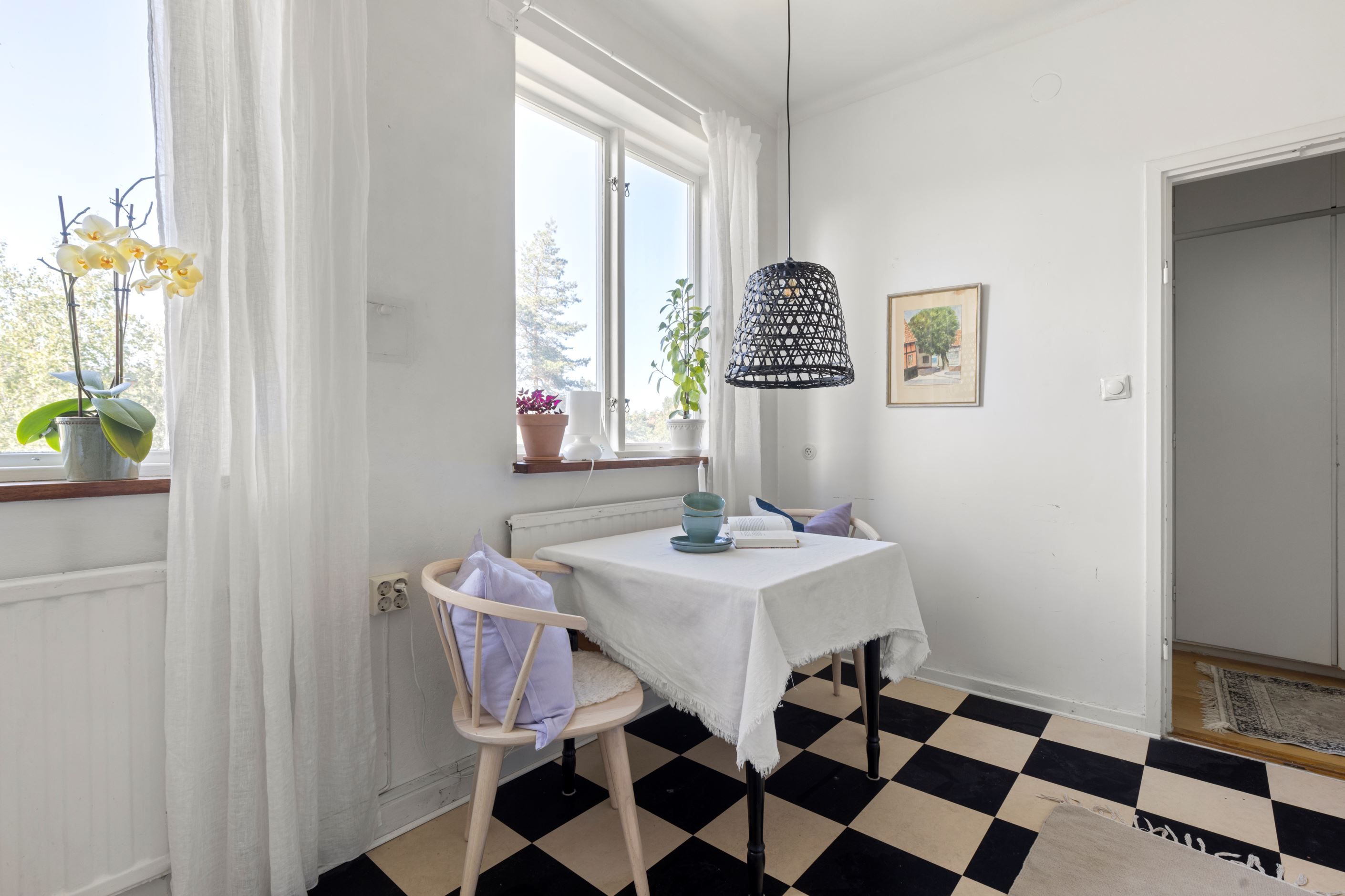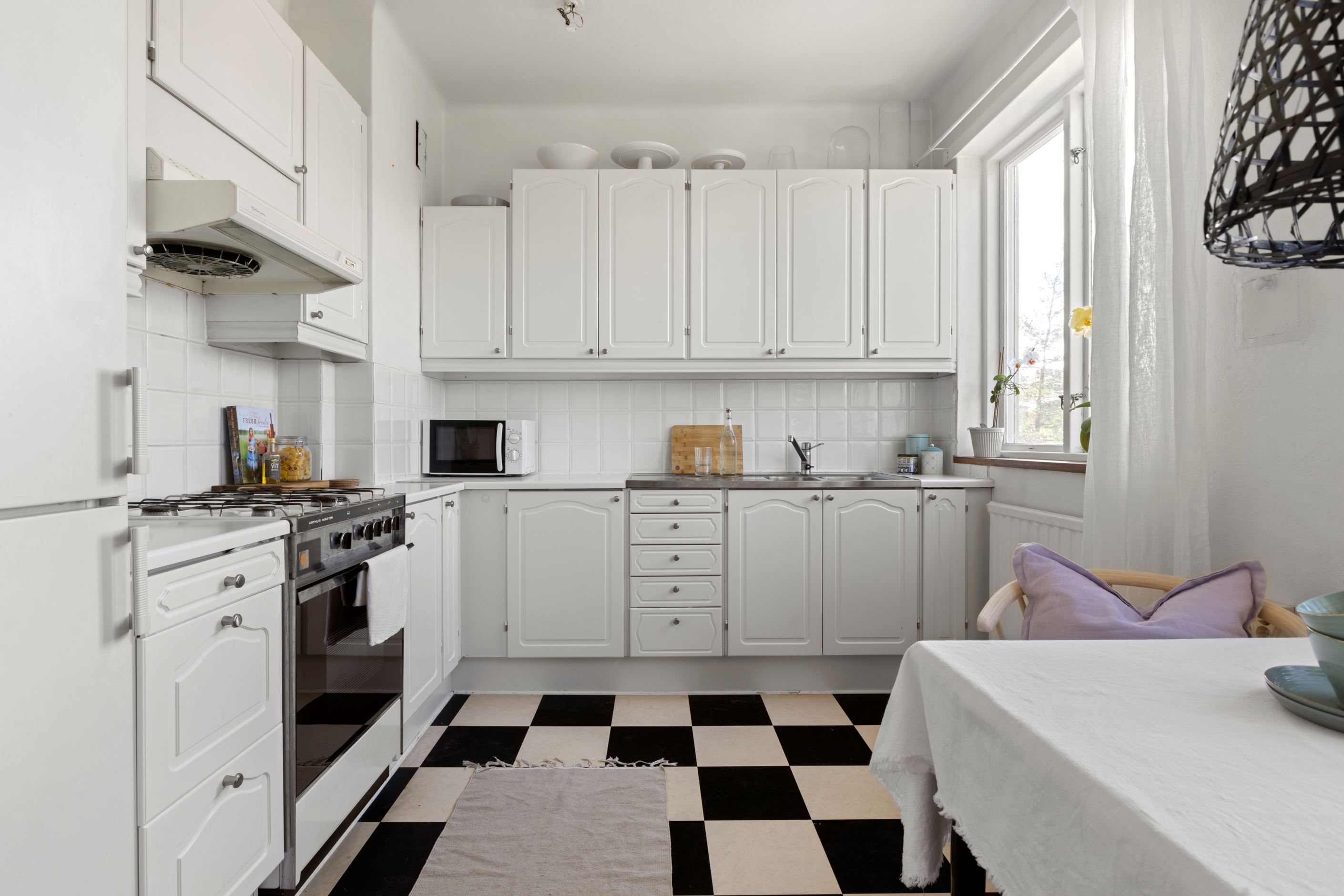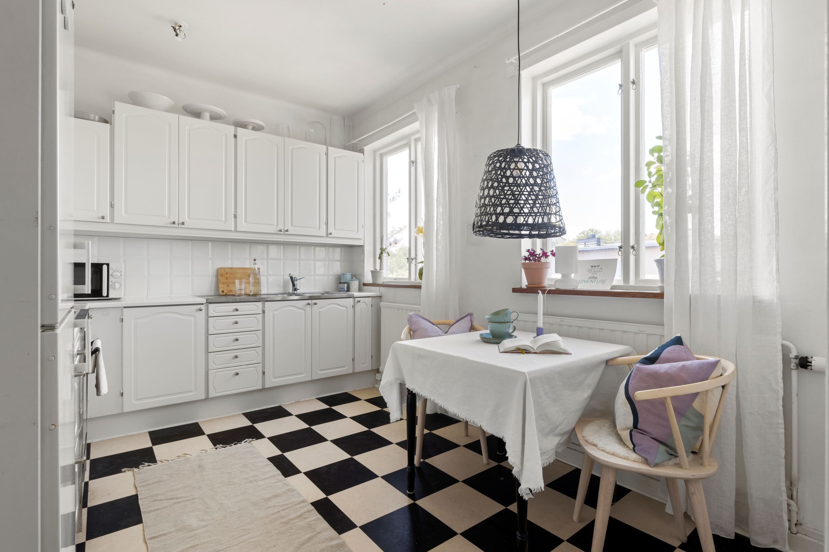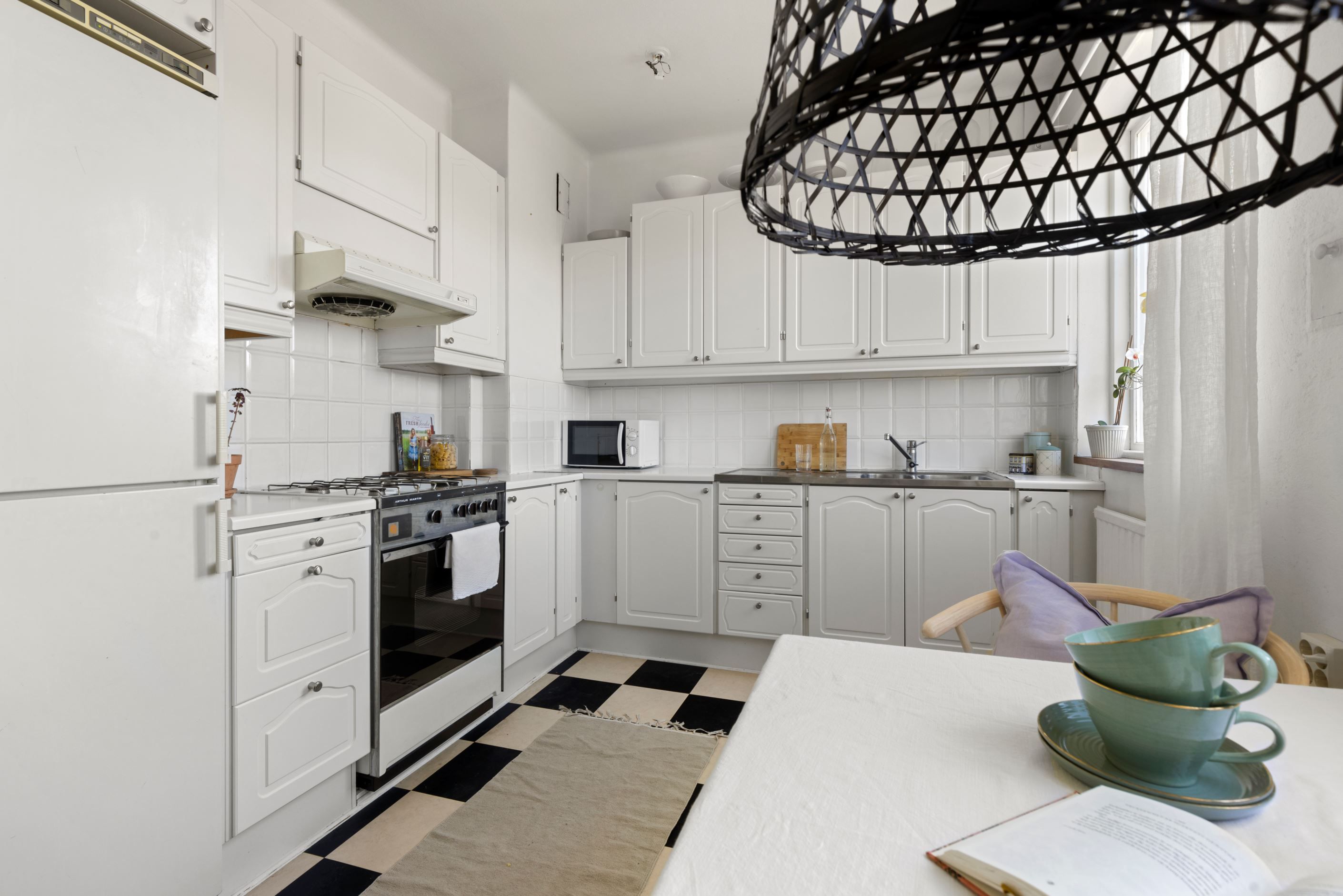 Denna trivsamma och ljusa lägenhet finner ni högst upp i huset med lummig utsikt från allrummet. Genomgående moderna färg- och materialval och mycket funktionell planlösning som passar för såväl en som två personer. Möjligheten finns att göra om till en tvåa genom att skapa ett mindre sovrum i köket. Bostaden är i gott skick och har fina detaljer som bevarats sedan byggåret som fönster, innerdörr och fönsterbrädor. Allrummet är stort och lättmöblerat och i köket finns det gott om arbetsytor och förvaring samt plats för matbord. Vidare finns även ett helkaklat badrum och en hall med bra förvaringsutrymmen i tre platsbyggda garderober. Genomtänkt, ljus och rymlig är tre ord som minst sagt är representativa för denna fantastiska lägenhet.