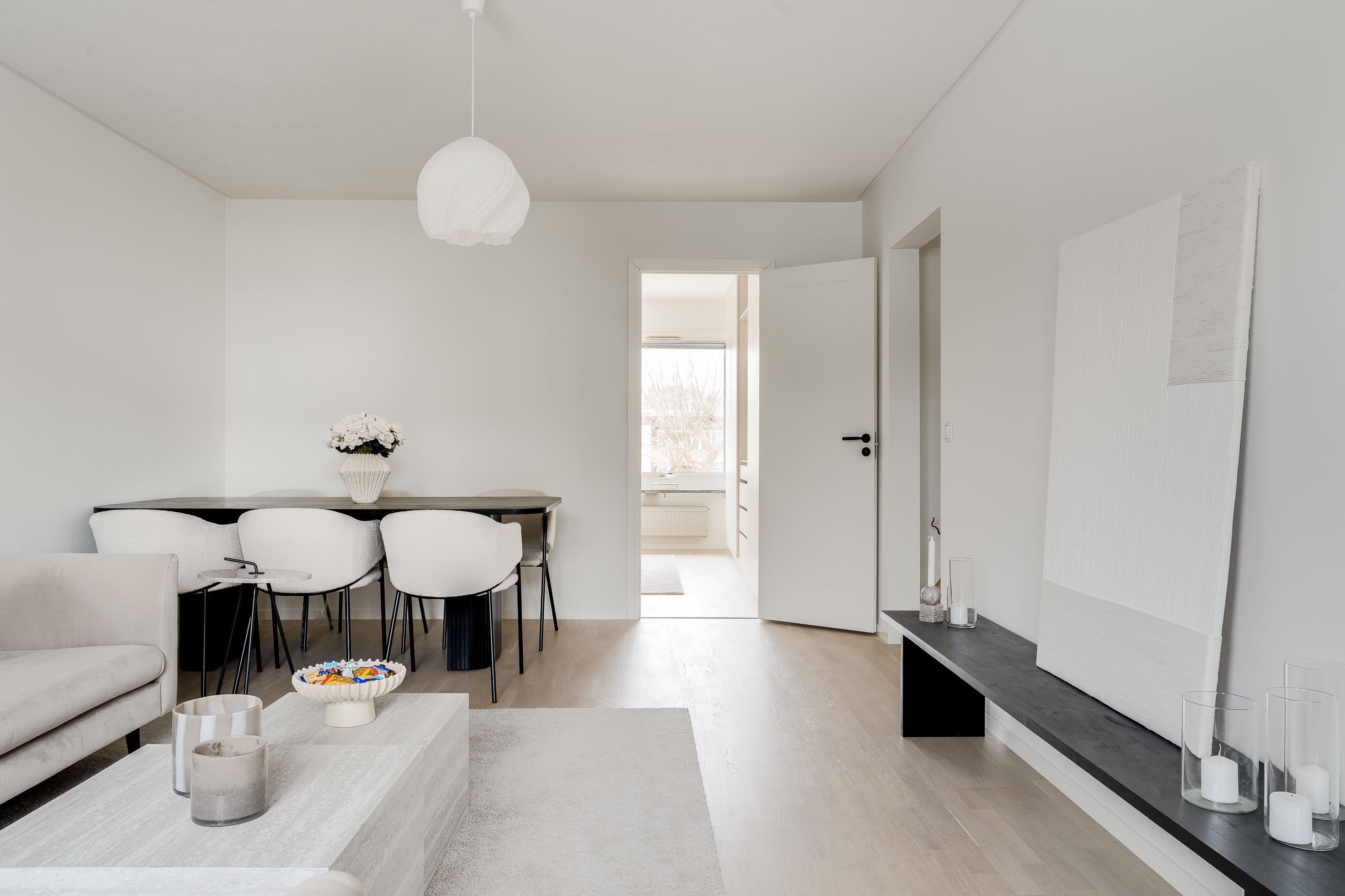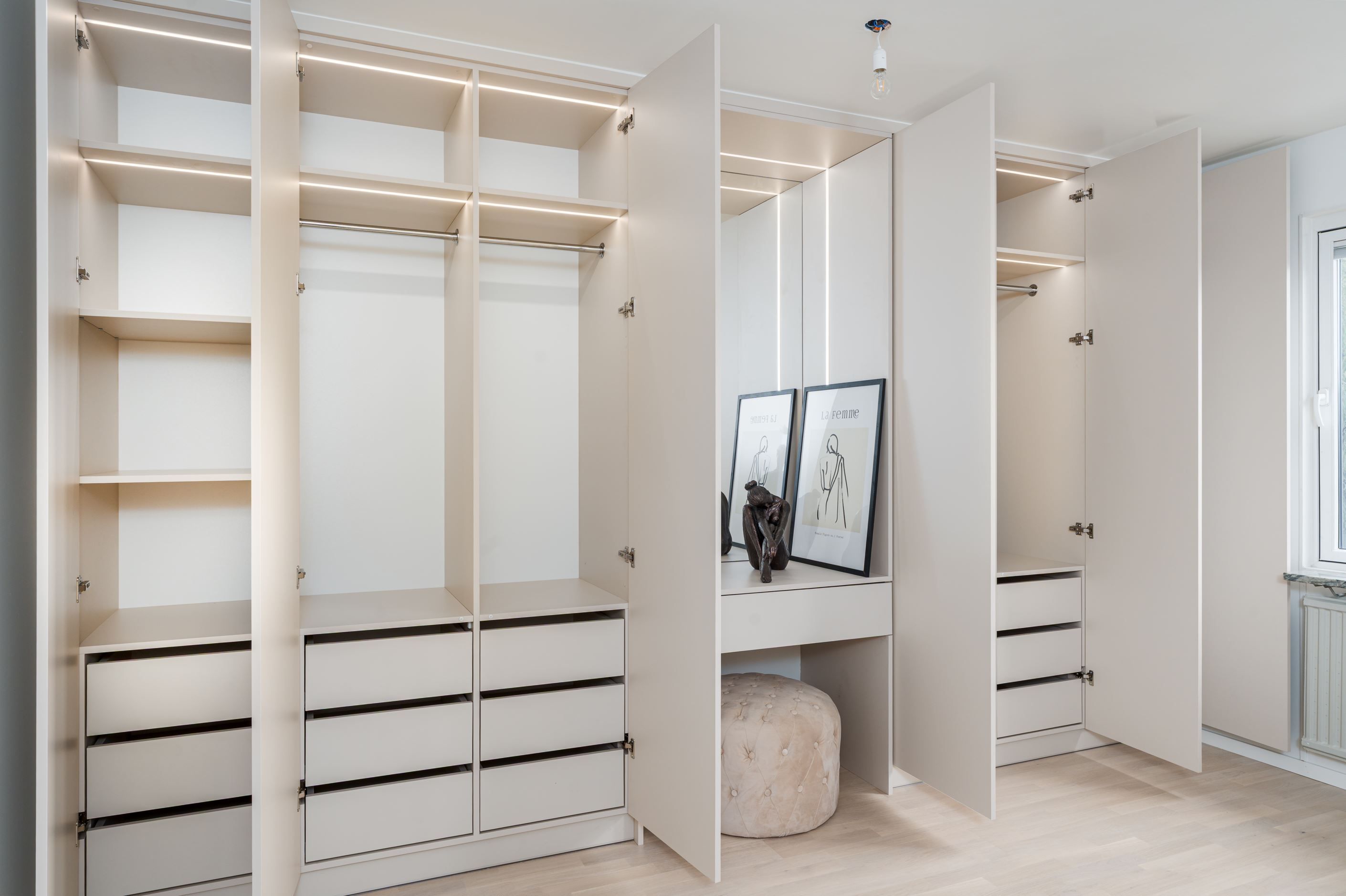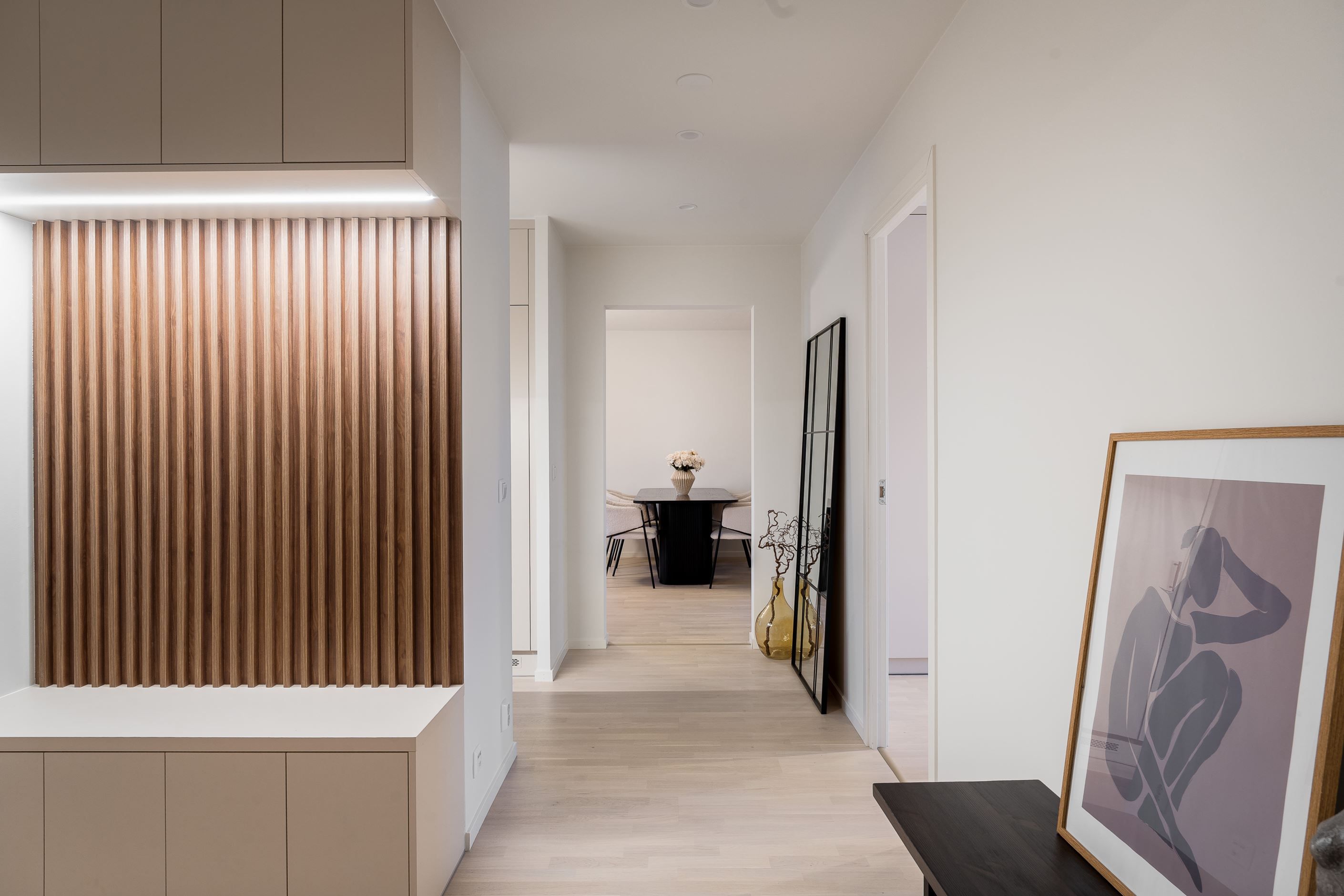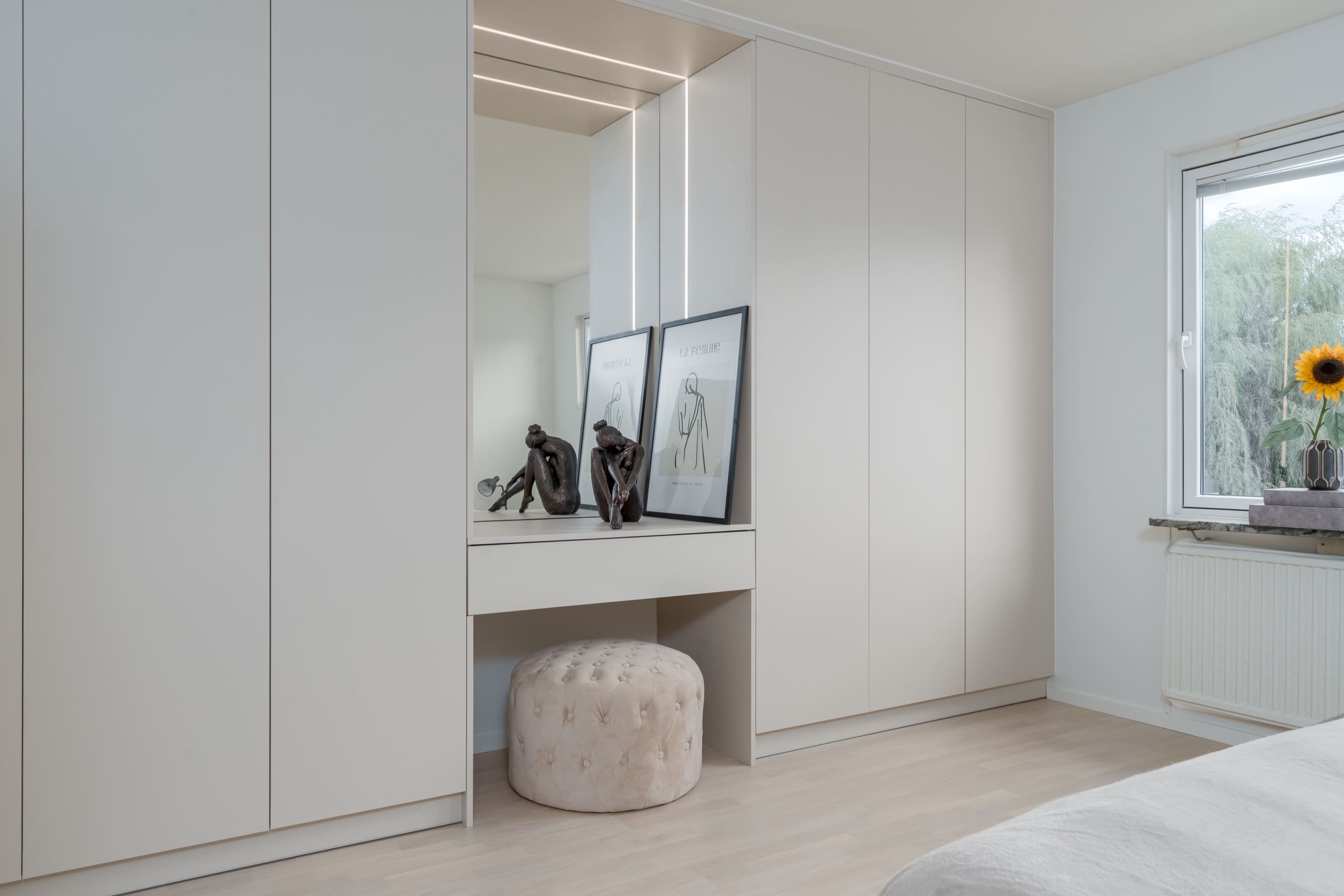Samtliga sovrum är utrustade med platsbyggda garderober med inbyggd belysning, vilket ger ett stilrent intryck och mycket goda förvaringsmöjligheter. Här finns gott om plats för både kläder och förvaring utan att kompromissa med rummens rymd. Även hallen är smart planerad med en platsbyggd sittplats samt inbyggd förvaring både upptill och nertill – en praktisk och välkomnande lösning som förenklar vardagen.