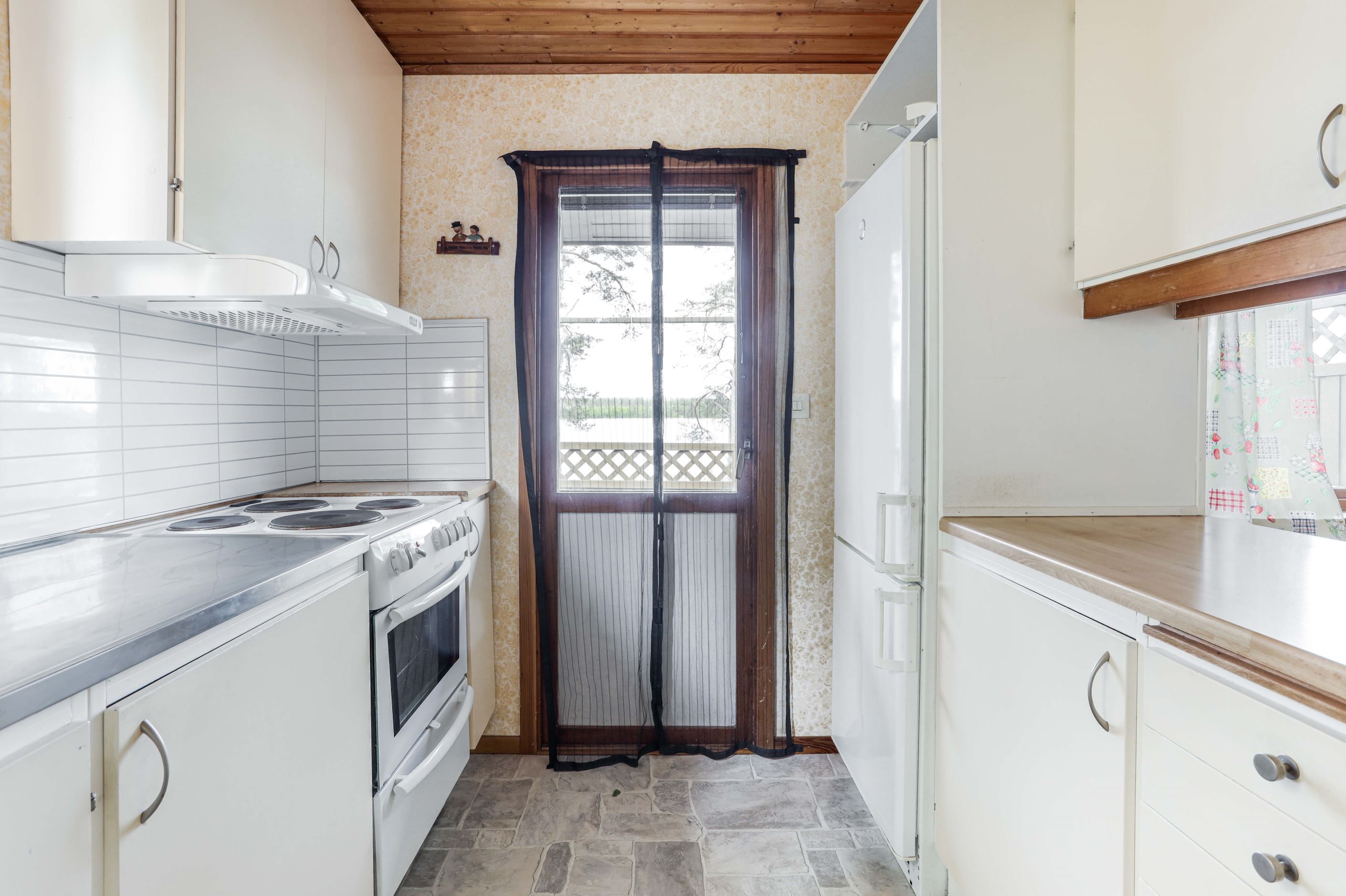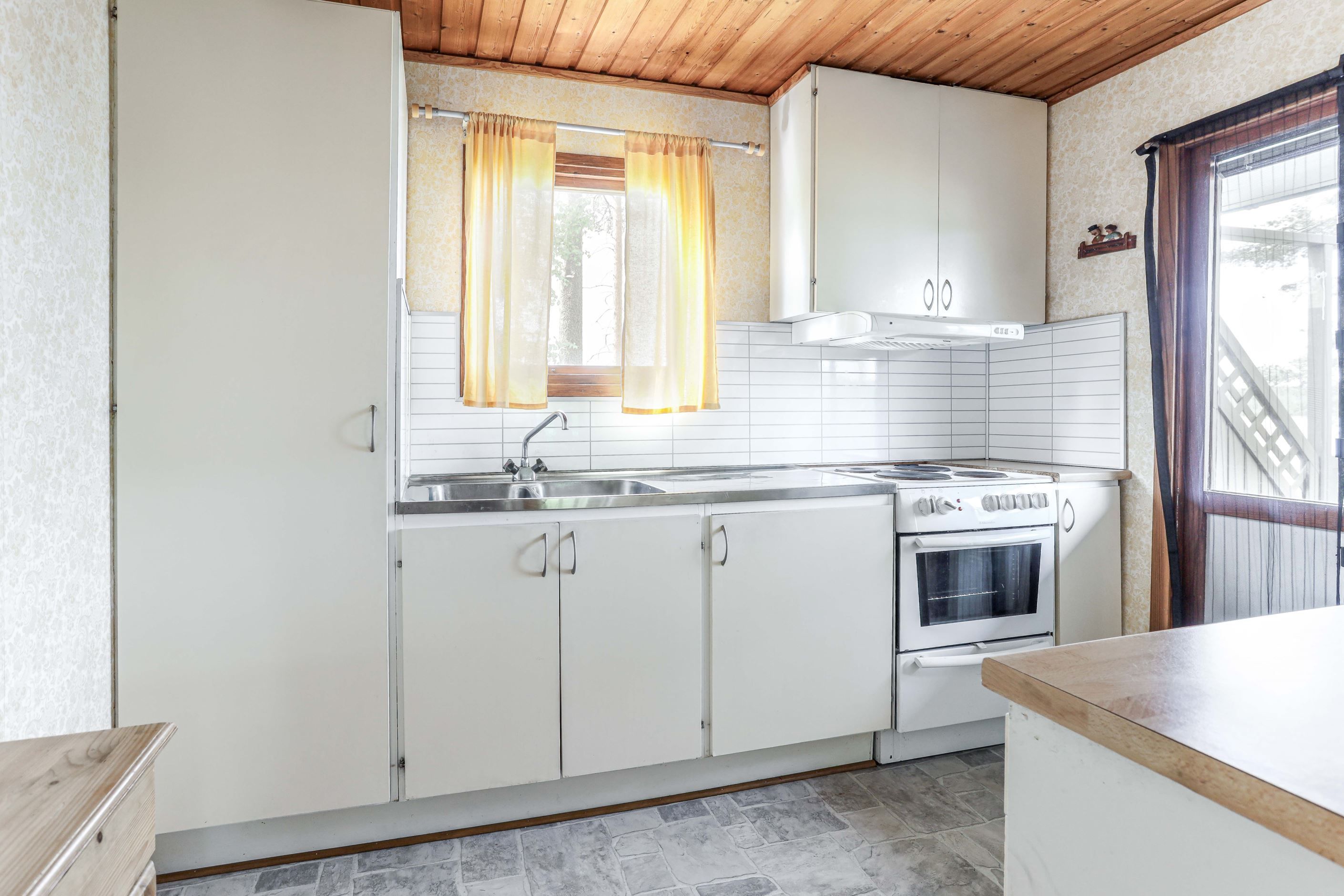 Huset erbjuder en perfekt kombination av en hall med plats för avhängning av kläder. Kök som går i vitt, dubbla diskho, spis med ugn, fläkt, ovan diskbänk sitter trespo skivor, kyl och frys. Fin matplats. Altanen nås från köket.Ett inbjudande vardagsrum för umgänge med fyra fönster som ger fin utsikt mot sjön och ingen insyn. Ett praktisk badrum med wc, handfat och dusch, här finns även en vattenberedare på ca 80 l. En trappa upp utifrån på ena gaveln leder upp till ett vindsförråd.