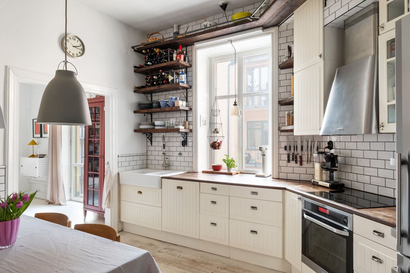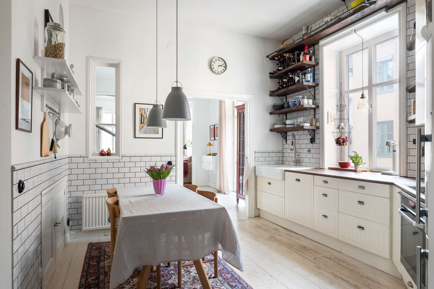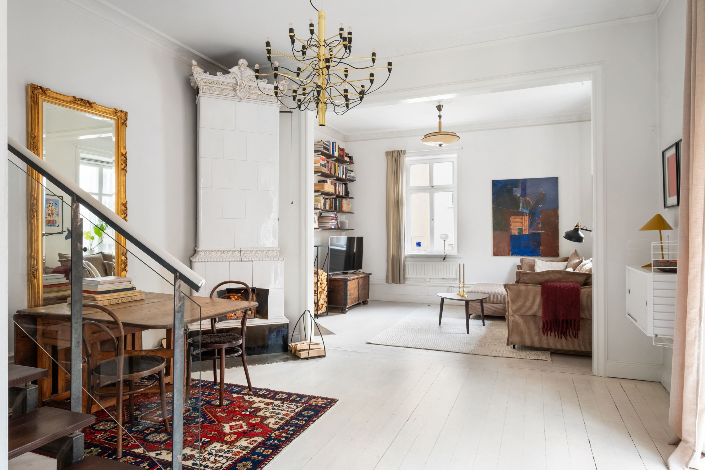 Redan vid första steget in slås man av den generösa takhöjden, det fantastiska ljusinsläppet från stora fönsterpartier, takfönster och balkong samt de välbevarade originaldetaljerna. Här samsas fungerande kakelugnar, stuckaturer, speglade nischer, synliga takbjälkar och vackra trägolv i en harmonisk helhet.