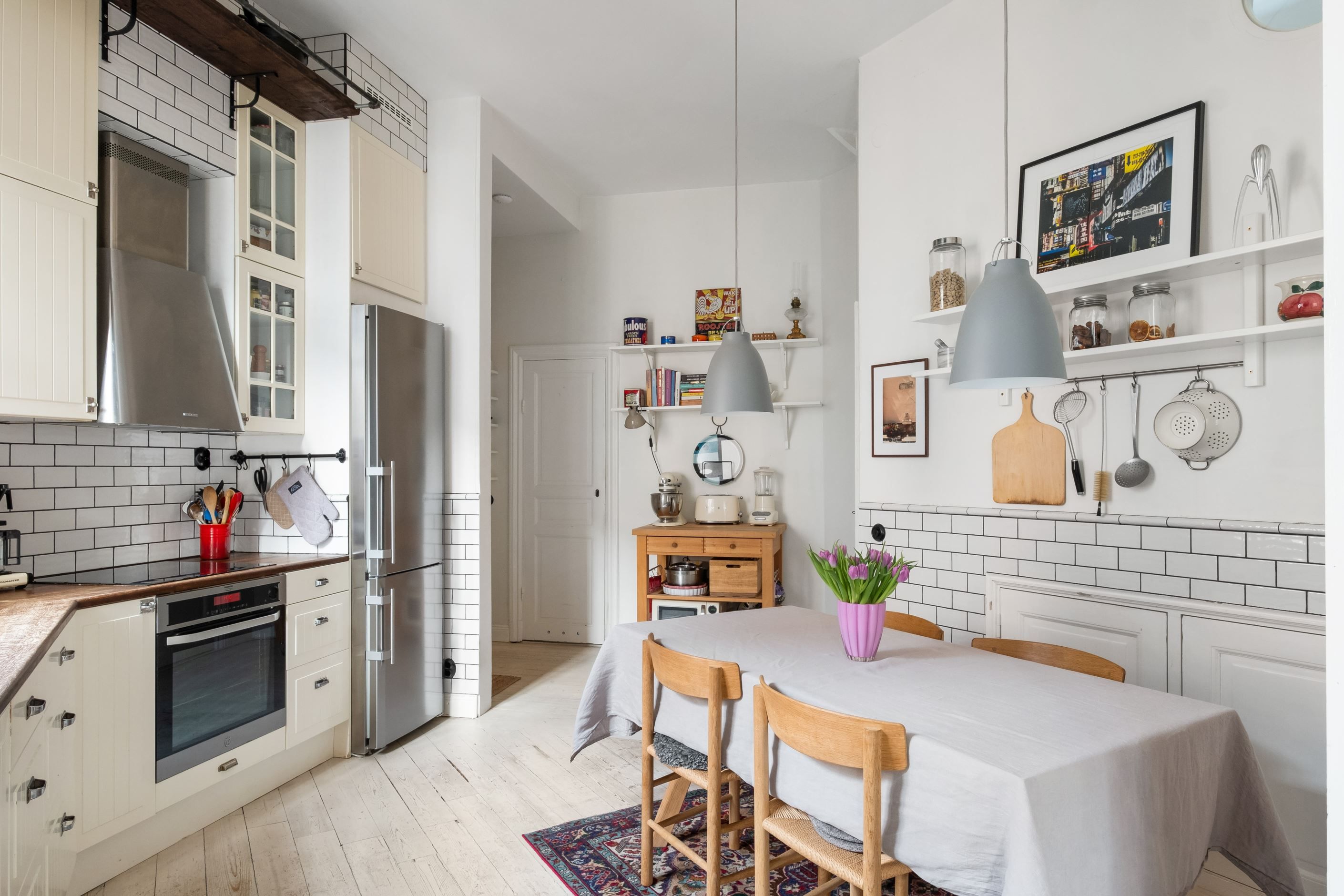 Bostadens sociala planlösning bjuder in till umgänge med ett öppet samband mellan det fullt utrustade och stilrena arbetsköket, matsalen och vardagsrummet – perfekt för både vardag och fest. Här finns även en balkong som vetter mot den lugna gården och ger en härlig plats för morgonkaffet eller kvällens sista glas.