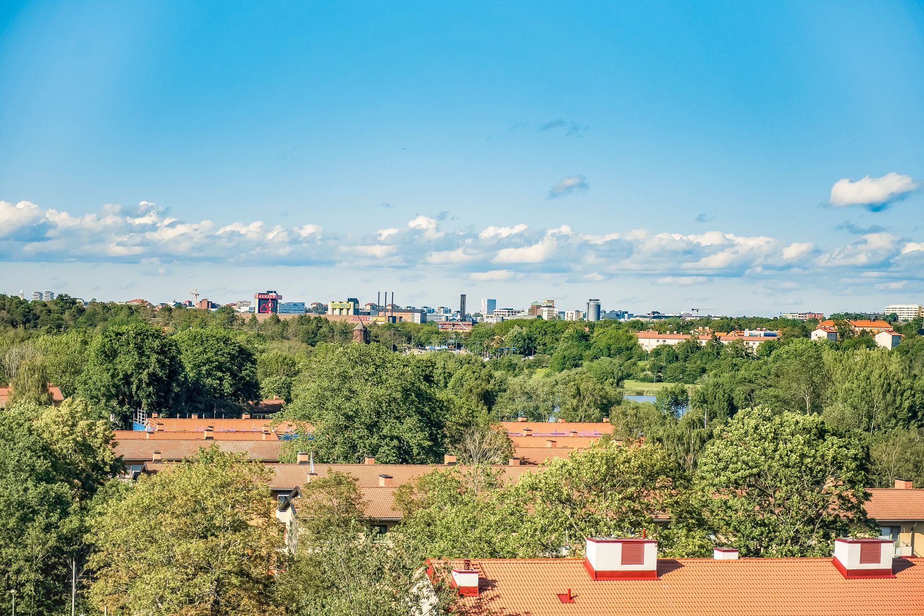 Milsvid utsikt över trädtoppar och takåsar från samtliga lägenhetens fönster