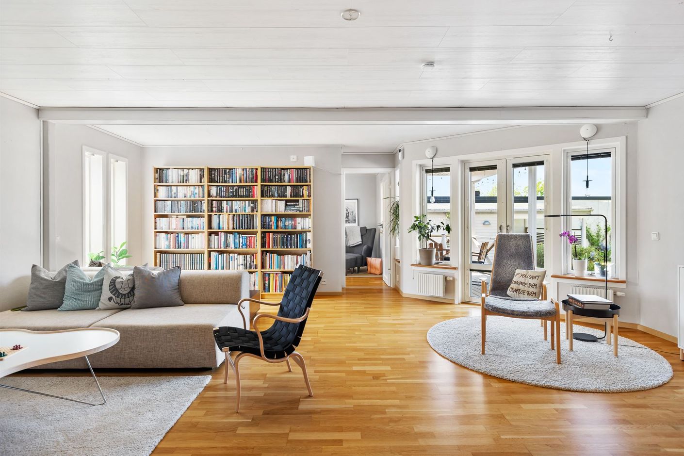 Vardagsrummet är ljust och rymligt med stora fönsterpartier och altandörrar som leder ut till en generös altan i västerläge. Här kan du njuta av eftermiddagssolen och kvällsljuset i ett lugnt och privat läge. Badrummet är helkaklat och utrustat med badkar, inbyggda badrumsskåp, tvättställ, WC och handdukstork. Dessutom finns en gäst-WC i anslutning till hallen.