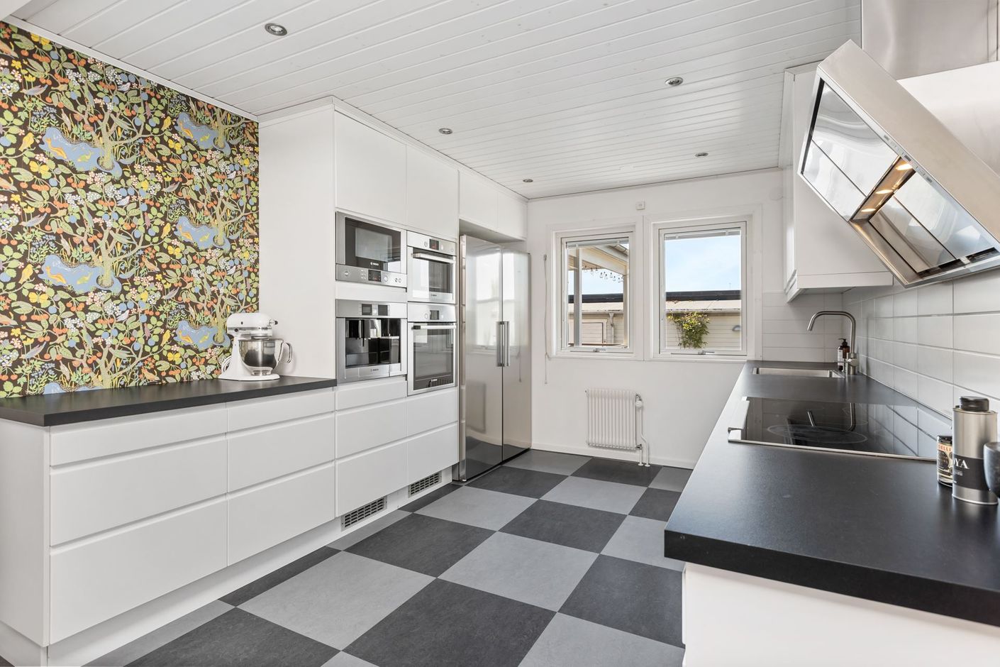 Det moderna köket är vitt med rostfria vitvaror placerade i bekväm arbetshöjd – både funktionellt och estetiskt. Ett takfönster släpper in ett vackert ljus som förstärker den luftiga känslan. En stilfull fondvägg med tapet från Svenskt Tenn ger rummet karaktär och personlighet. Här finns gott om plats för ett stort matsalsbord, perfekt för både vardagsmiddagar och festliga tillfällen.