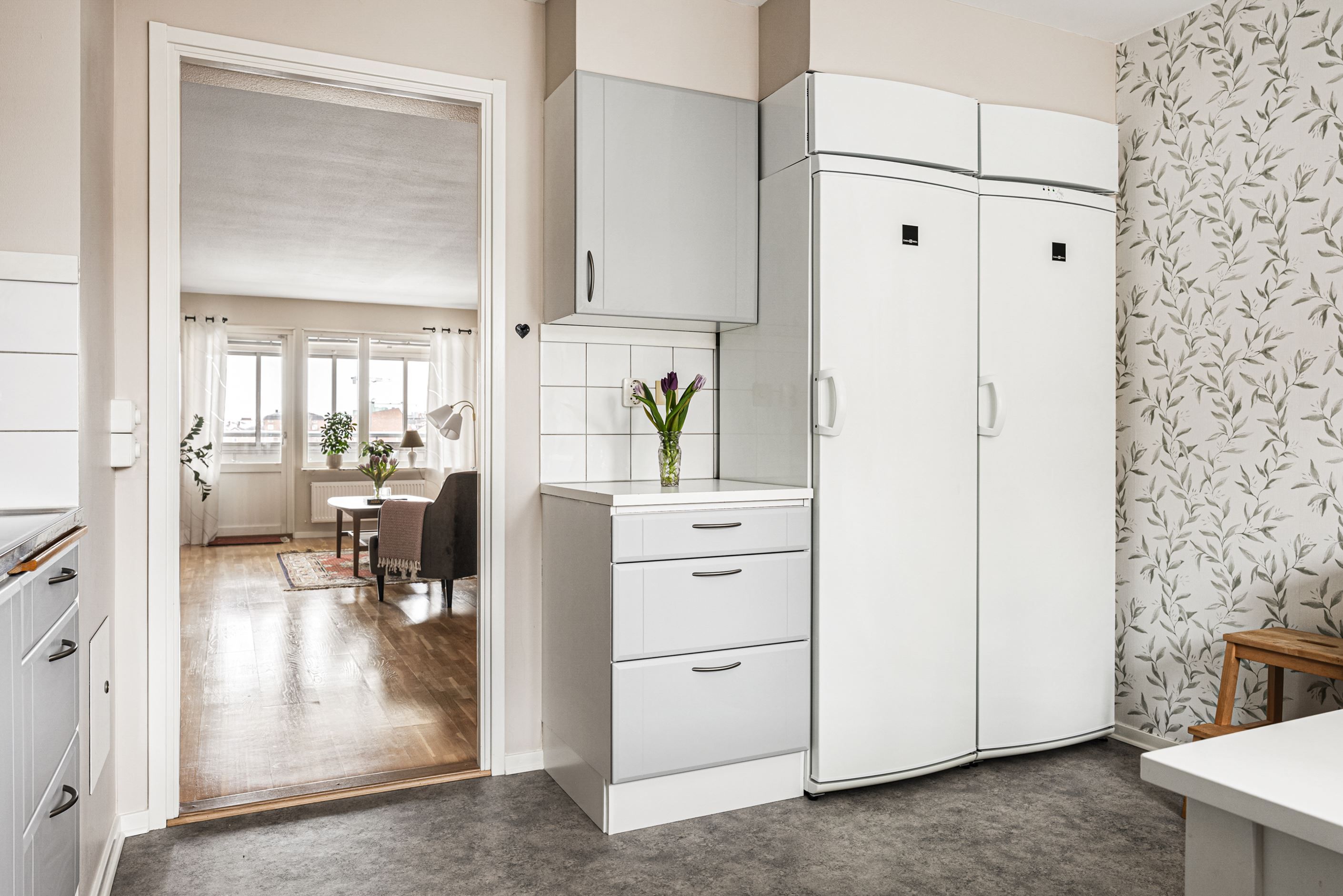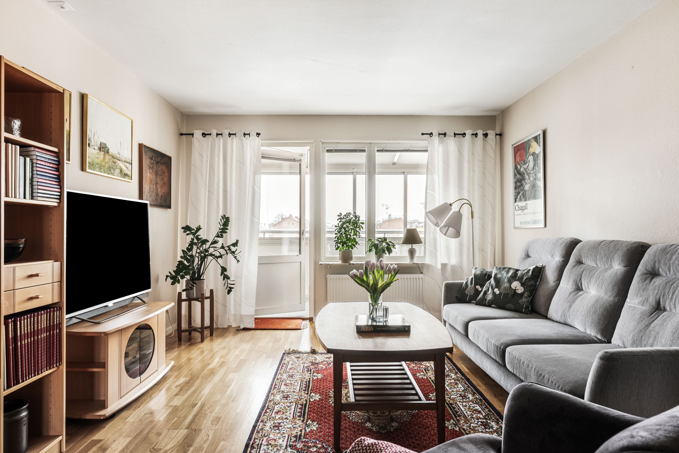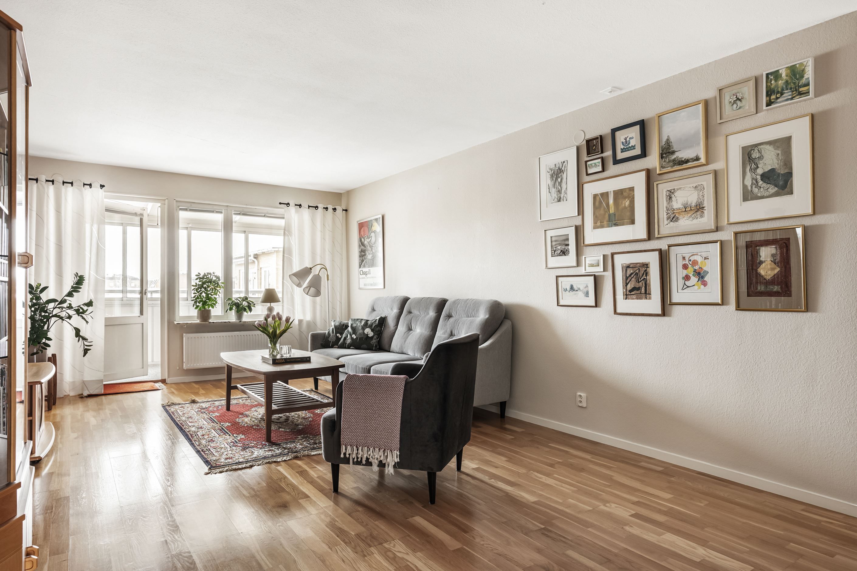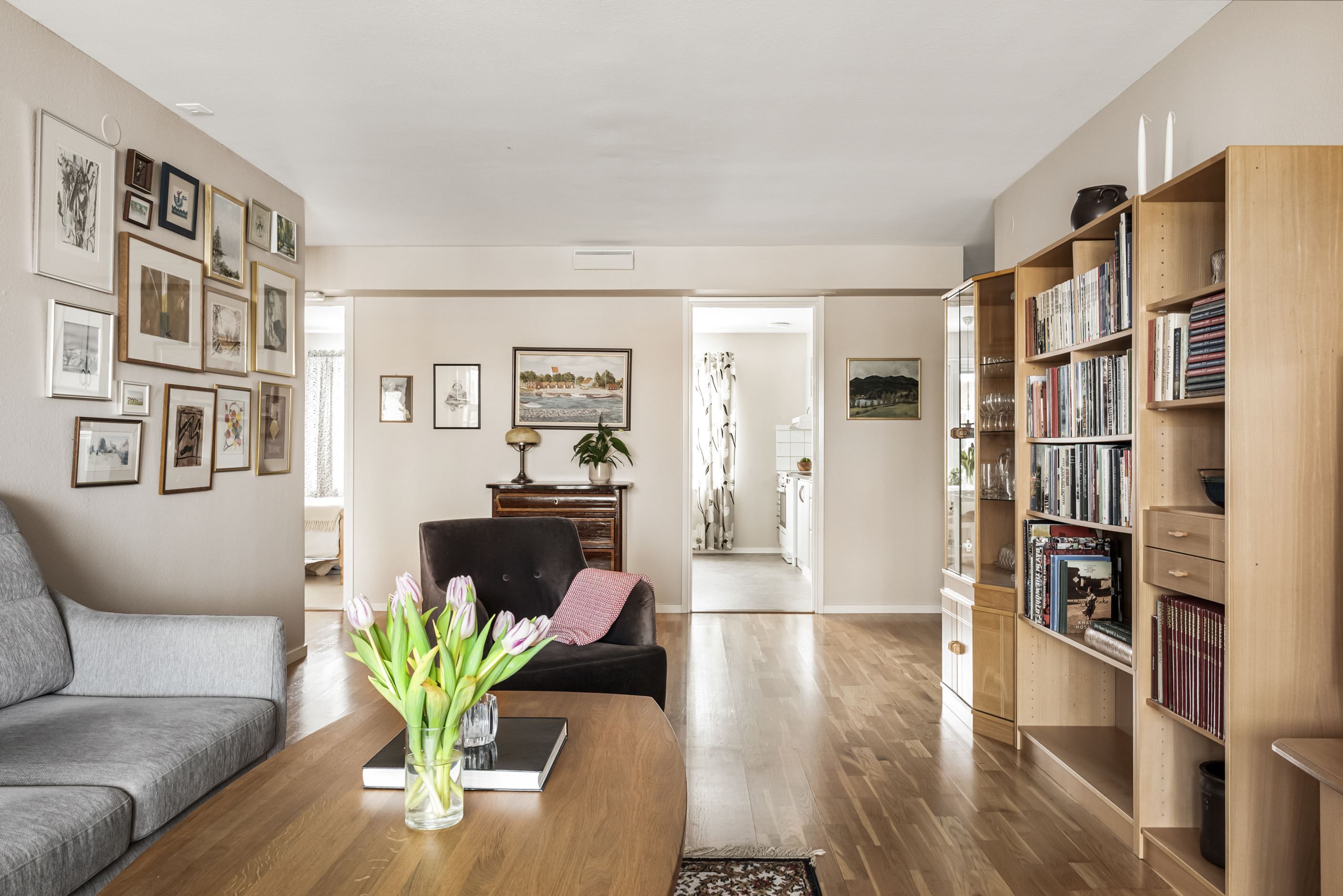 Bostaden är välplanerad och nås smidigt via hiss till våningsplanet. Redan i hallen möts du av generösa ytor och ett välkomnande intryck. Till höger finns ett renoverat badrum utrustat med tvättmaskin som förenklar vardagen. Vardagsrummet är luftigt och lättmöblerat, med utgång till en inglasad balkong som vetter mot föreningens lugna och gröna innergård. Köket är rymligt och erbjuder gott om plats för en större matgrupp. Lägenheten disponeras vidare med två sovrum placerade i varsin del av bostaden, med en praktisk klädkammare emellan.