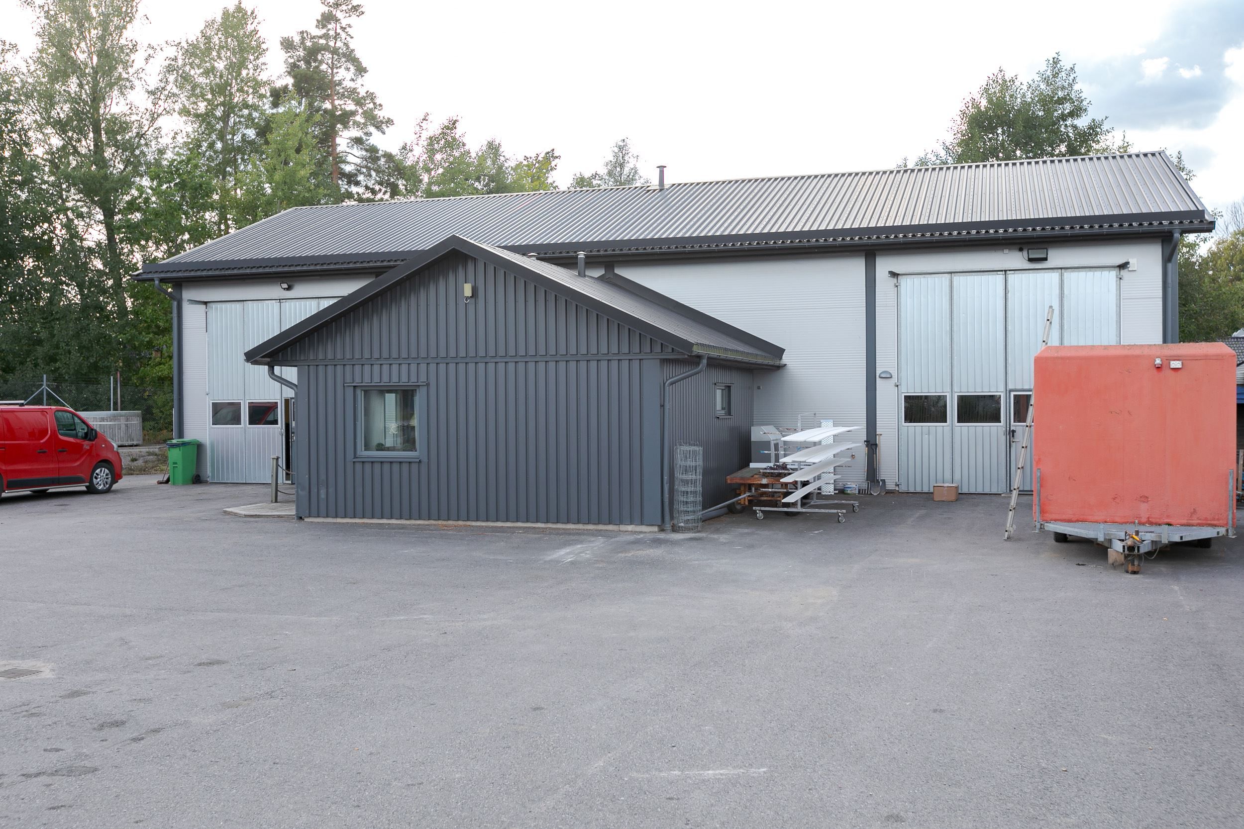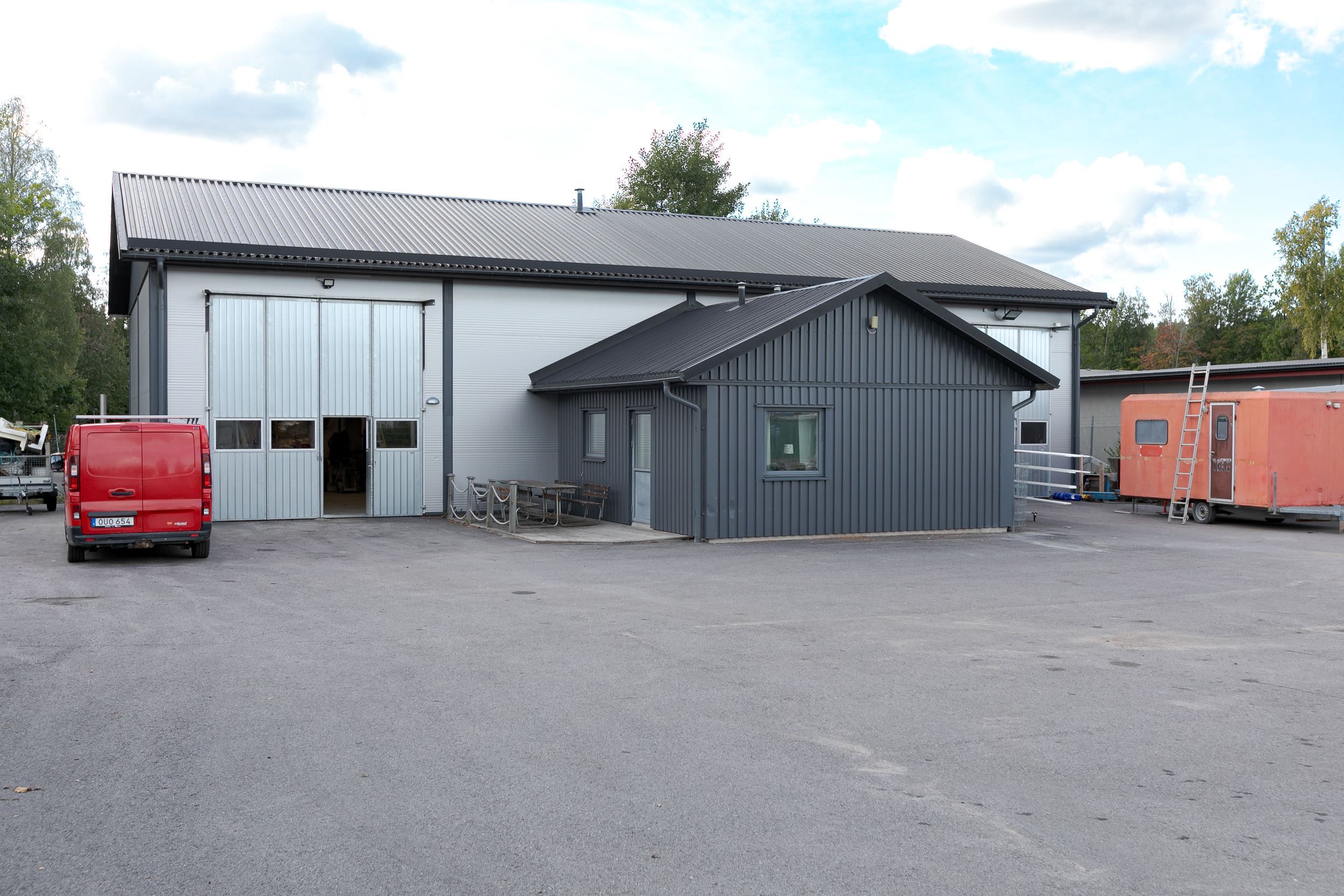 Huvudbyggnad uppförd 2007/2008 i ett våningsplan med mindre entrésolplan. Idag inrymmer fastighet 1 två industrihallar med separat stor port till varje yta och med gemensamma personalytor. Här kan man enkelt anpassa och dela eller om man vill använda hela ytan till en hyresgäst. Planlösningen är god med öppna ytor och takhöjd på ca 4 m. Gemensamt kök, fikarum, Helkaklat omklädningsrum med dusch och toalett samt bastu.