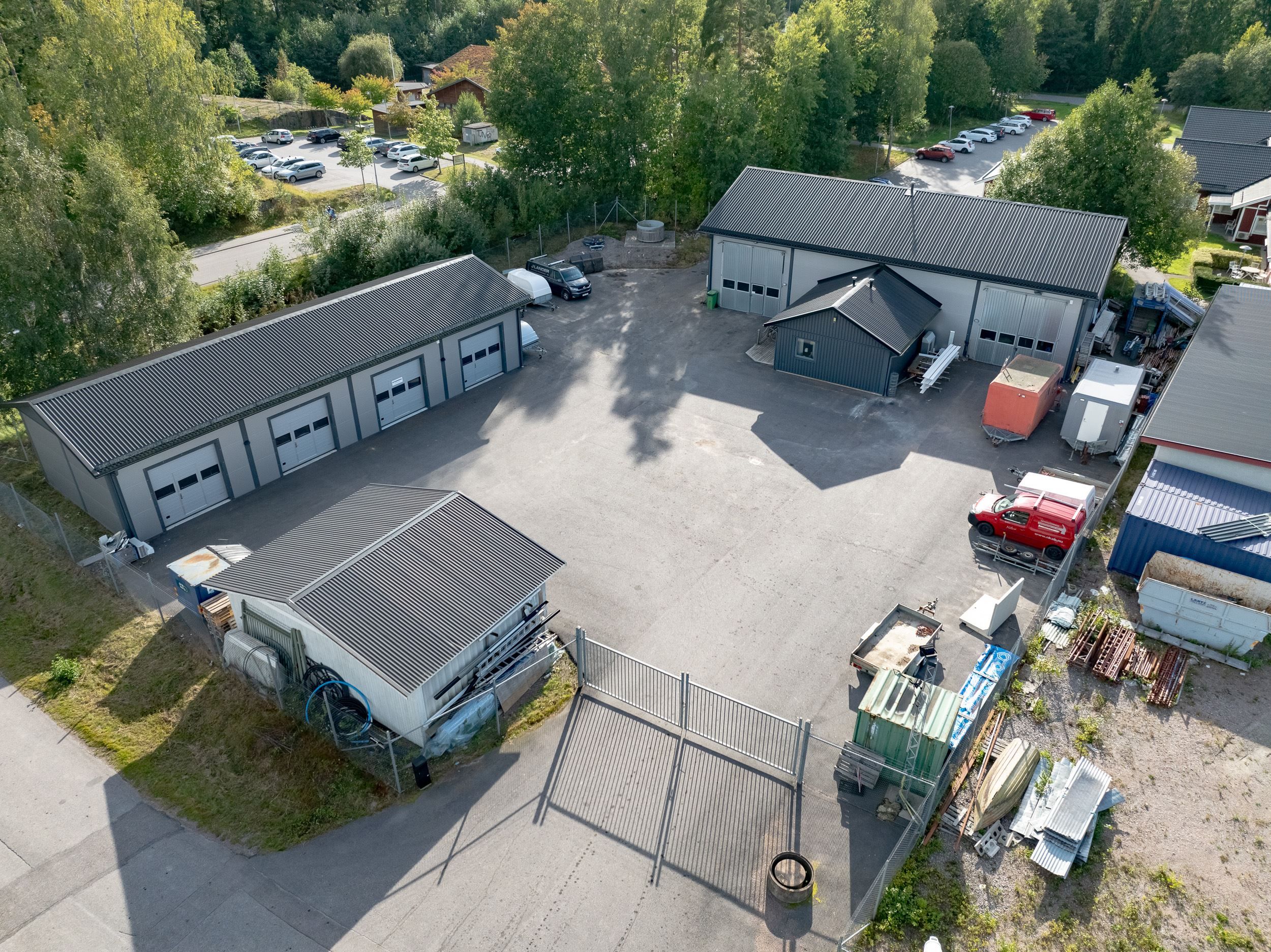 Stor asfalterad gård med gott om plats för uppställning och parkering, inhägnad med staket och grind. Man har under flera perioder hyrt ut plats på gården till olika stora företag. Senast hade man ett långtidskontrakt som genererade 5000:-/mån men är vakant sedan någon månad tillbaka.