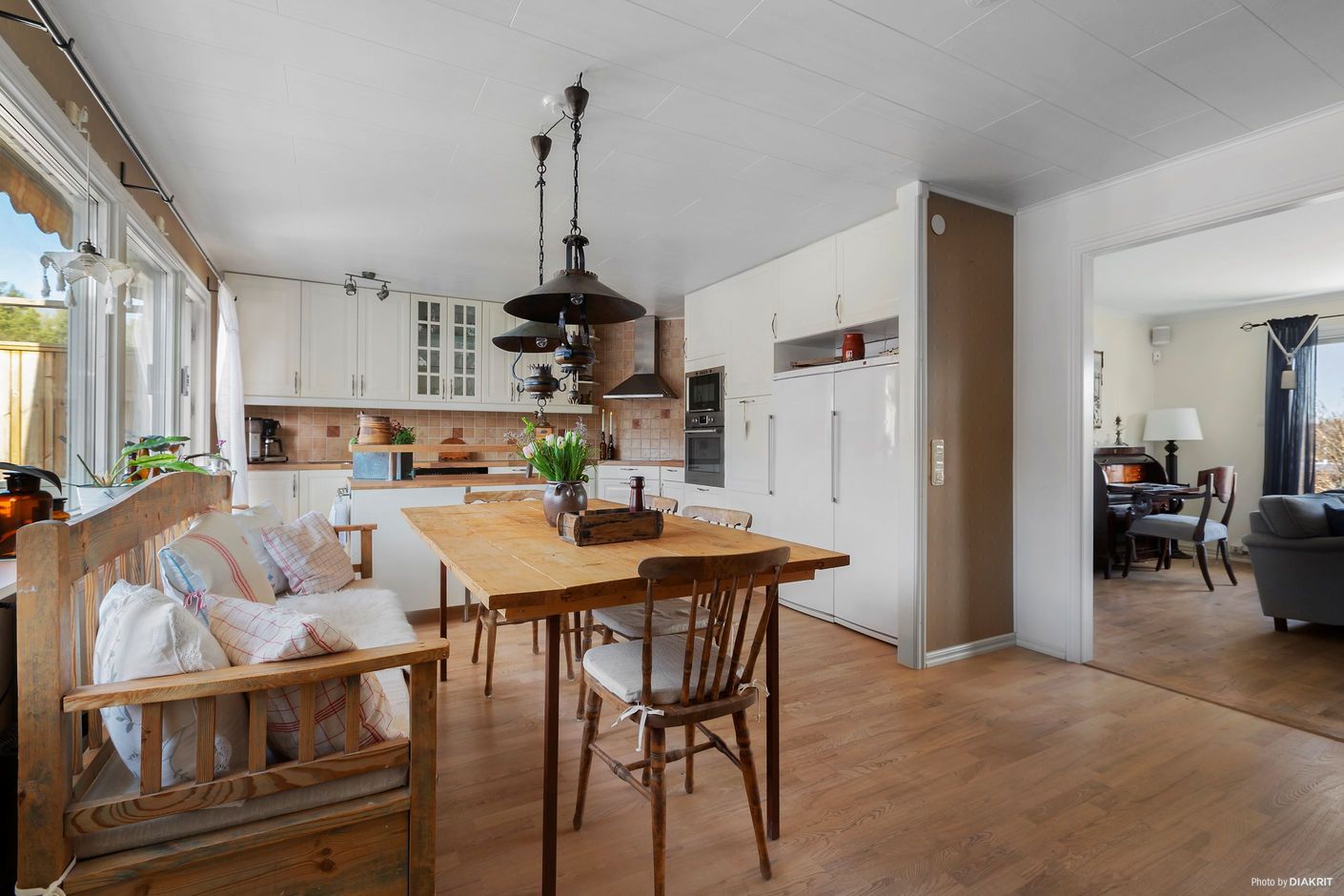 Ombyggt kök med stor matplats i öppen planlösning med vardagsrummet