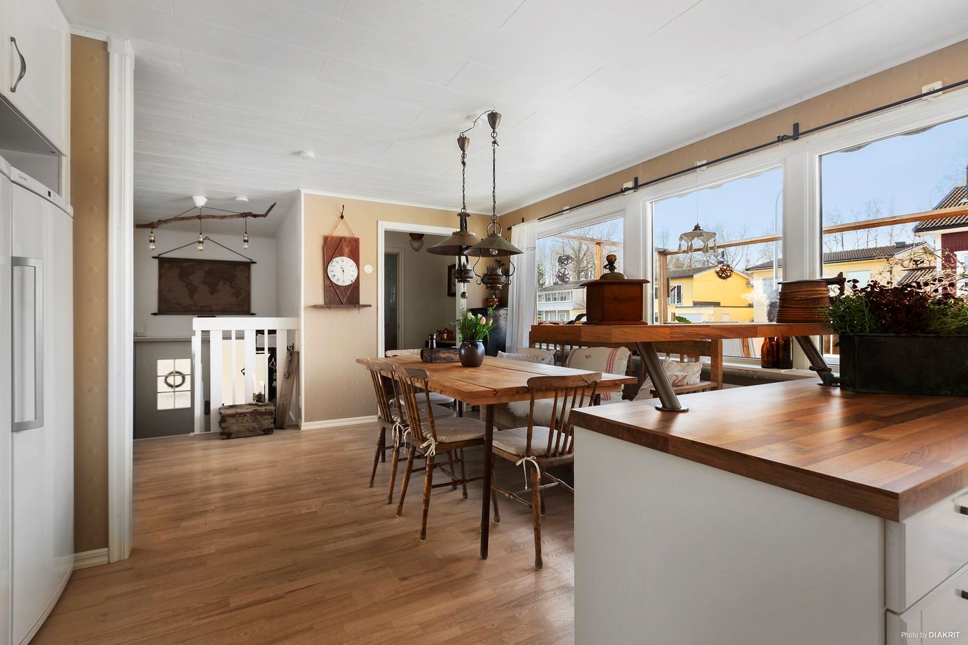 Entréplanet erbjuder ett rymligt och välutrustat kök med matplats i öppen planlösning, perfekt för såväl vardagens måltider som större middagar med familj och vänner. Intill ligger det ljusa vardagsrummet med stora perspektivfönster som skänker ett härligt ljusinsläpp och fin kontakt med grönskan utanför.