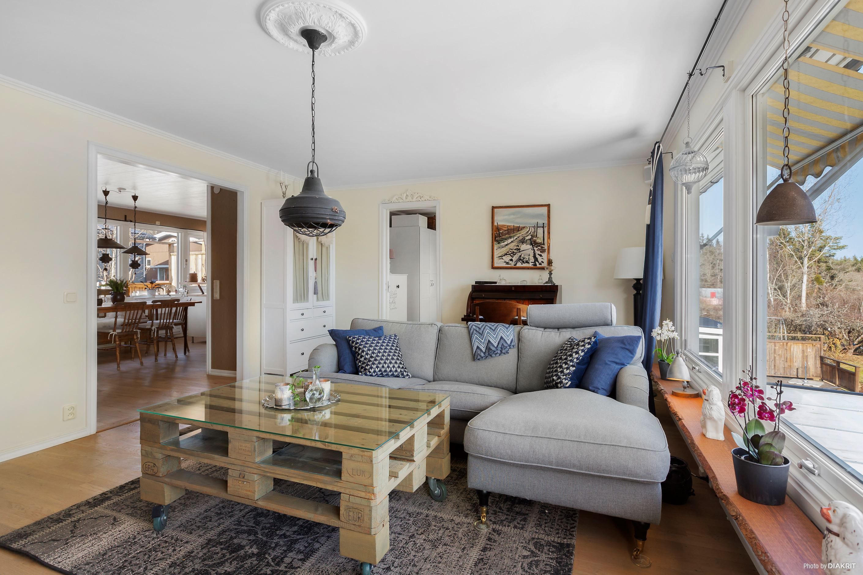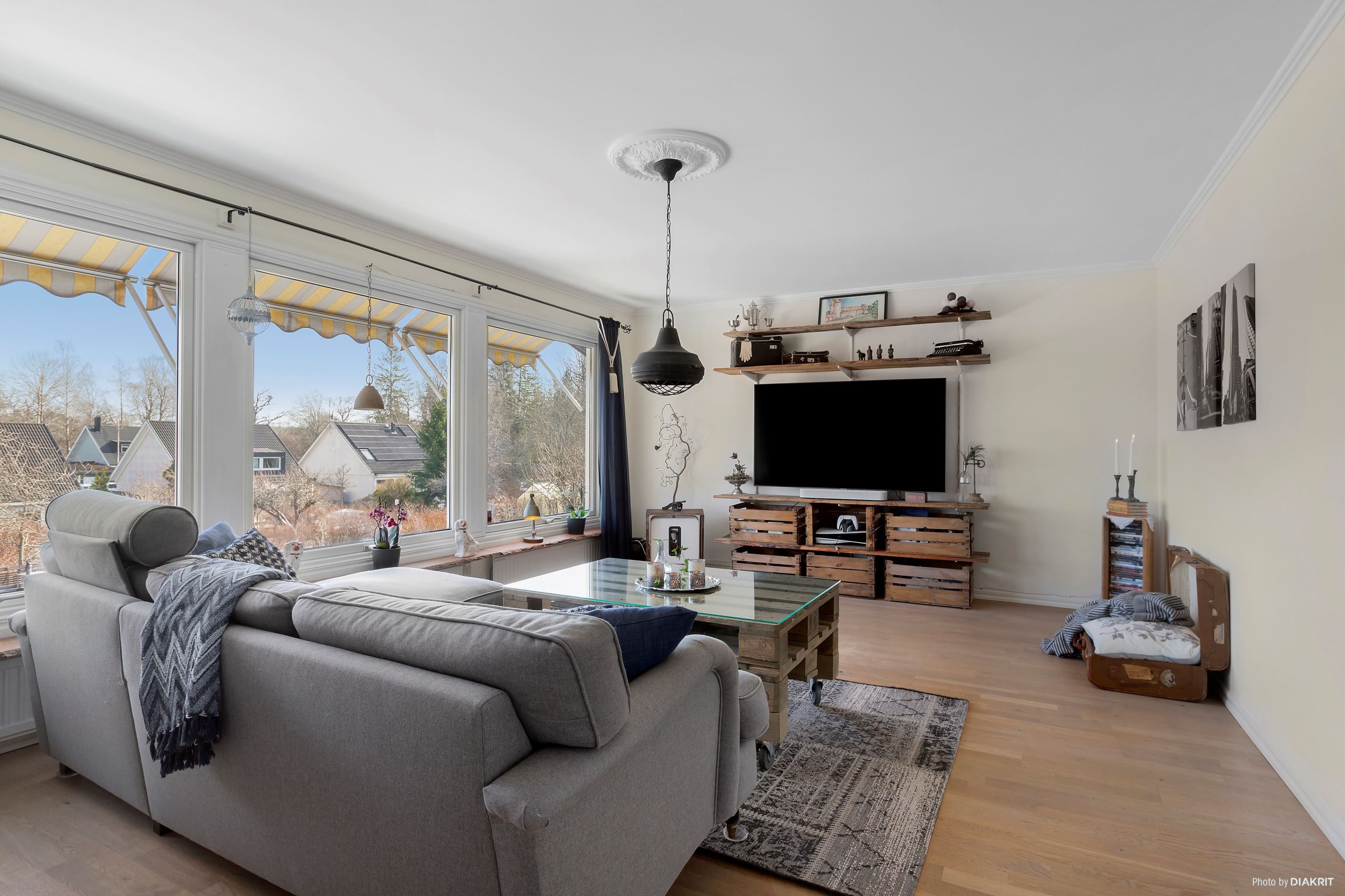 Ljust vardagsrum med stora perspektivfönster och utan insyn