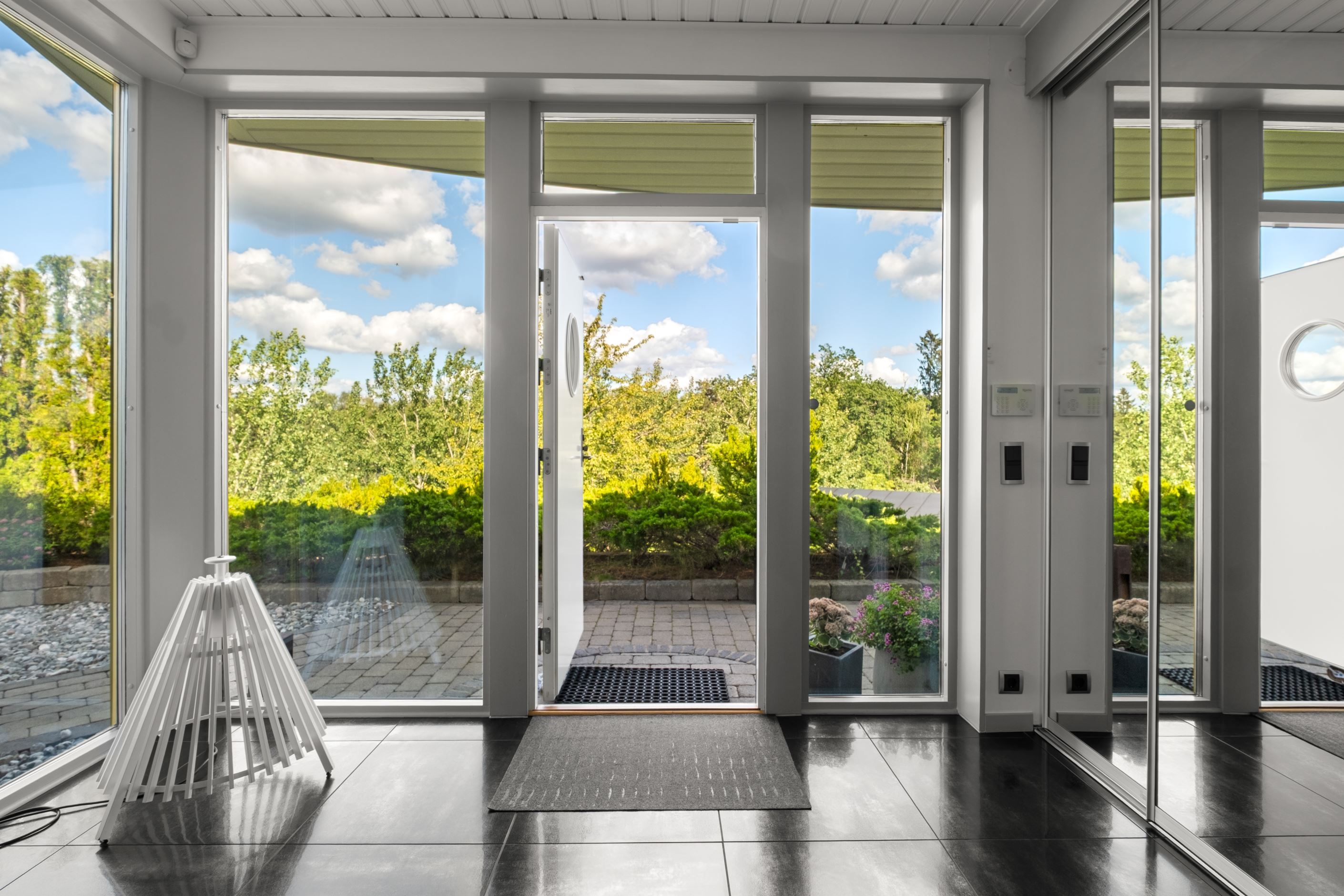 Utomhusmiljön är skapad för livskvalitet – en skyddad terrass med uterum och pool bildar en privat oas för såväl avkoppling som sociala tillställningar.