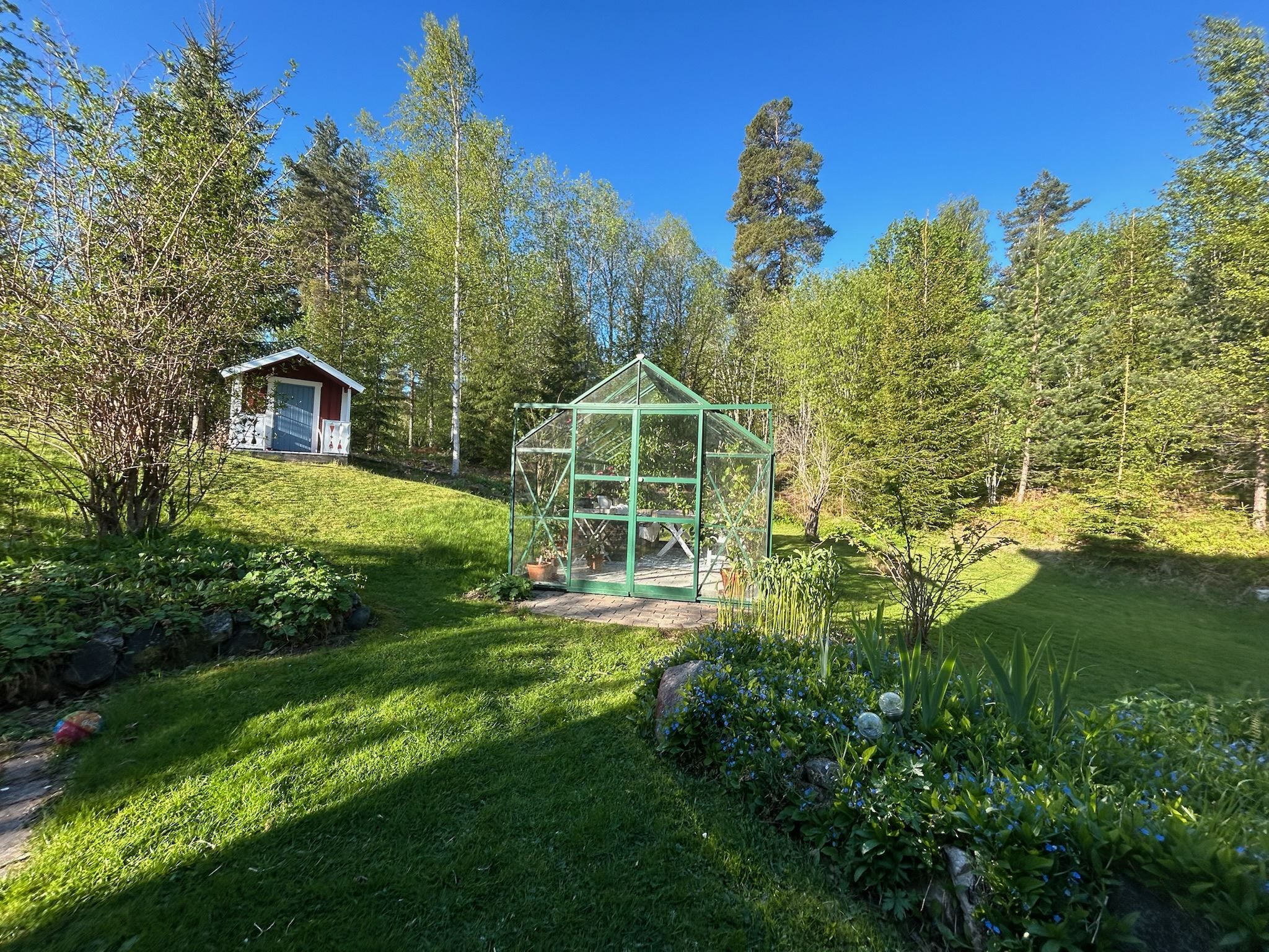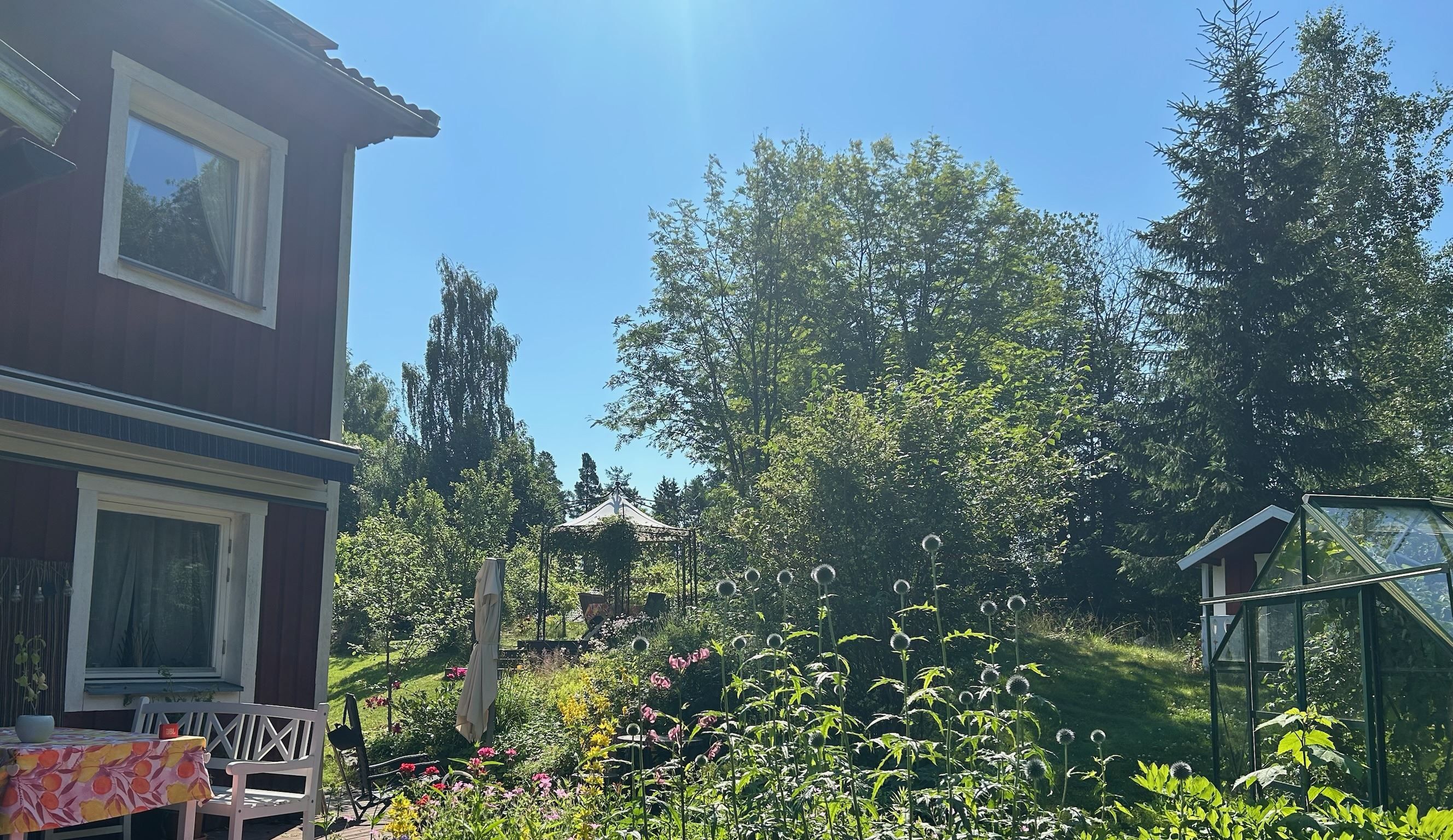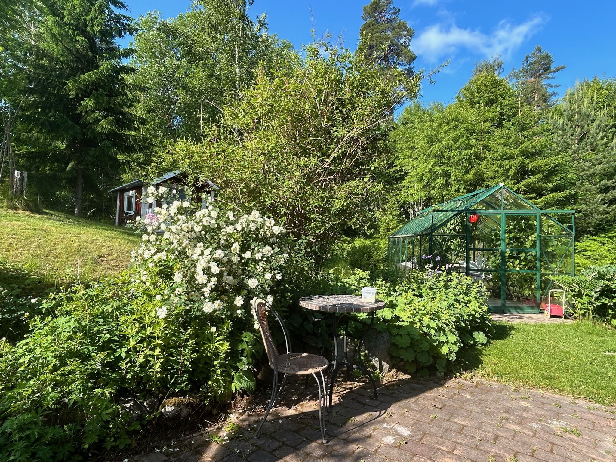 Till fastigheten hör både garage och carport, vilket ger smidiga parkeringsmöjligheter året om. För den odlingsintresserade finns även ett växthus som förlänger trädgårdssäsongen och skapar möjligheter till egen skörd. Här inne tillbringar du även sensommarkvällar och njuter av frukt från persikoträdet och vinrankan.