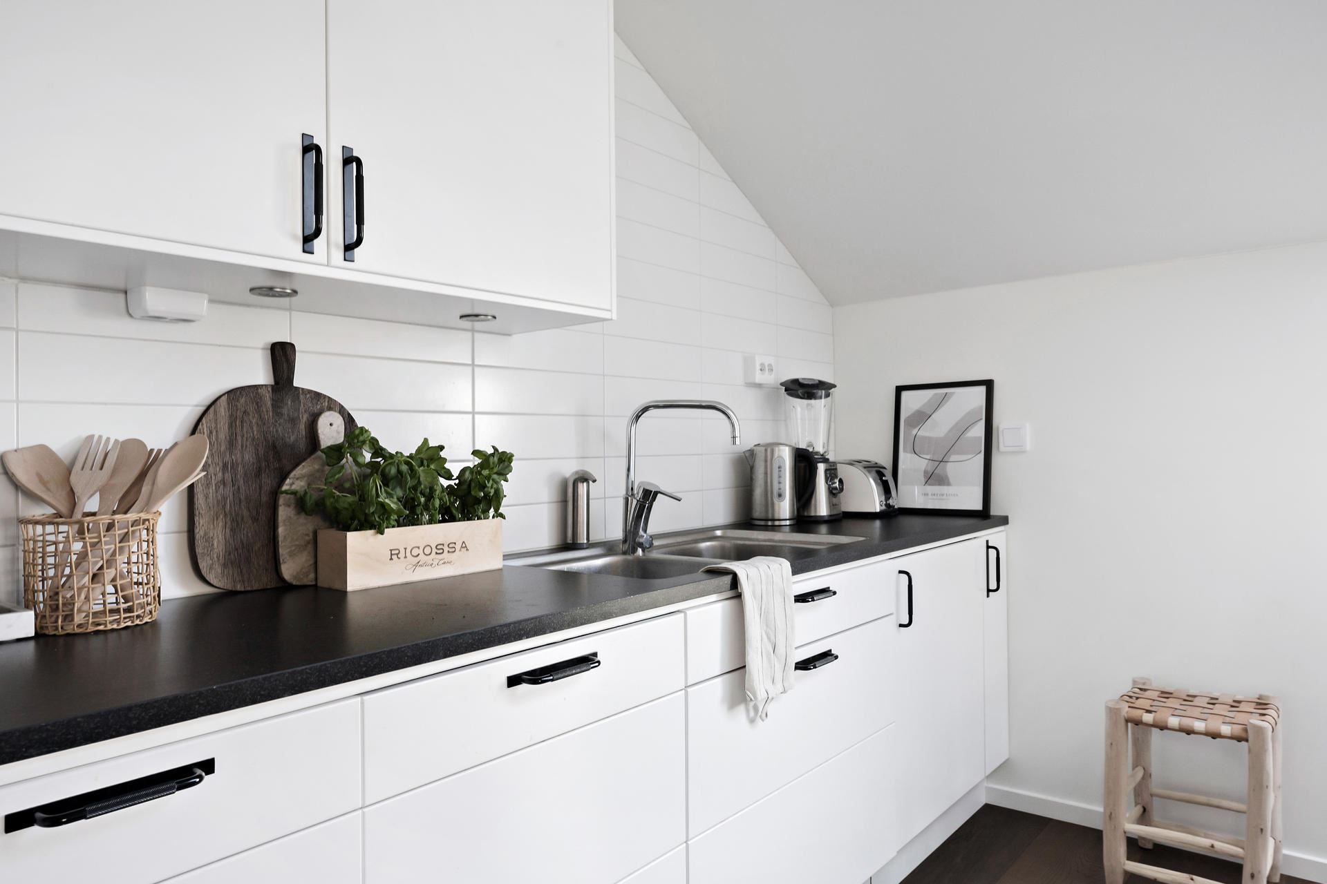 Belysning: Infällda LED-spottar under väggskåp. Dimbara spotlights i tak.